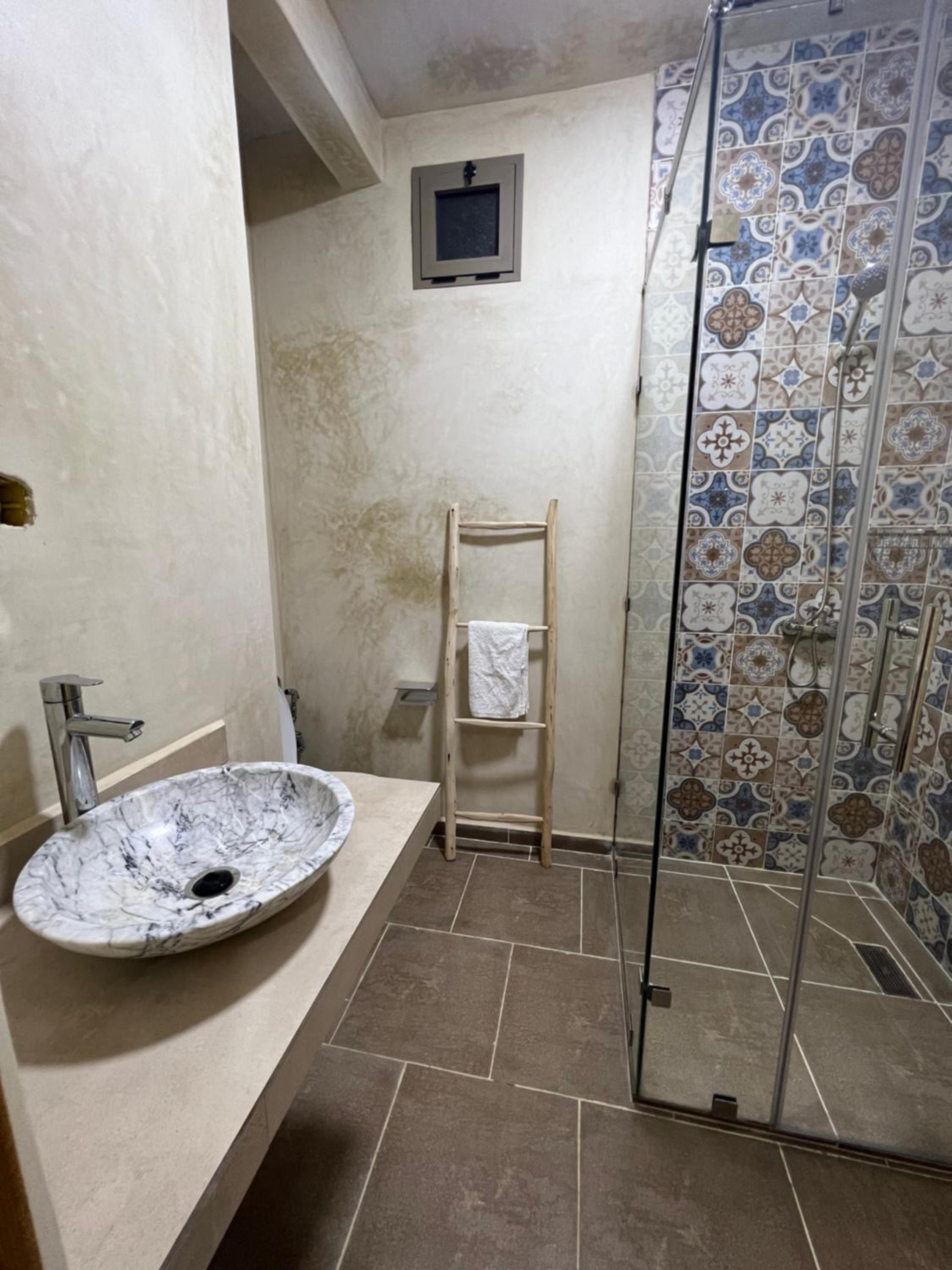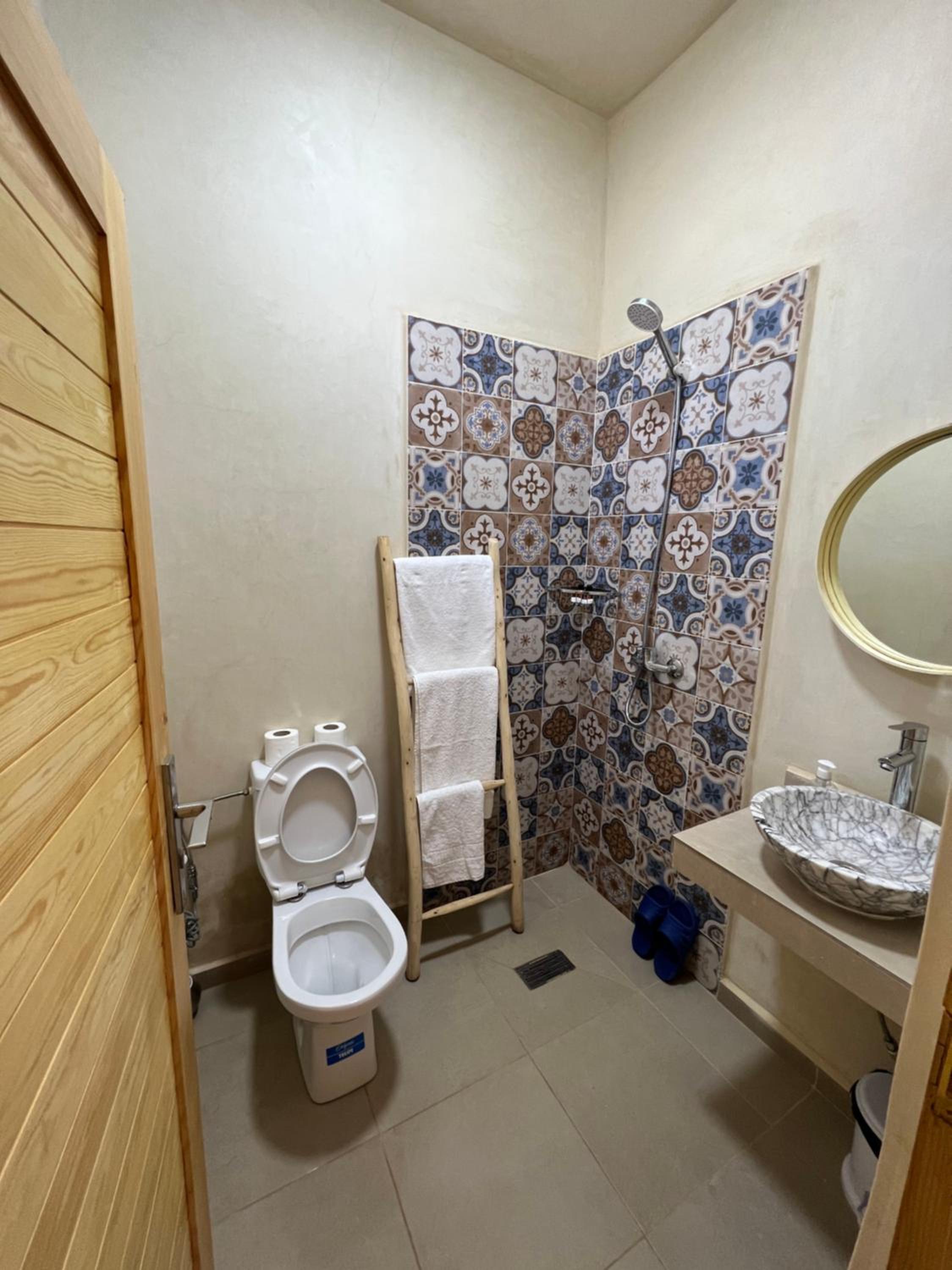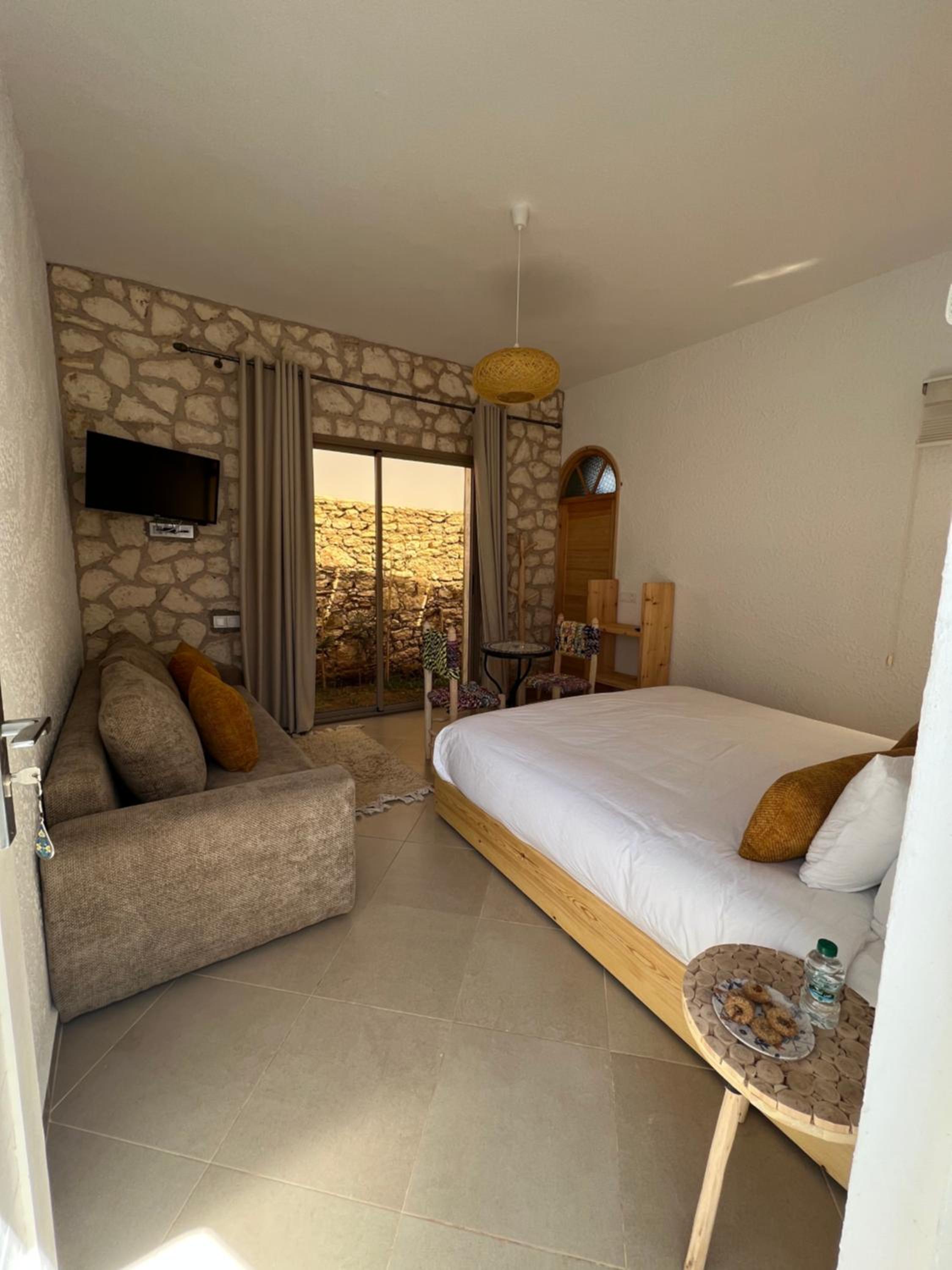 Ubicación muy tranquila, a solo 8 minutos andando del pueblo, la playa y los restaurantes. Ofrecen desayuno por 50 dh por persona, correcto, aunque hay que avisar el día anterior si se desea. La zona de la piscina es absolutamente hermosa y relajante, al igual que las habitaciones, muy cuidadas y silenciosas. El personal es amable y discreto, lo que hace la estancia muy agradable. Cama comodísima, ducha correcta aunque el agua es templada y no llega a salir caliente como tal.