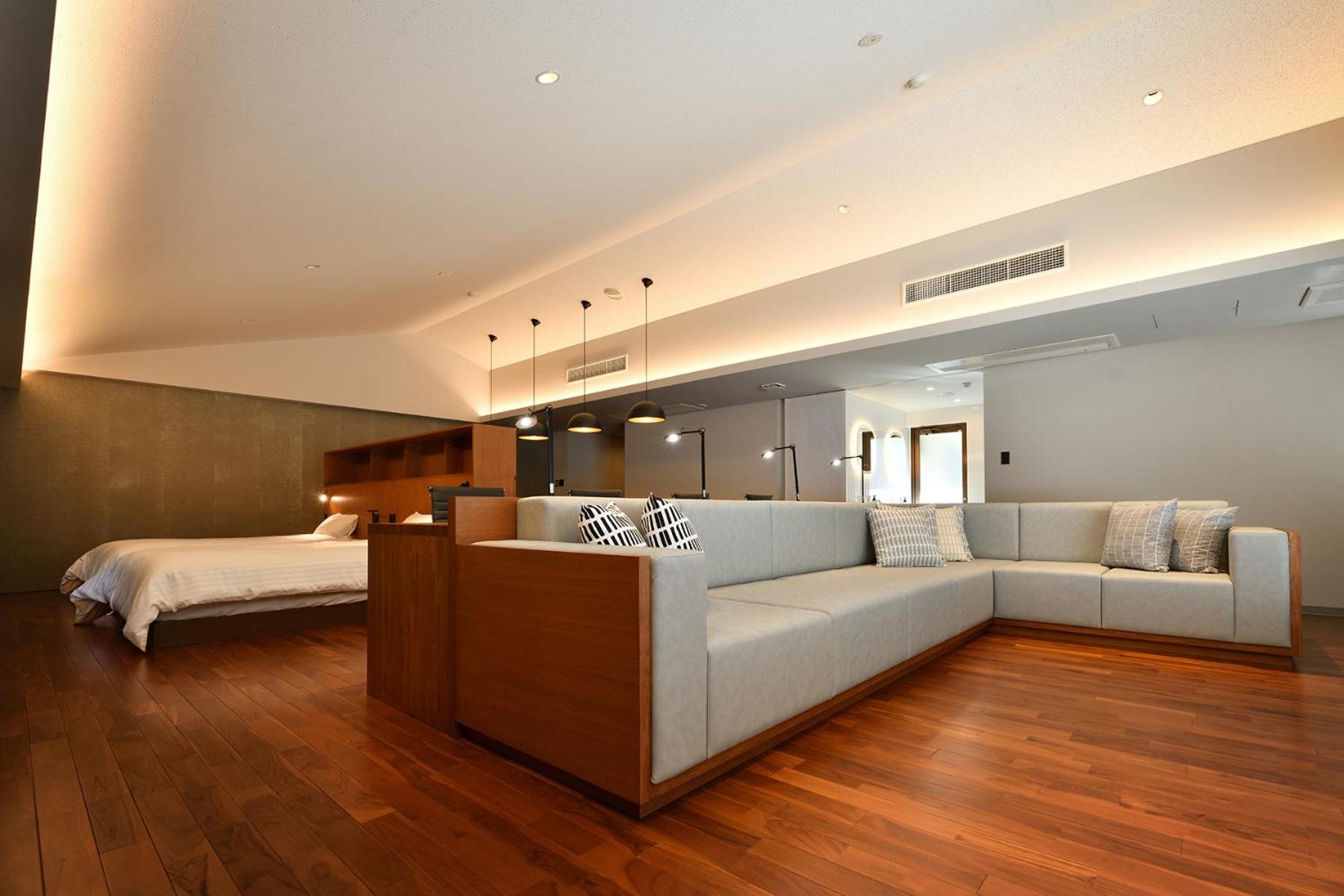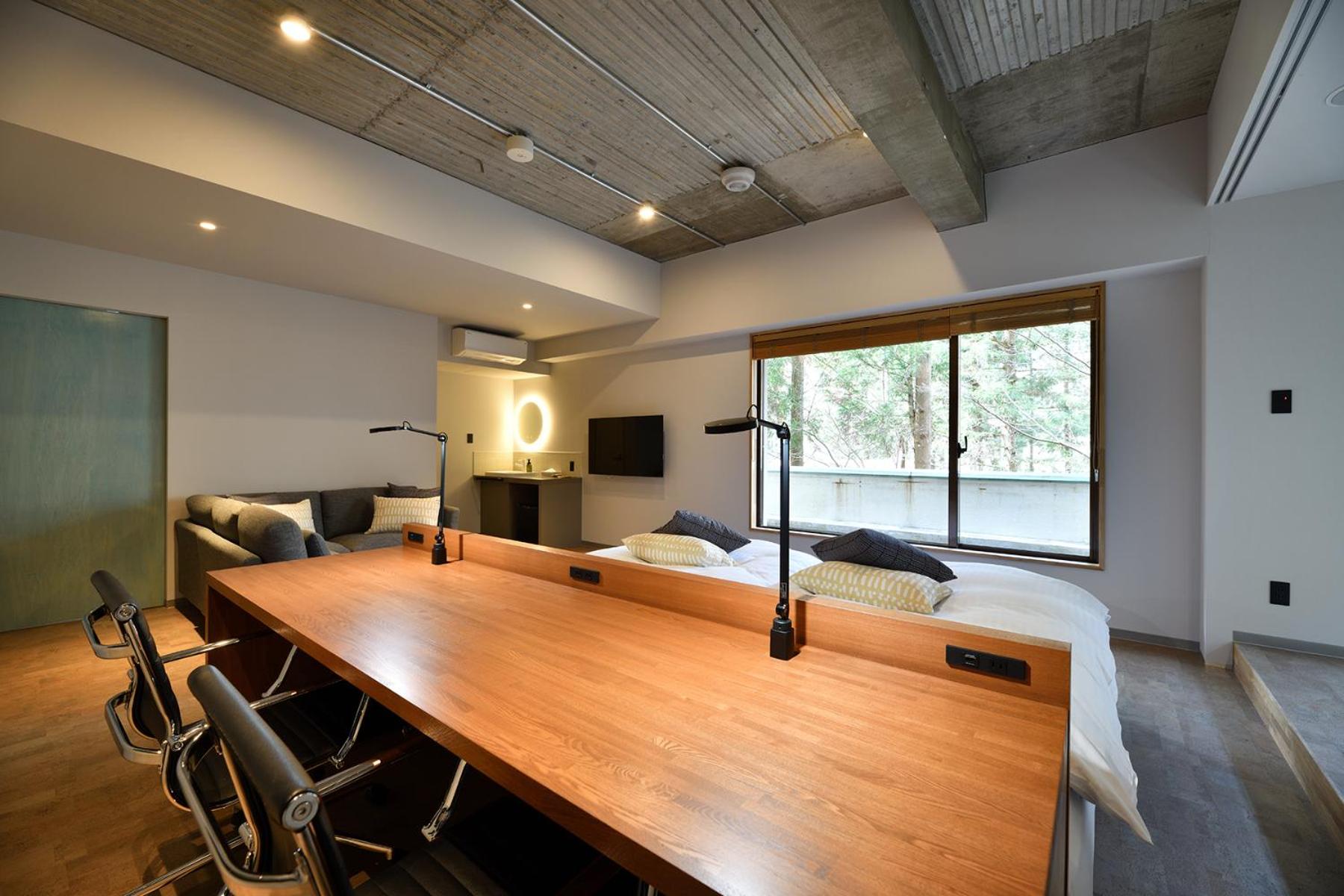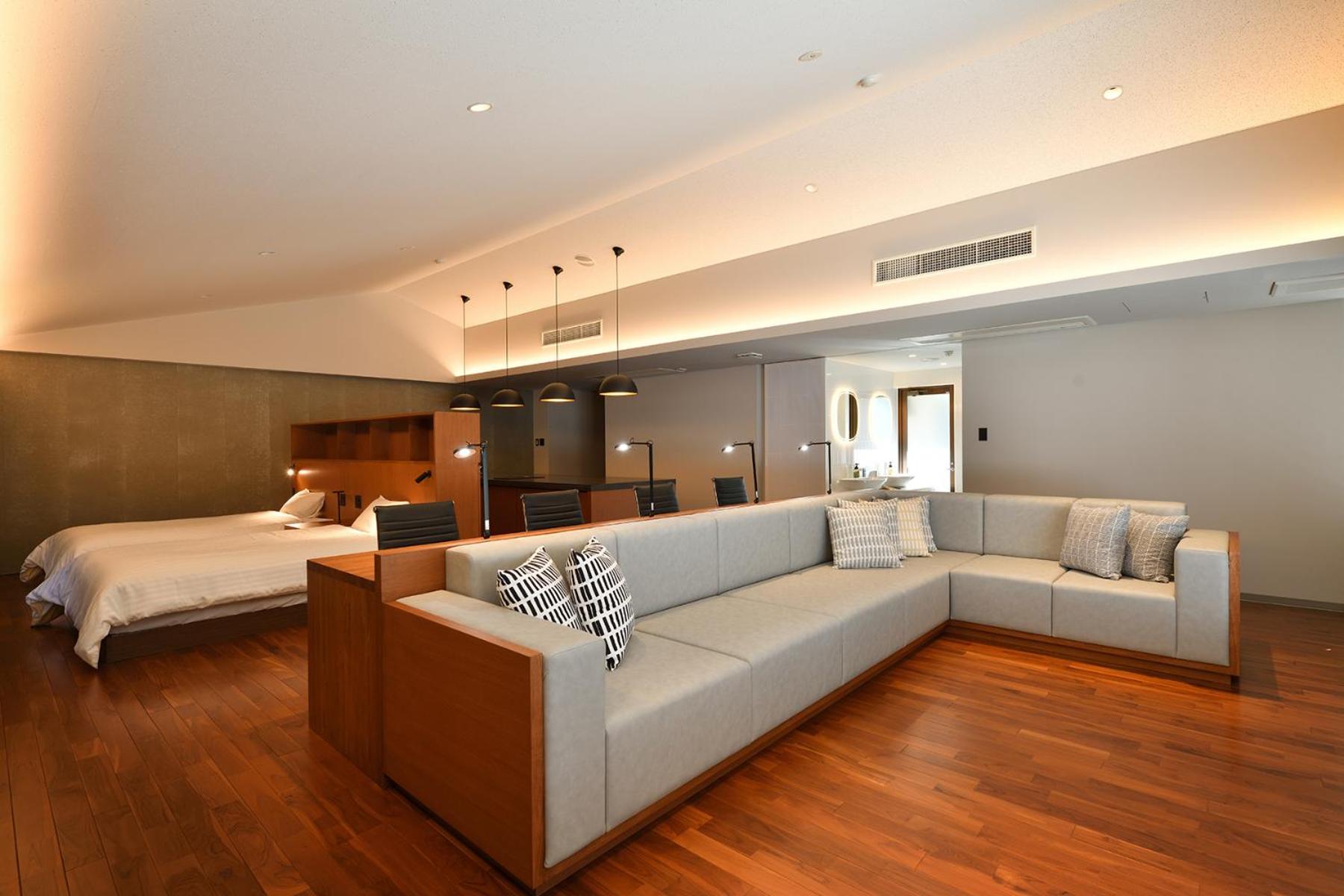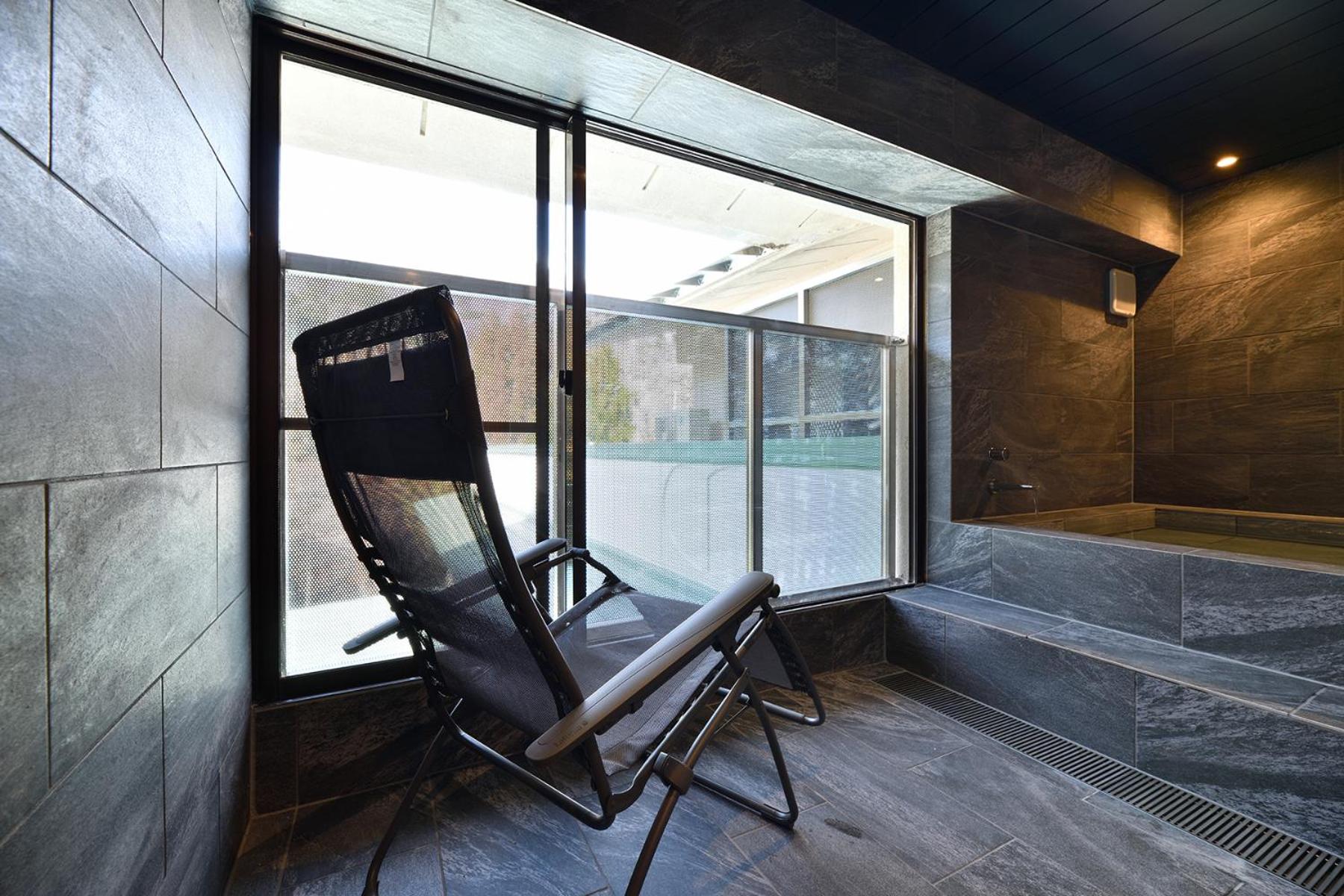The spacious living and private onsen in the room