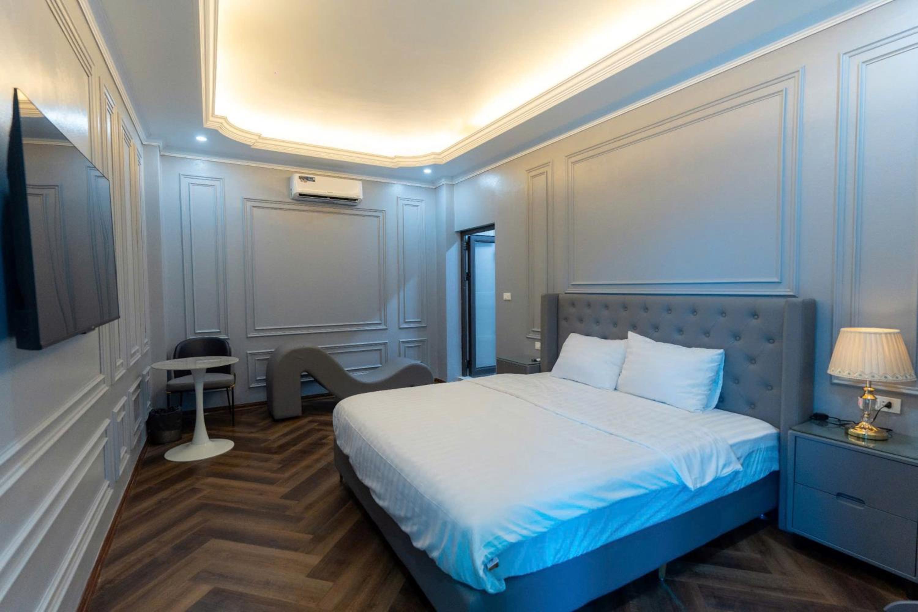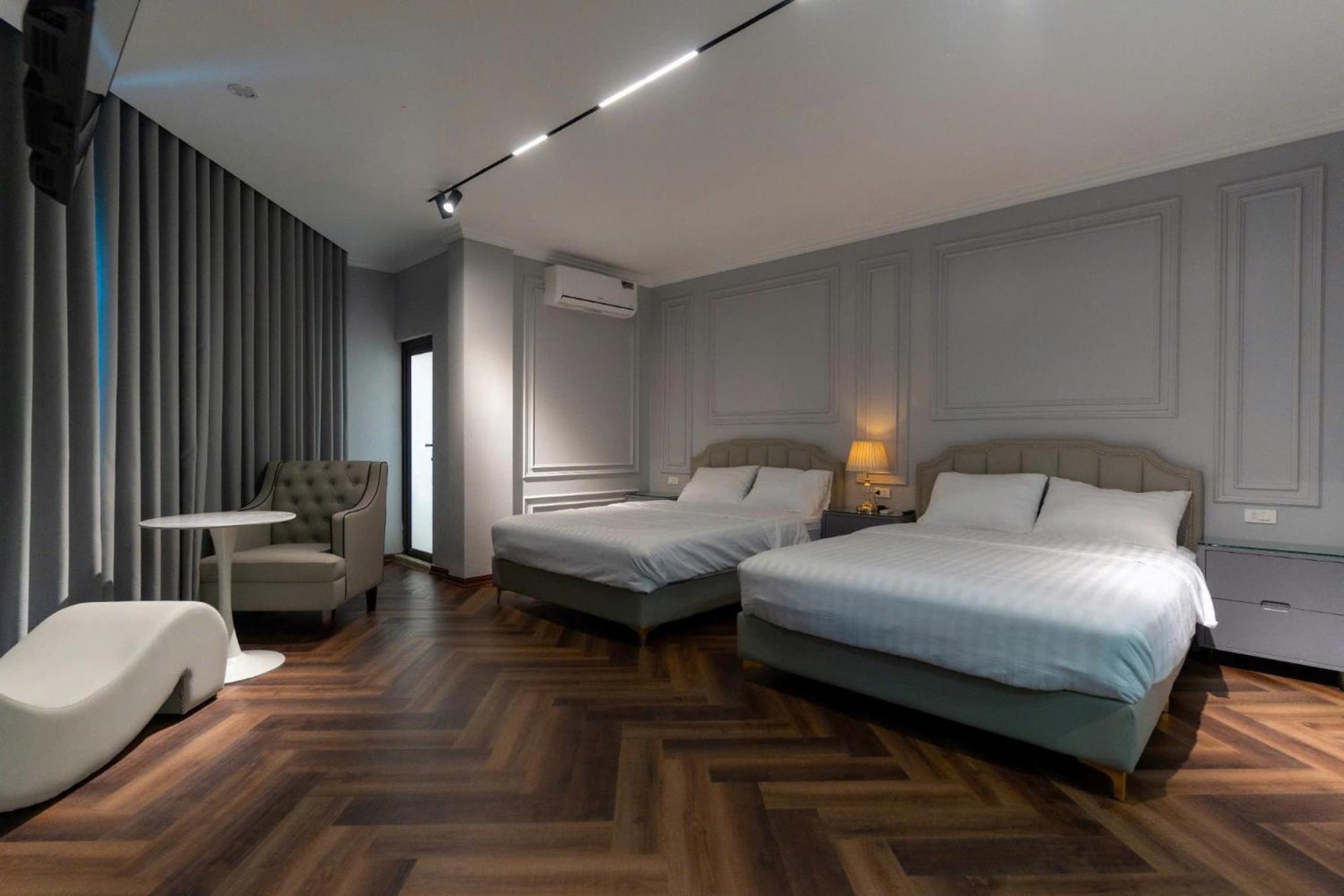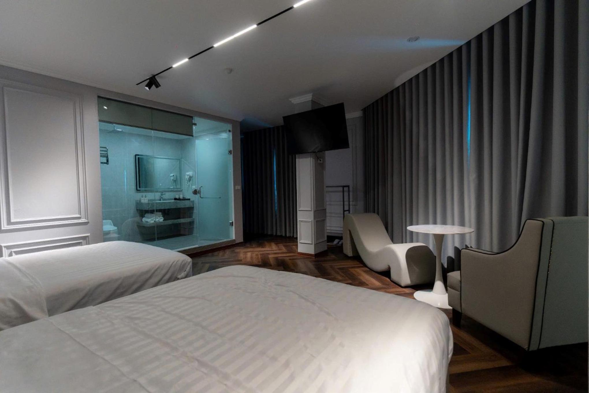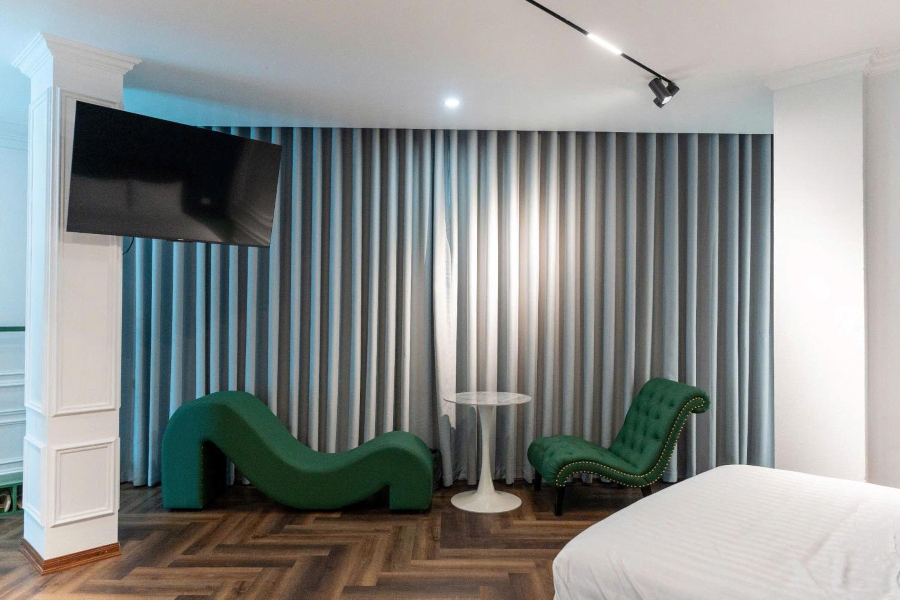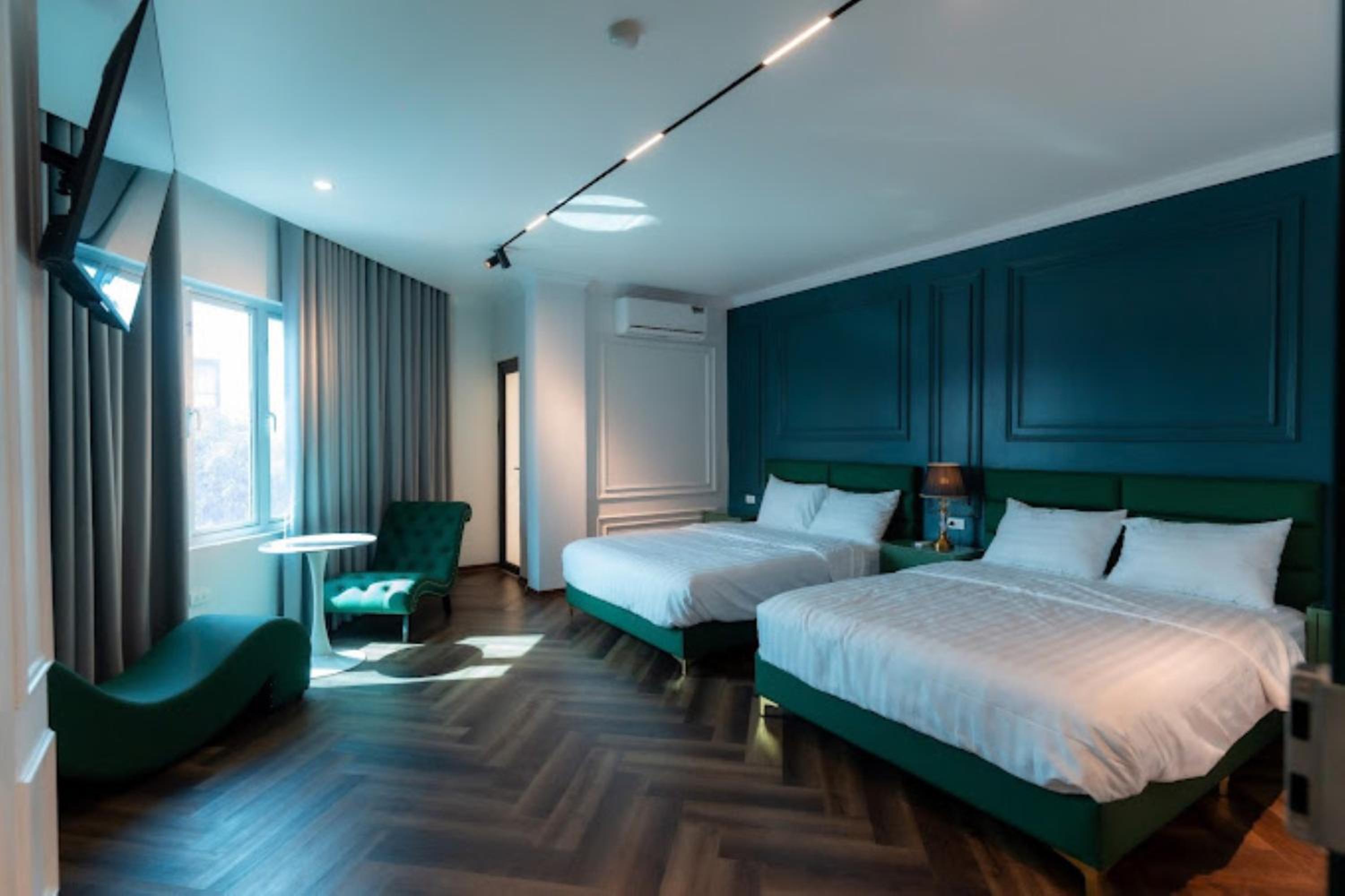 Each room at our hotel is thoughtfully equipped with a wardrobe, flat-screen TV, and modern amenities for a comfortable stay.