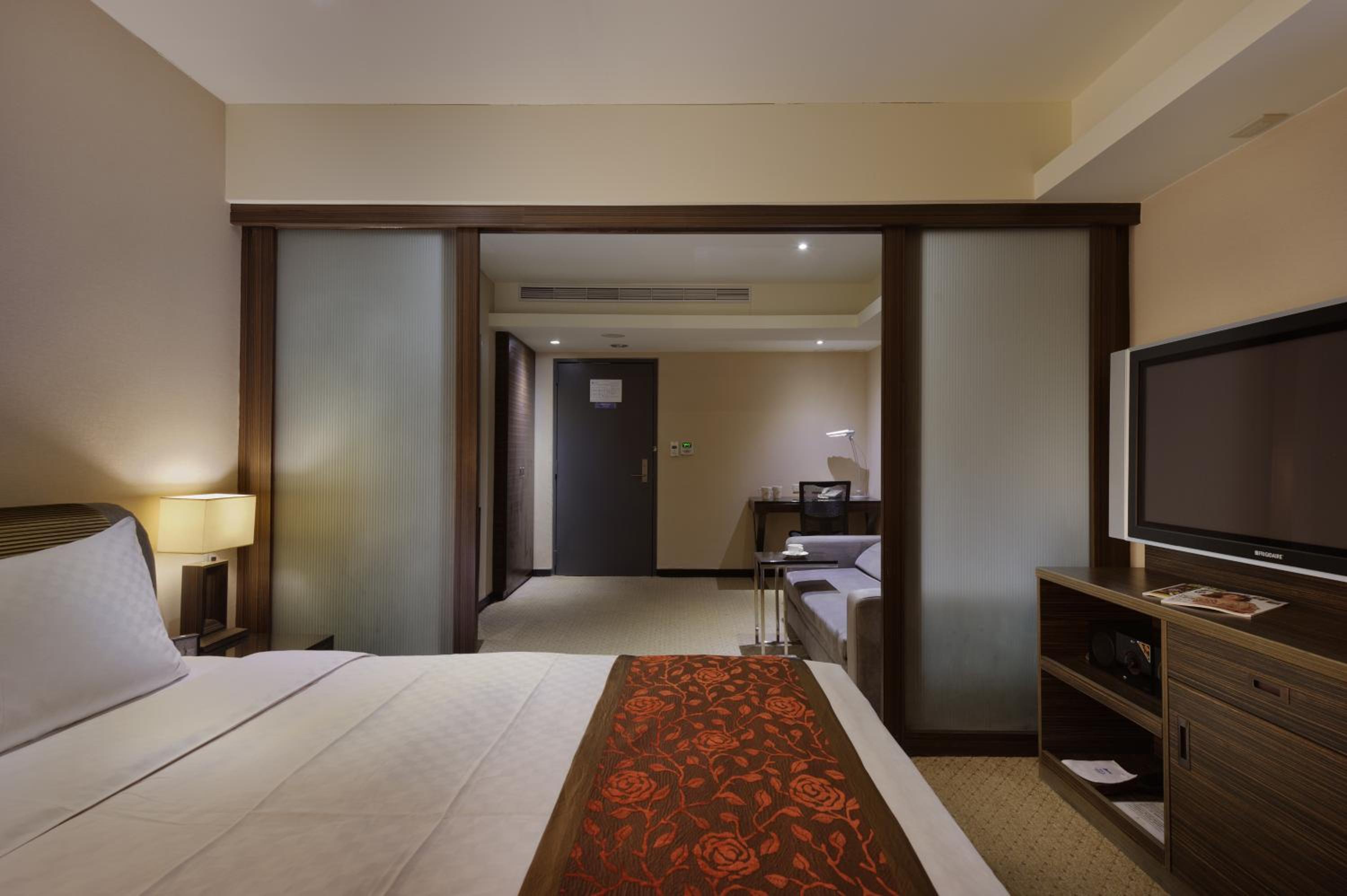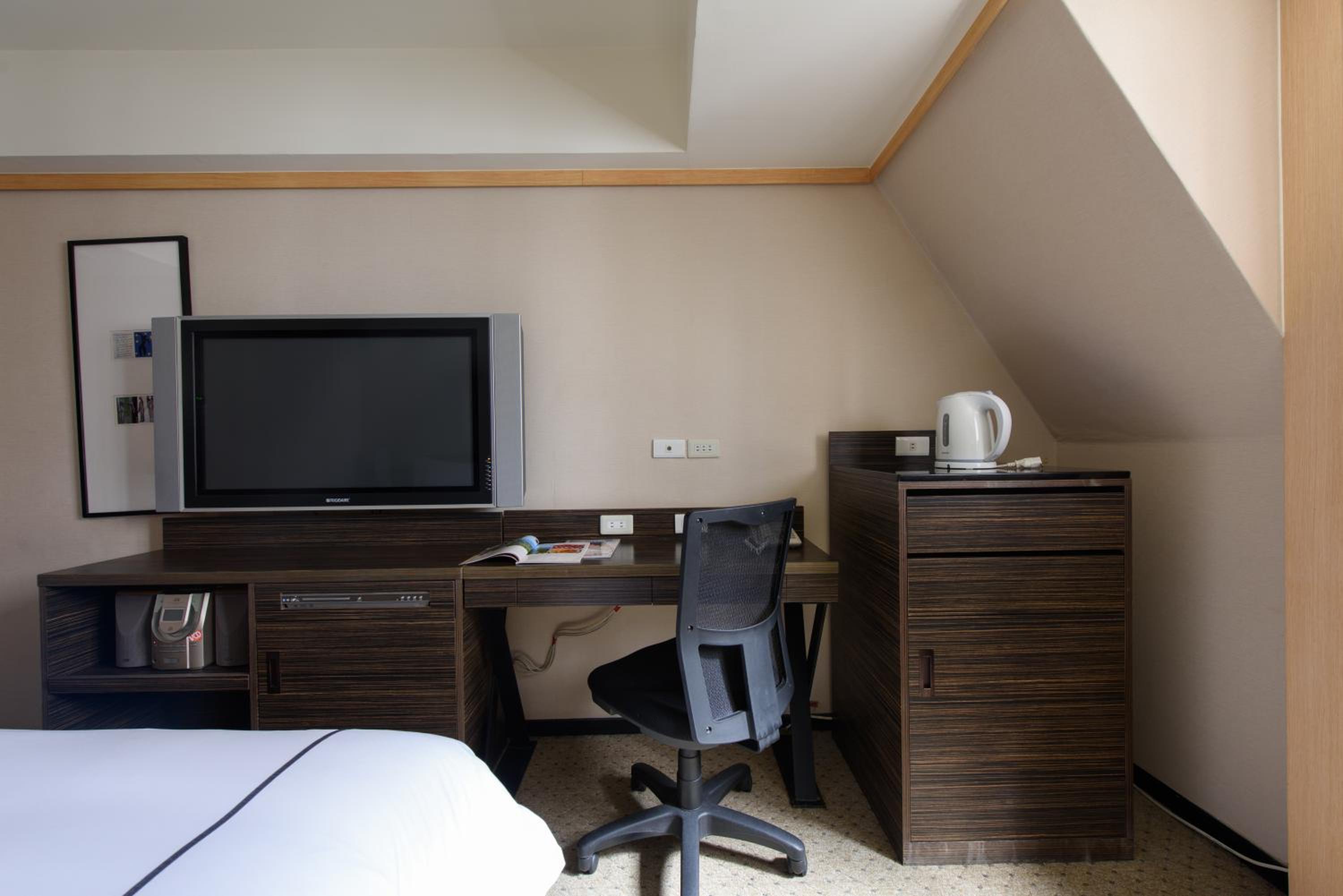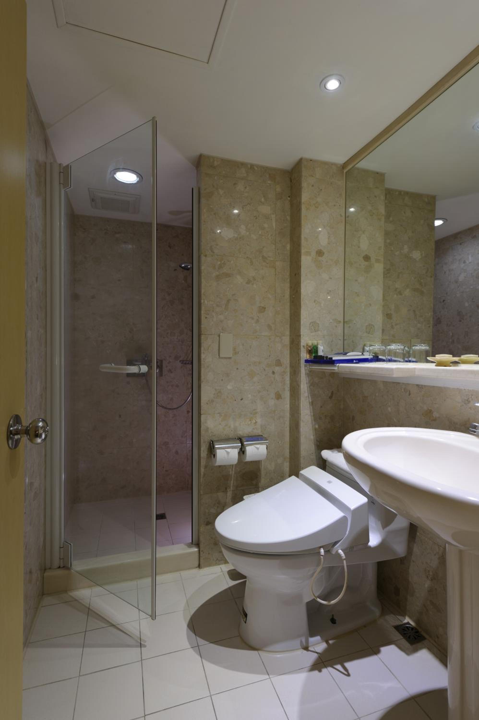 Each guest room at K Hotel Taipei is equipped with modern amenities including air conditioning, flat-screen TV, and a private bathroom with complimentary toiletries and bathrobes.