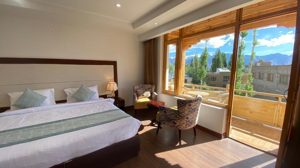Very clean spacious rooms. Amazing staff (shout out to manager Naman, and head waiter Ravi). Nothing was too much trouble. We ended up staying for a week after our son got altitude sickness. The guys had oxygen on hand, and knew exactly what to do. In house food is amazing. Location a short walk to main bazaar, but very quiet with views to Stok Kangri.