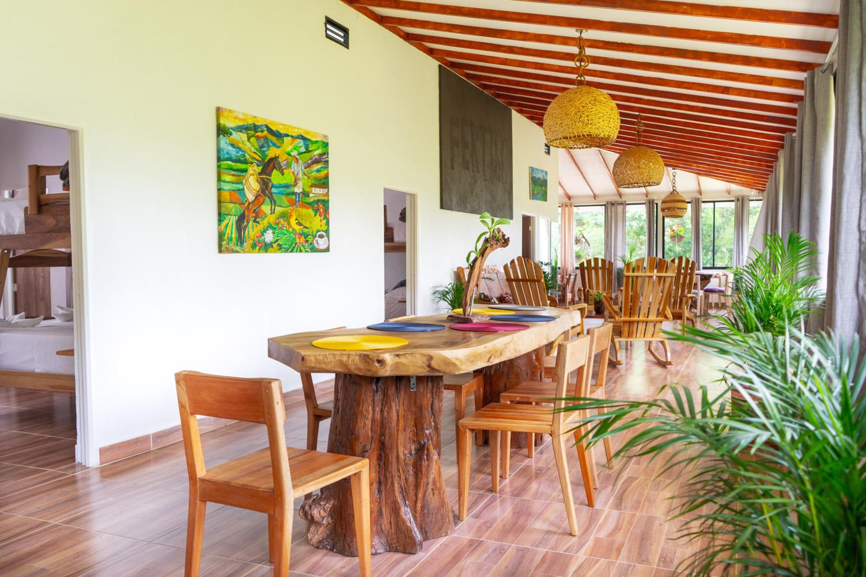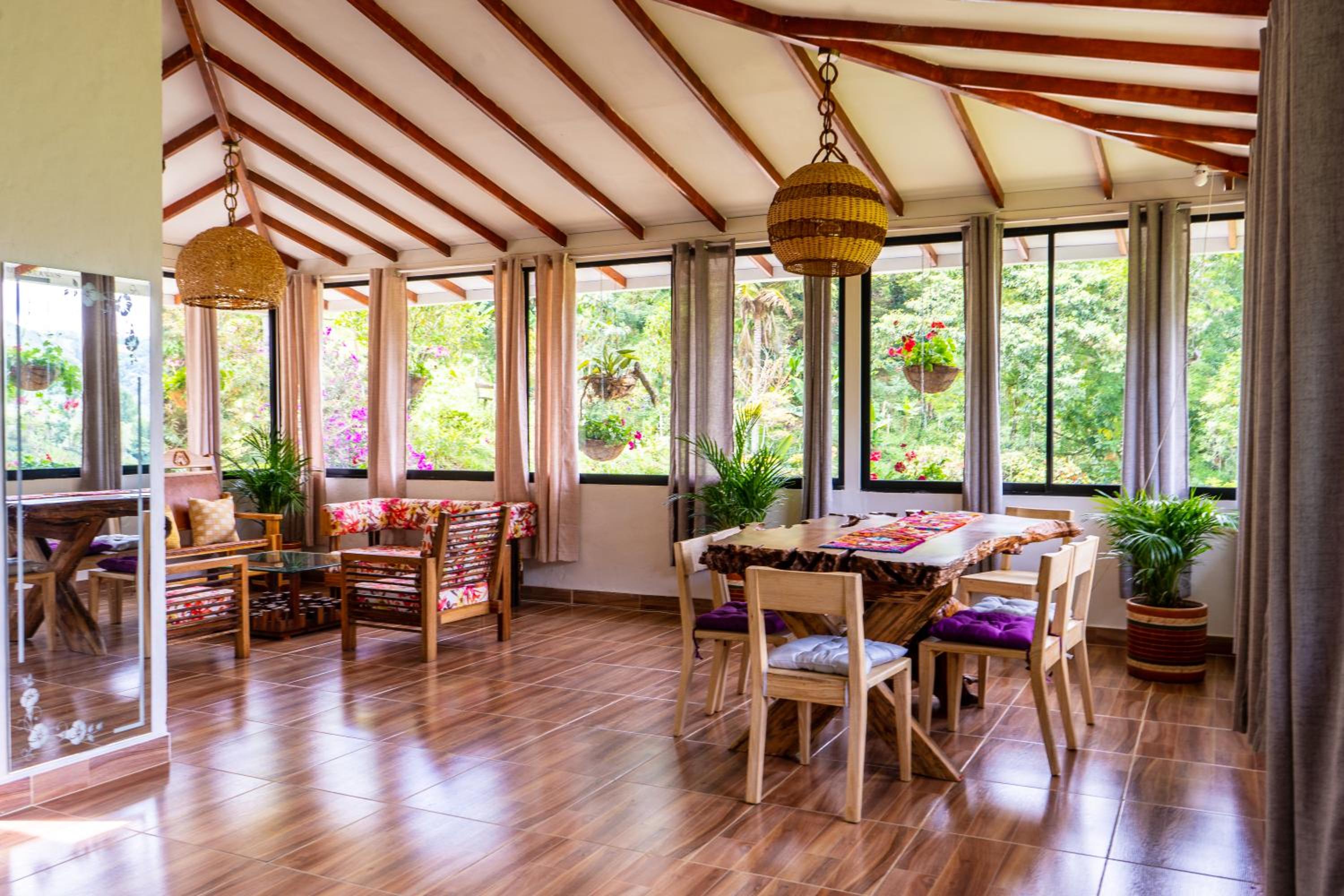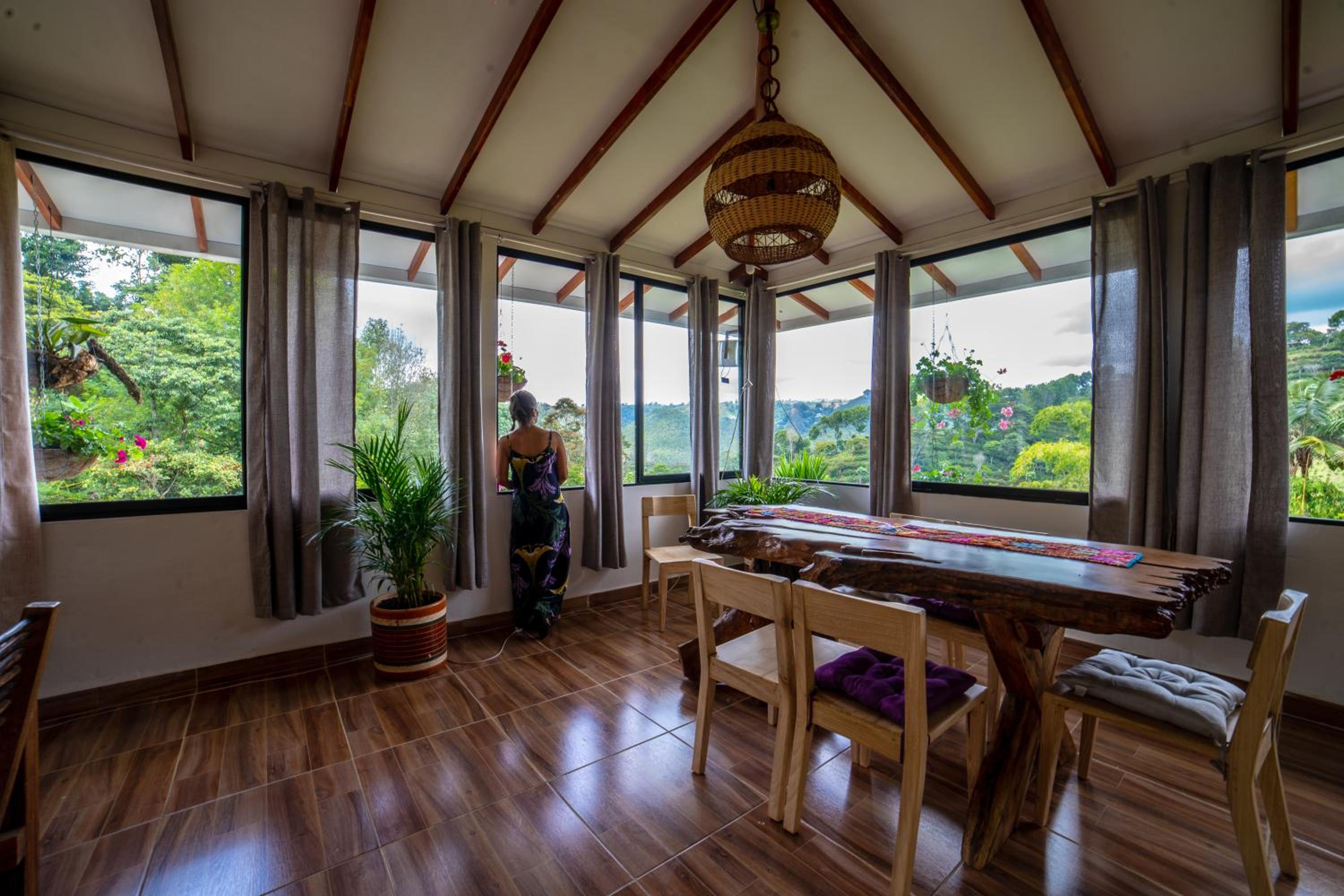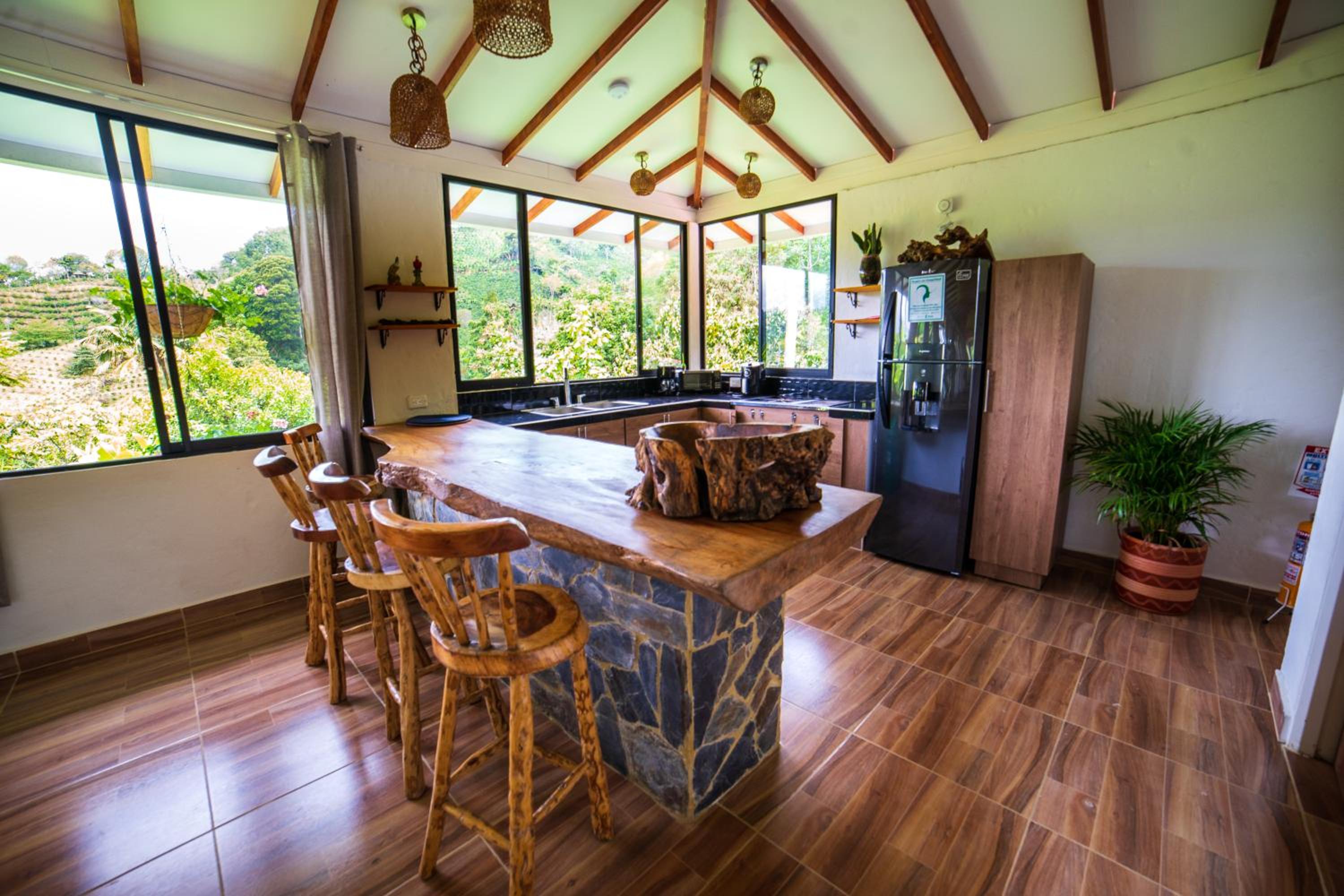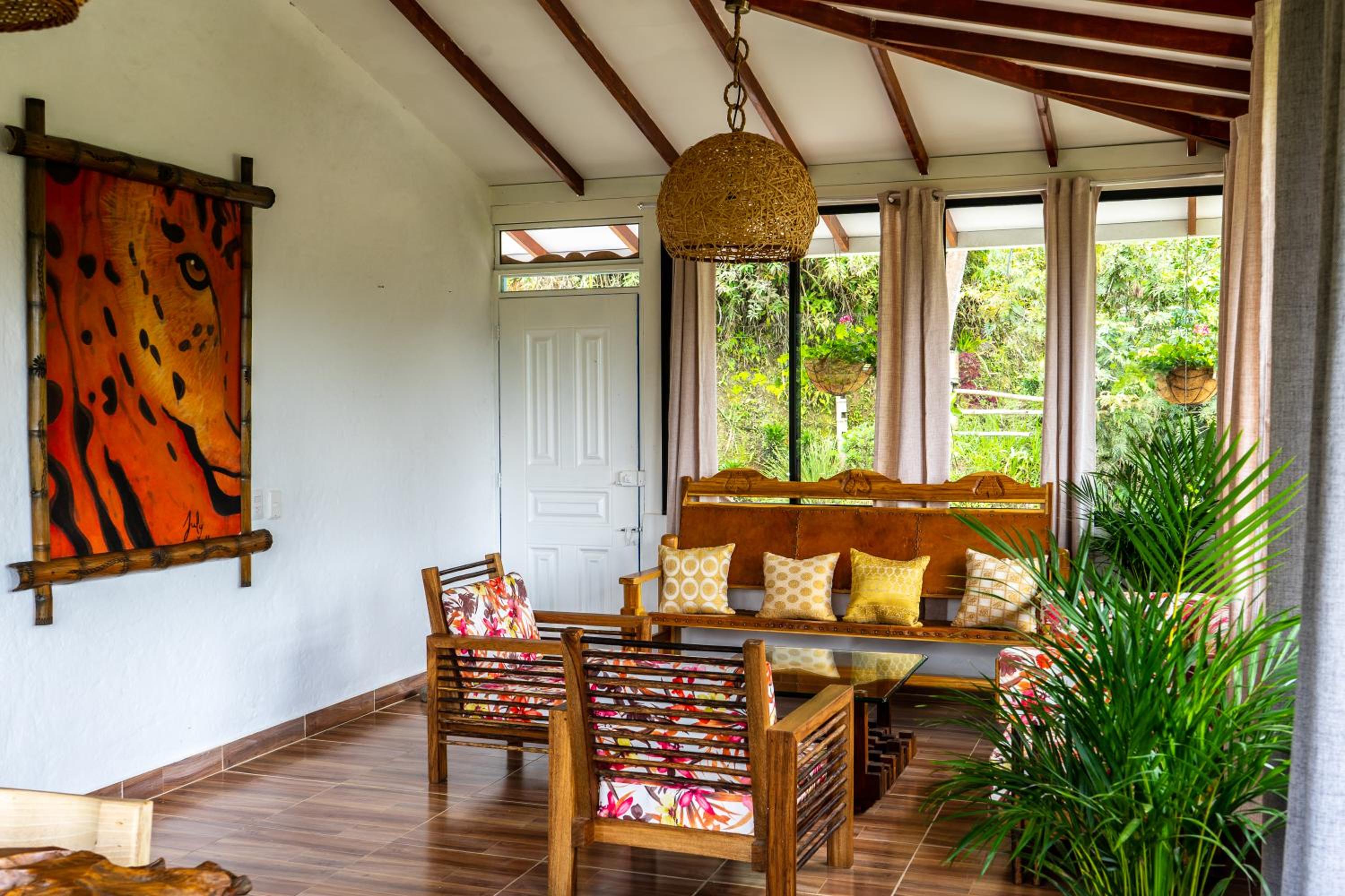 El entorno es espectacular, muy bien cuidado. Toda la zona común tiene un ventanal panorámico con vistas impresionantes, cuidadosamente decorado. Solo tiene 4 habitaciones, lo que lo convierte en un lugar muy tranquilo e íntimo. A menos de 15 minutos de Salento. Rodeado de fincas cafeteras.