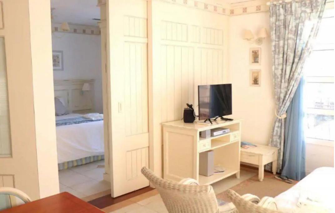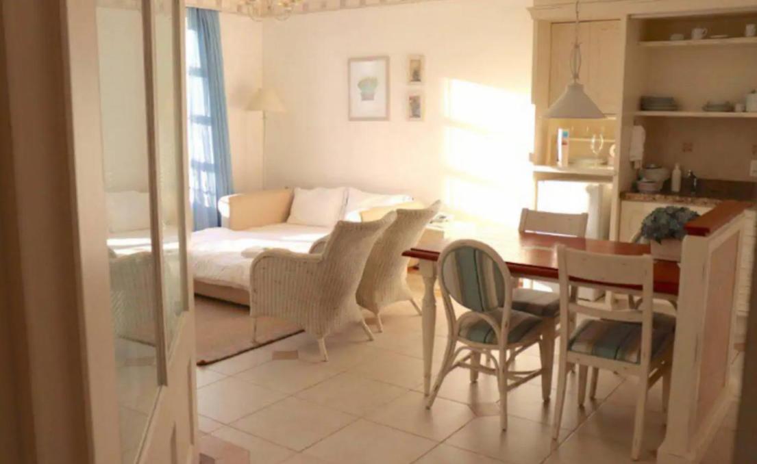 The spacious aparthotel includes a fully equipped kitchenette, flat-screen TV with streaming services, and a patio for outdoor dining, ensuring a comfortable stay.