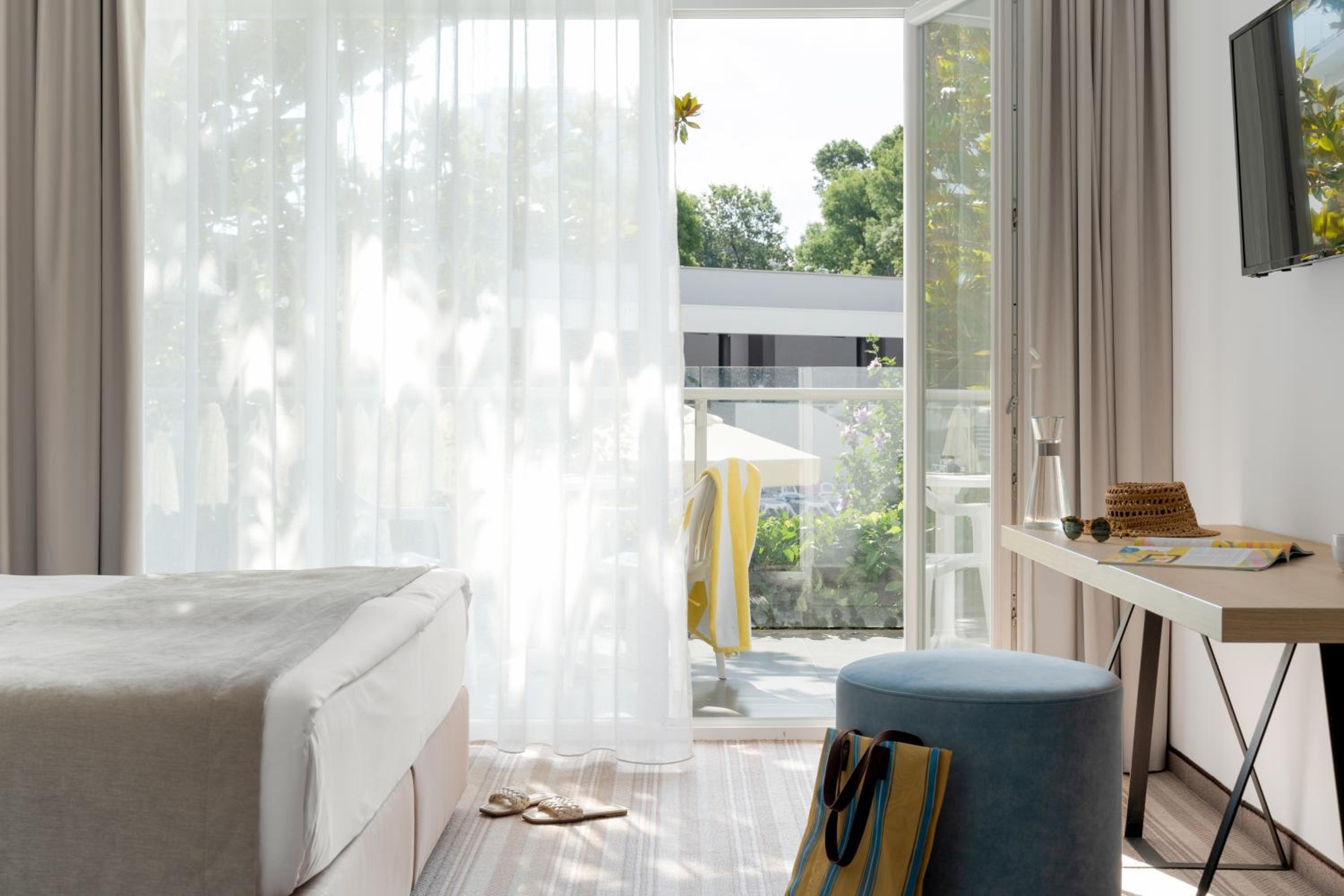 PERLA HOTEL All Inclusive Adults only offers elegantly designed air-conditioned rooms with free WiFi and private bathrooms. Each room features a balcony, desk, and flat-screen TV, ensuring a comfortable stay for guests.