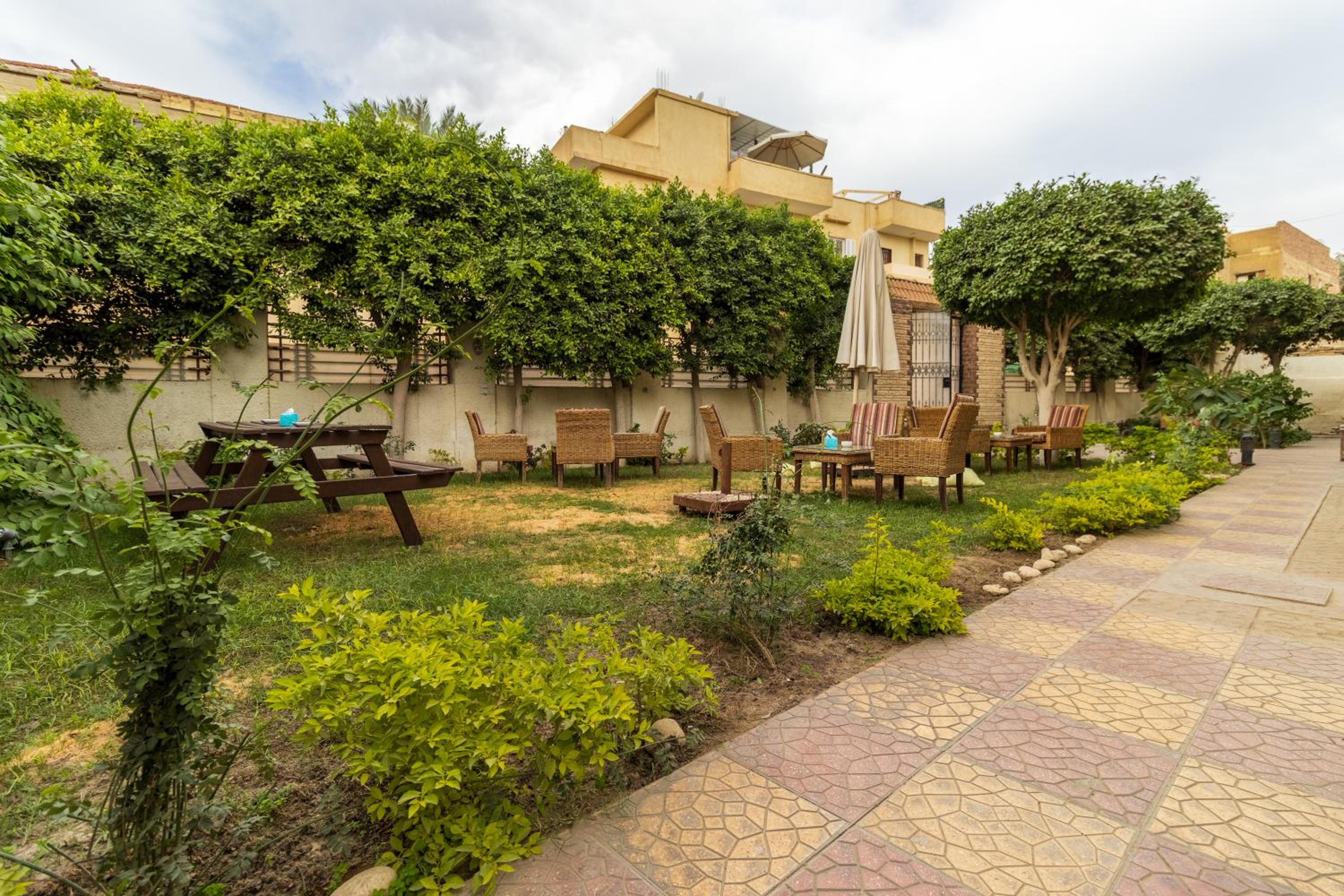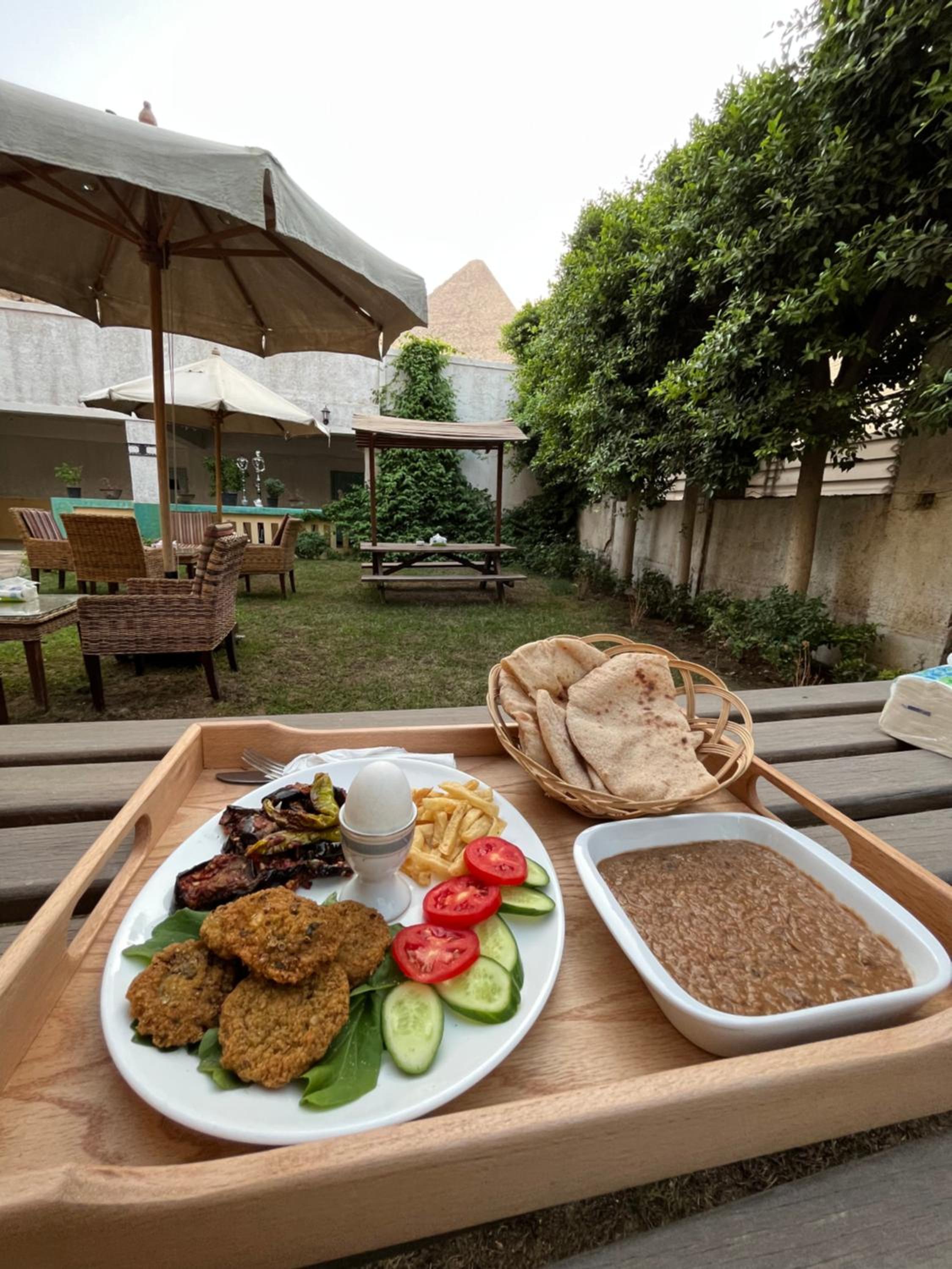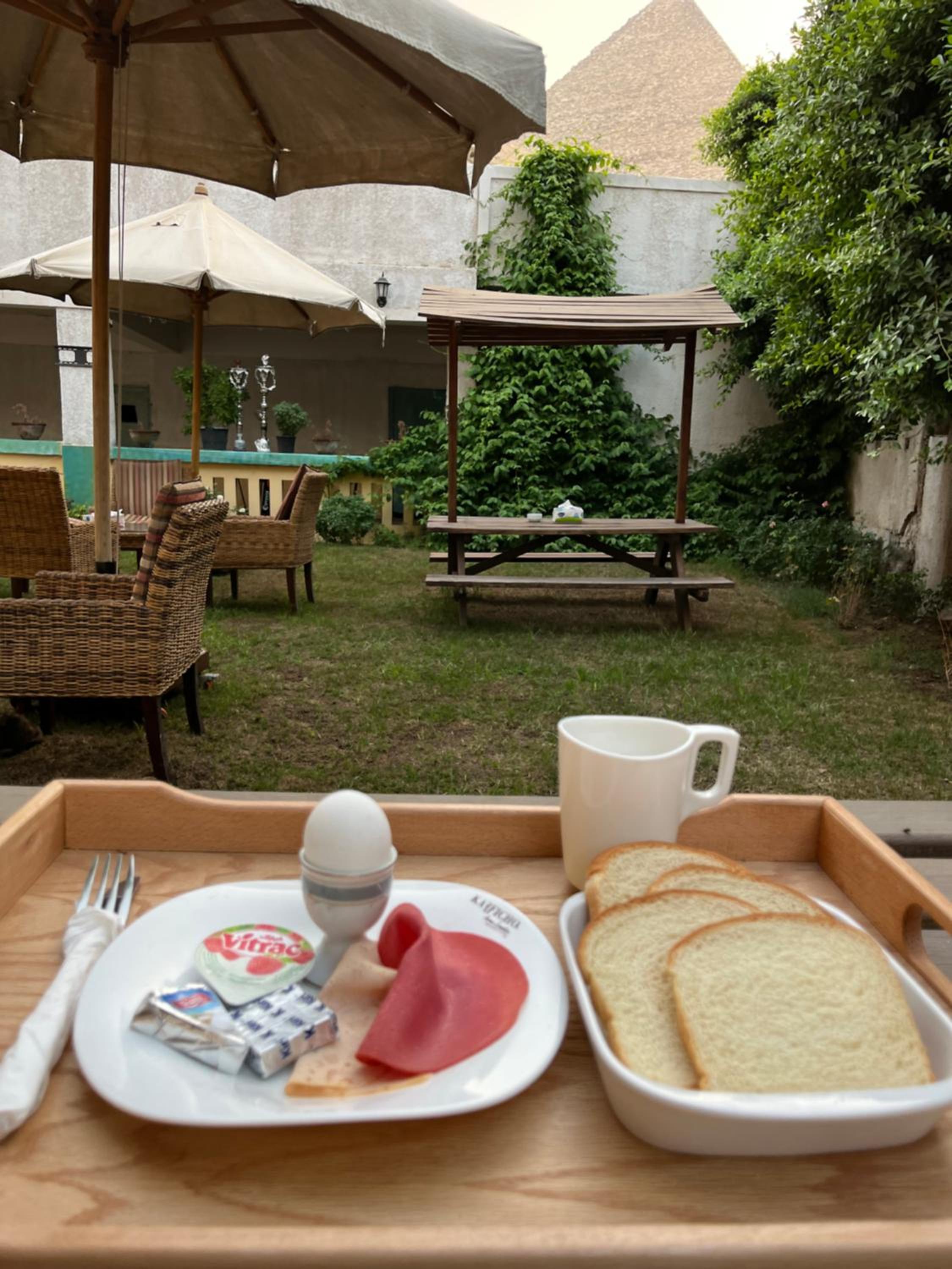 El hotel tiene su encanto, sencillo pero con lo necesario. El personal muy amable y servicial. El desayuno típico estupendo! Desde la habitación unas vistas increíbles de una de las pirámides así como desde la terraza. Tanto la terraza como el jardín increíbles.
