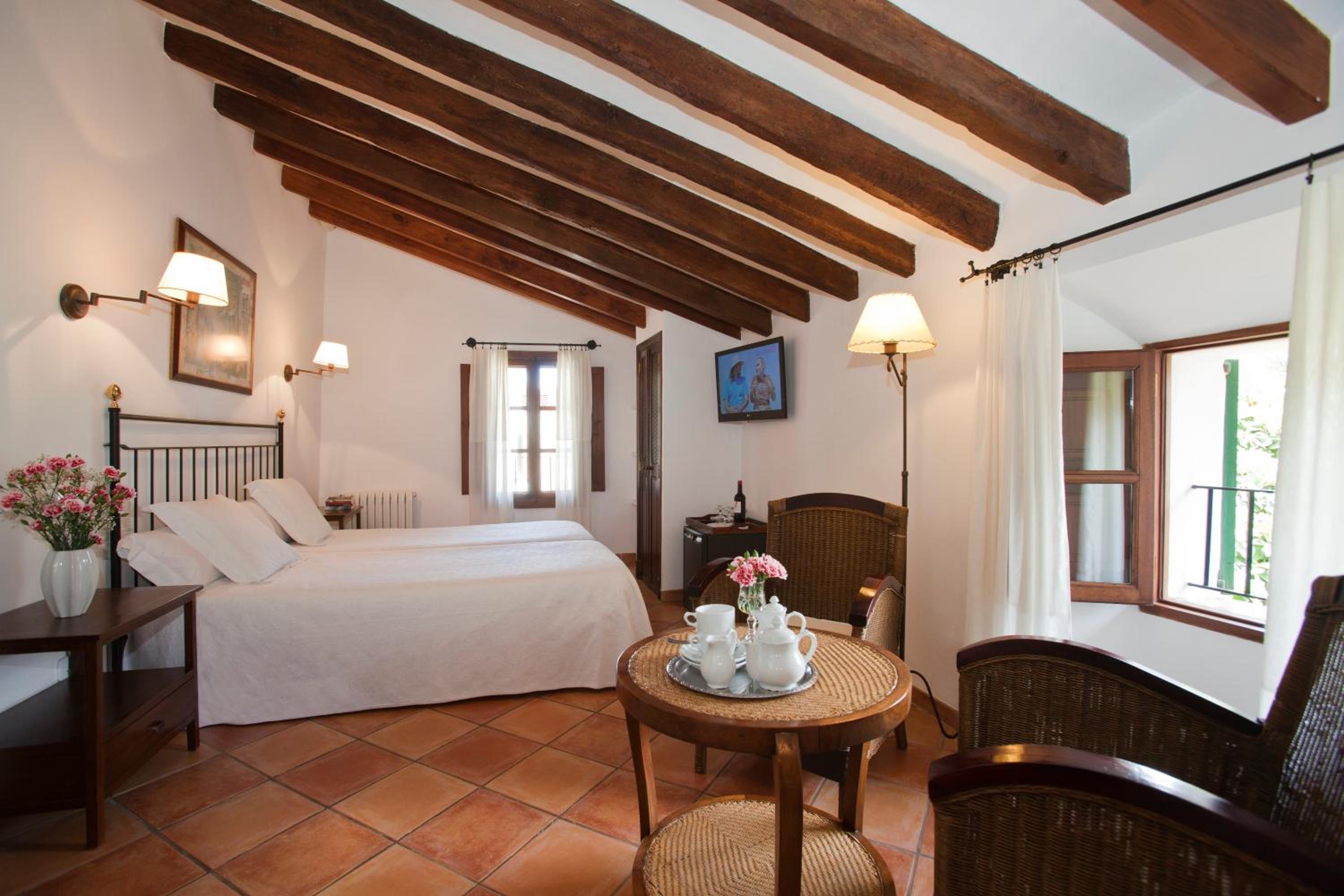 Elegant Rooms with Modern Amenities: Experience comfort in our air-conditioned rooms with views of the garden, town, or mountains. Enjoy free Wi-Fi, flat-screen TV, minibar, and safe in a classic decor with wooden furniture.