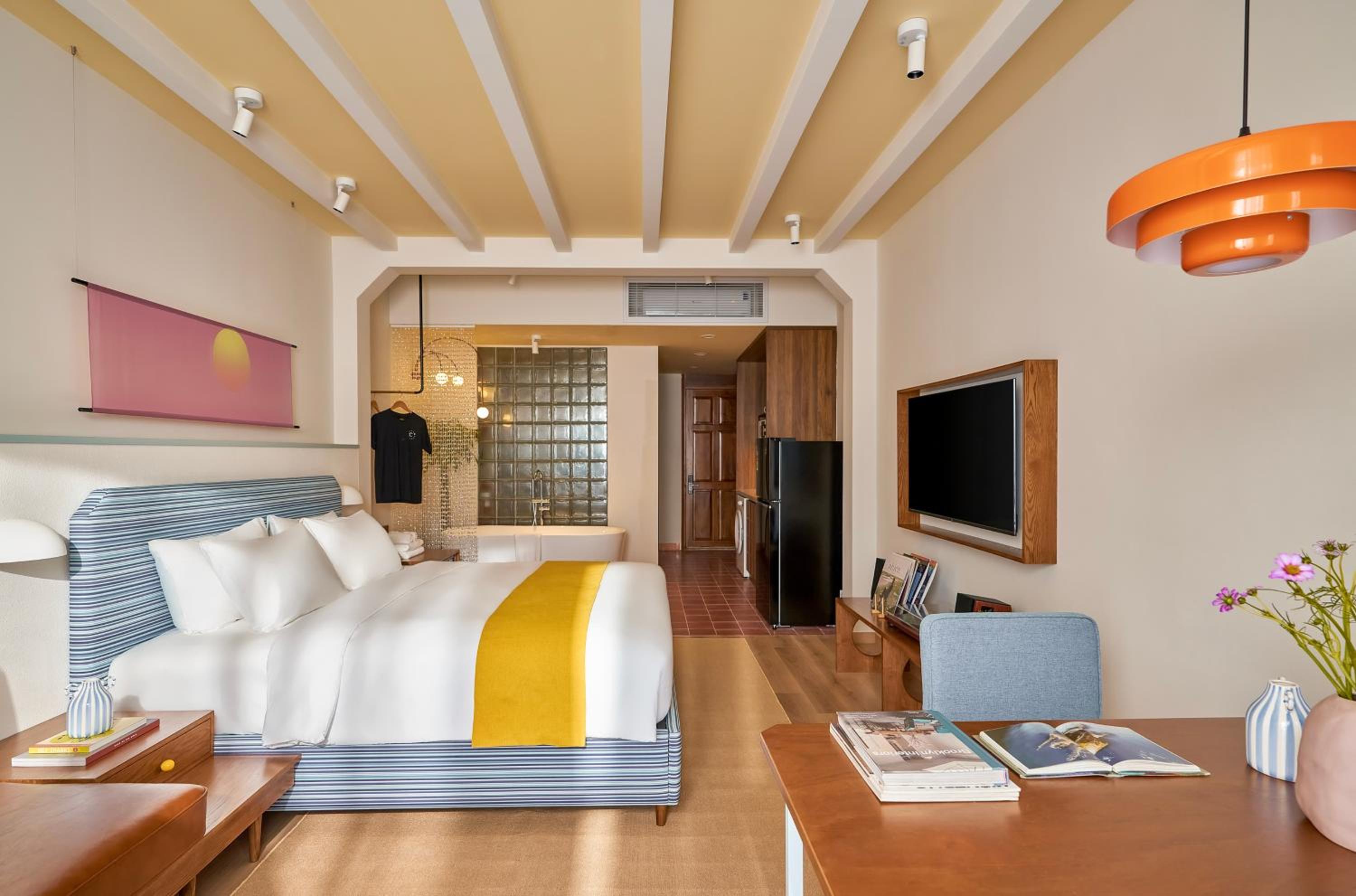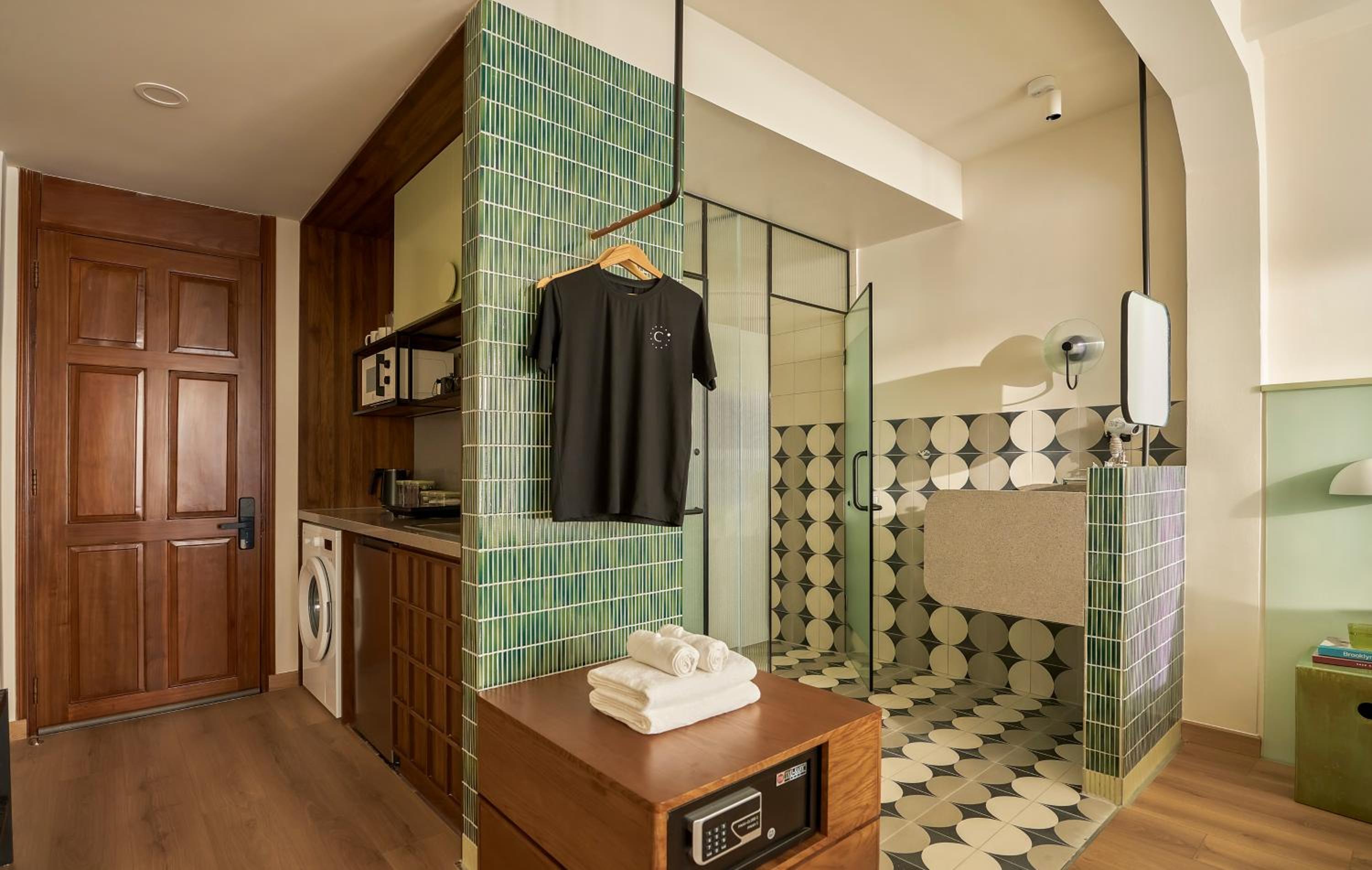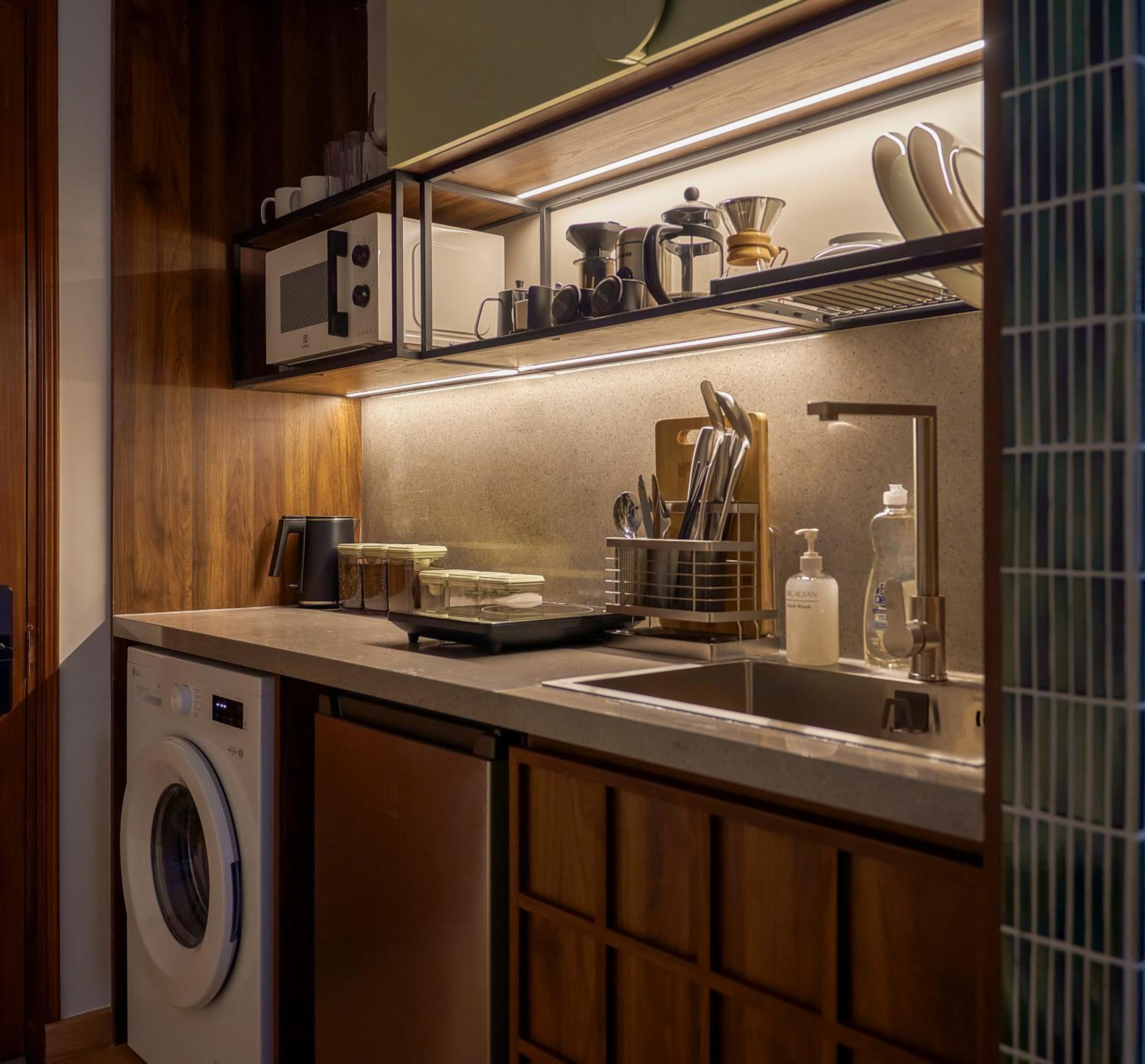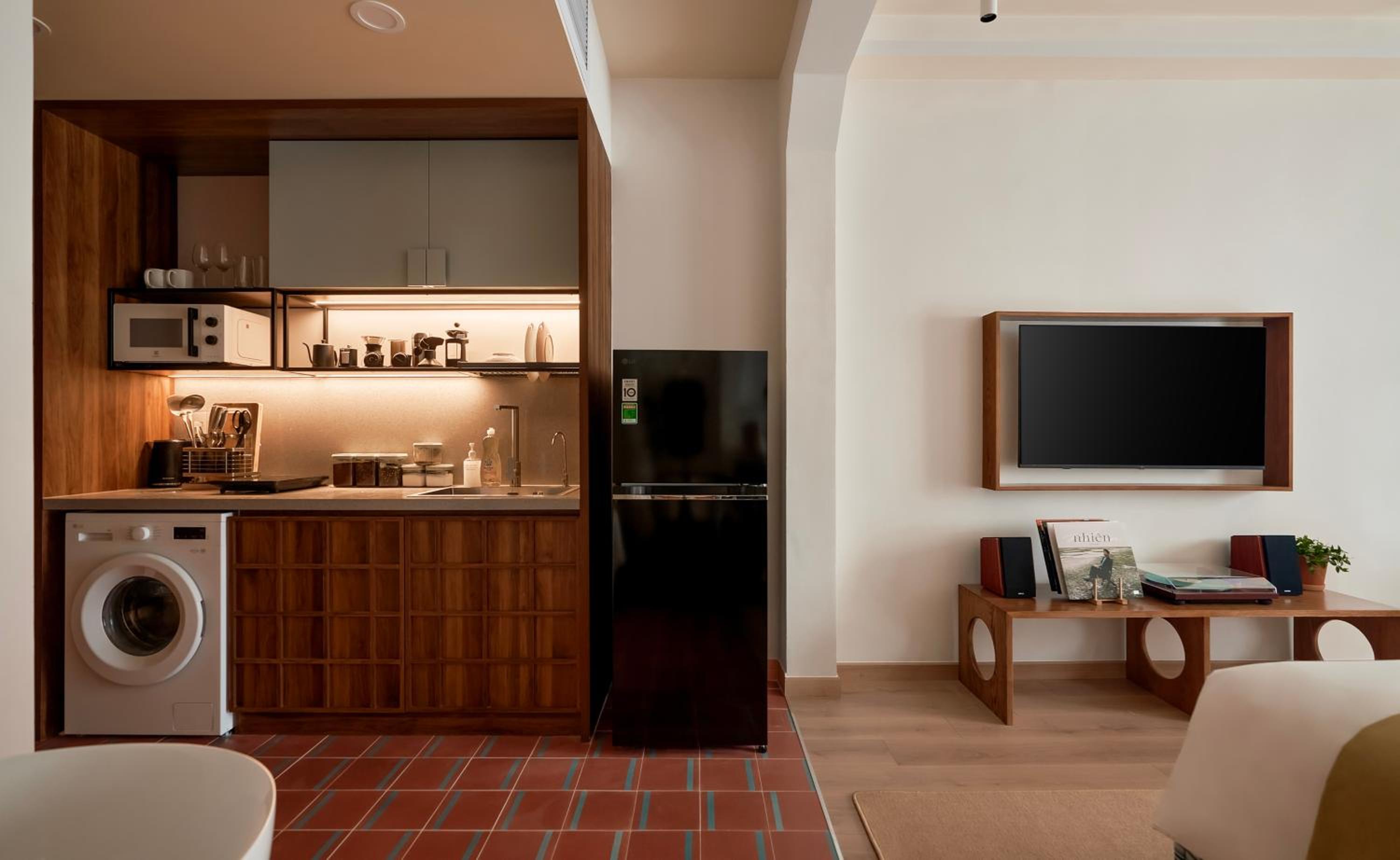 There is a fully equipped kitchen with everything needed, including coffee and tea brewing equipment, although we didn’t need it much thanks to the amazing Vietnamese cuisine and great coffee nearby. The washing machine was extremely useful during our long stay. The record player was a lovely surprise, and although we didn’t use the TV, having Netflix and similar platforms available was definitely a great plus.