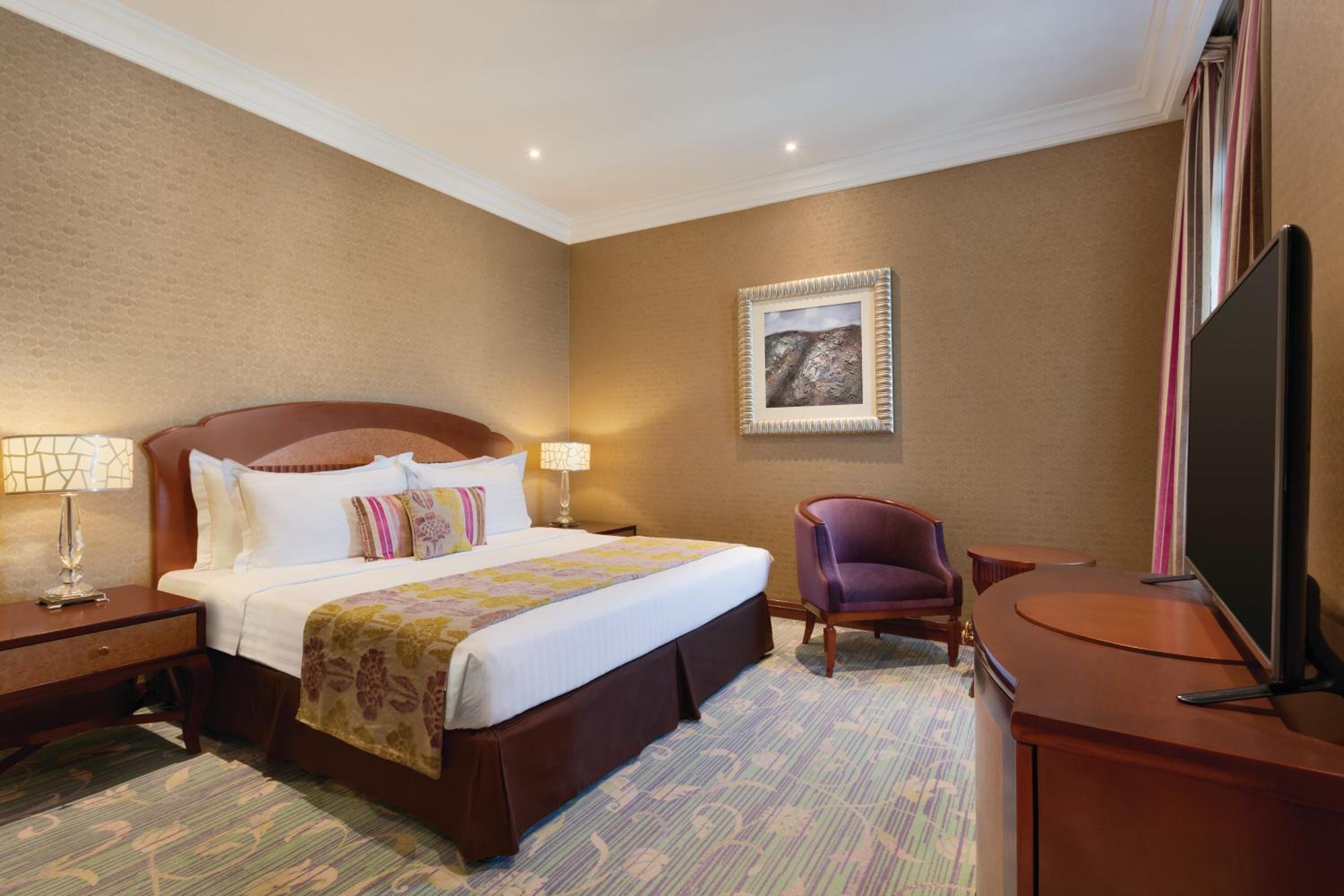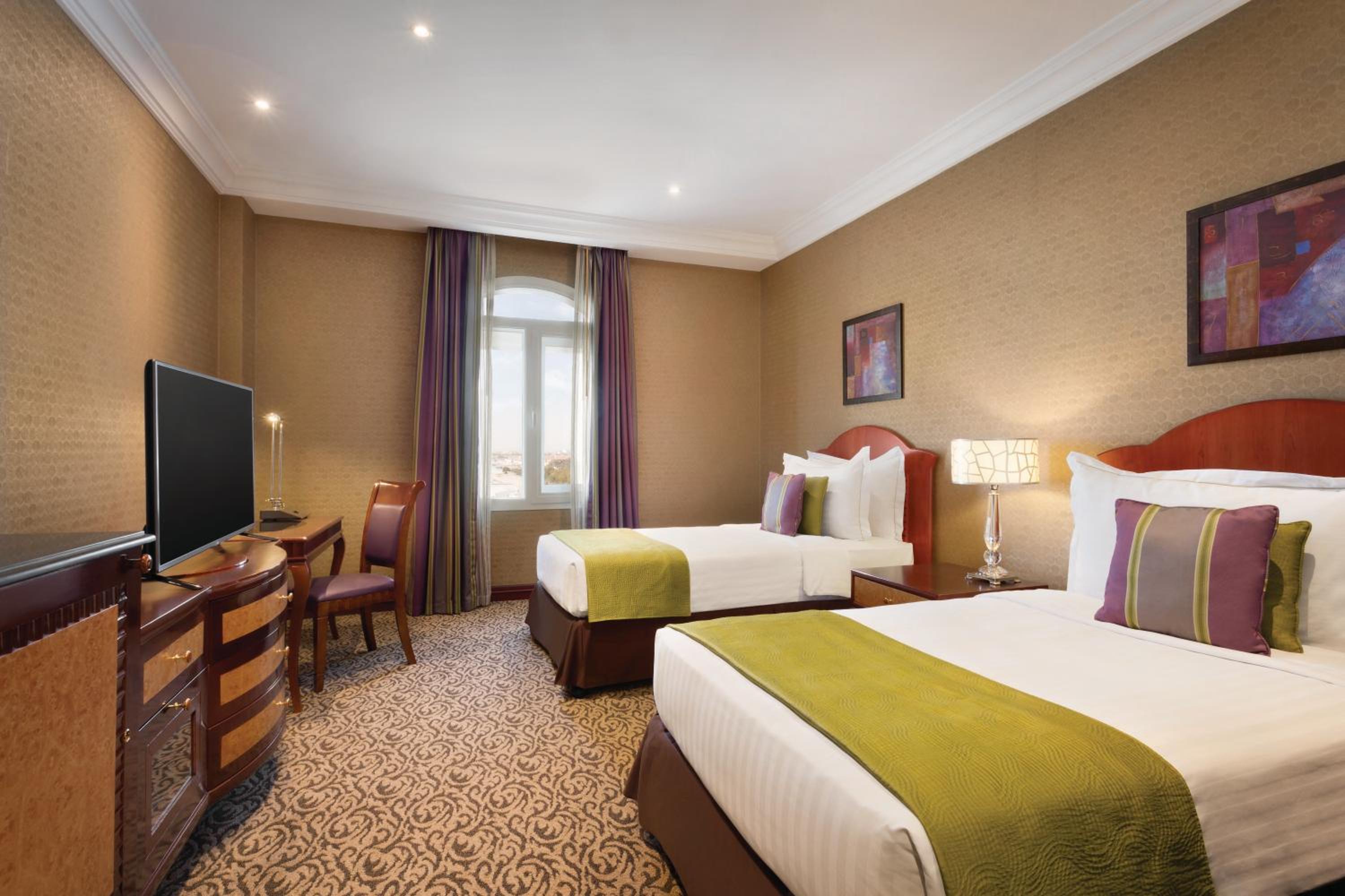 Experience comfort and elegance at Grand Regency Hotel-Doha, where rooms feature plush carpets, spacious beds, and modern amenities like satellite TV and tea/coffee makers. The en suite bathrooms with bathrobes and slippers add a touch of luxury to your stay.