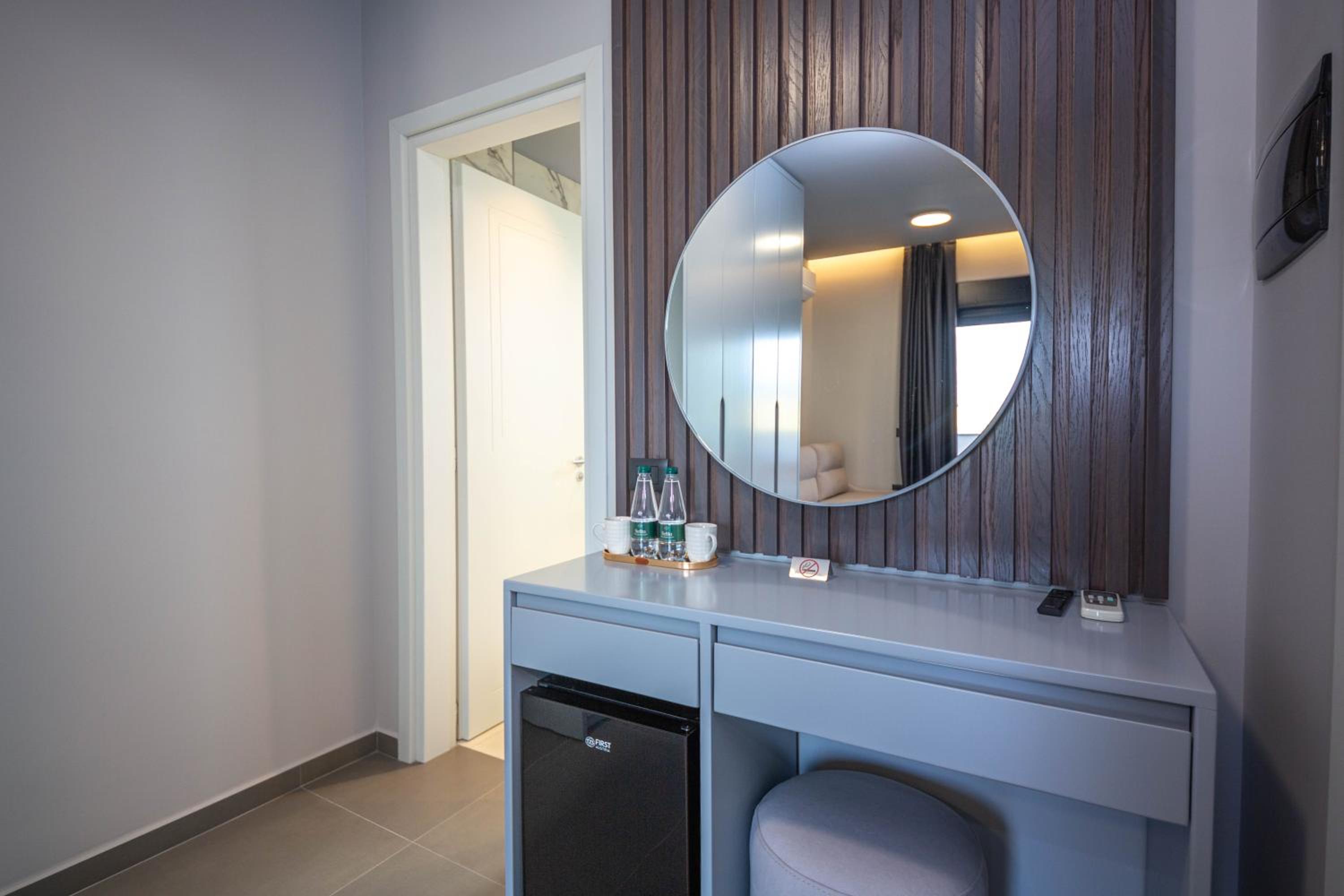 The hotel is lovely and clean and new and of very high quality for the price. Great shower, thick cotton sheets. There was a small fridge in the room, with minibar and two complementary bottles of water. Nice touch! 😁.