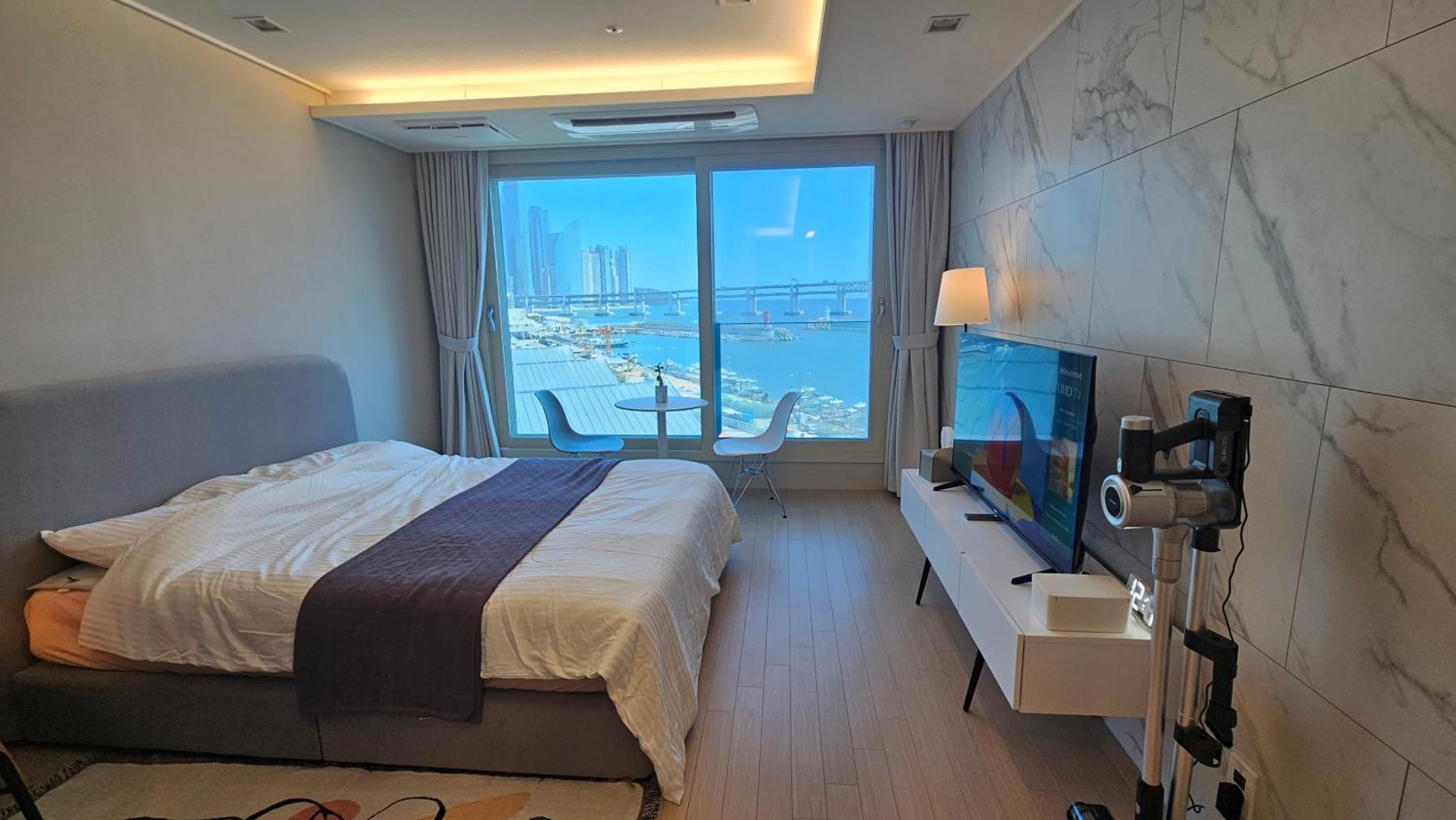 This is the perfect option if you travel in Busan and want to stay close to the beach. The flat is in a very modern building and has a very modern, fancy decoration. We are a family of 3 and had a wonderful time. We found it a bit tricky to check-in but at the end we read the instructions once more and found our way (when you want to unlock the flat's door you have to press at 2 random digits on the keypad; the keypad with all digits available is revealed, only then you type the password given by the owners). The bed was a biiit soft than I wanted but my daughter and wife loved it. The room is very spacious. The view is amazing. Tons of really good restaurants, Konbinis, eating places at the Gwangali beach. If you want to visit Haeundae beach you can order an Uber taxi, costs around 5-8 euros. We did not visit any of central Busan's sightseeings so I can not tell you if the flat is well located but if you want to explore Gwangalli and have some really good time at the beach nearby then this flat is the best option you can choose.