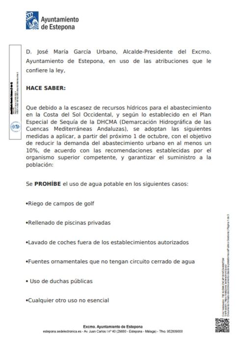 Due to the extreme drought situation in Andalusia, the municipalities of the Mancomunidad de Municipios de La Costa del Sol, including Estepona, will reduce the water pressure from 00:00 to 06:00 in order to achieve the goal of reducing consumption to 160 liters per inhabitant per day set by the Junta de Andalucía.