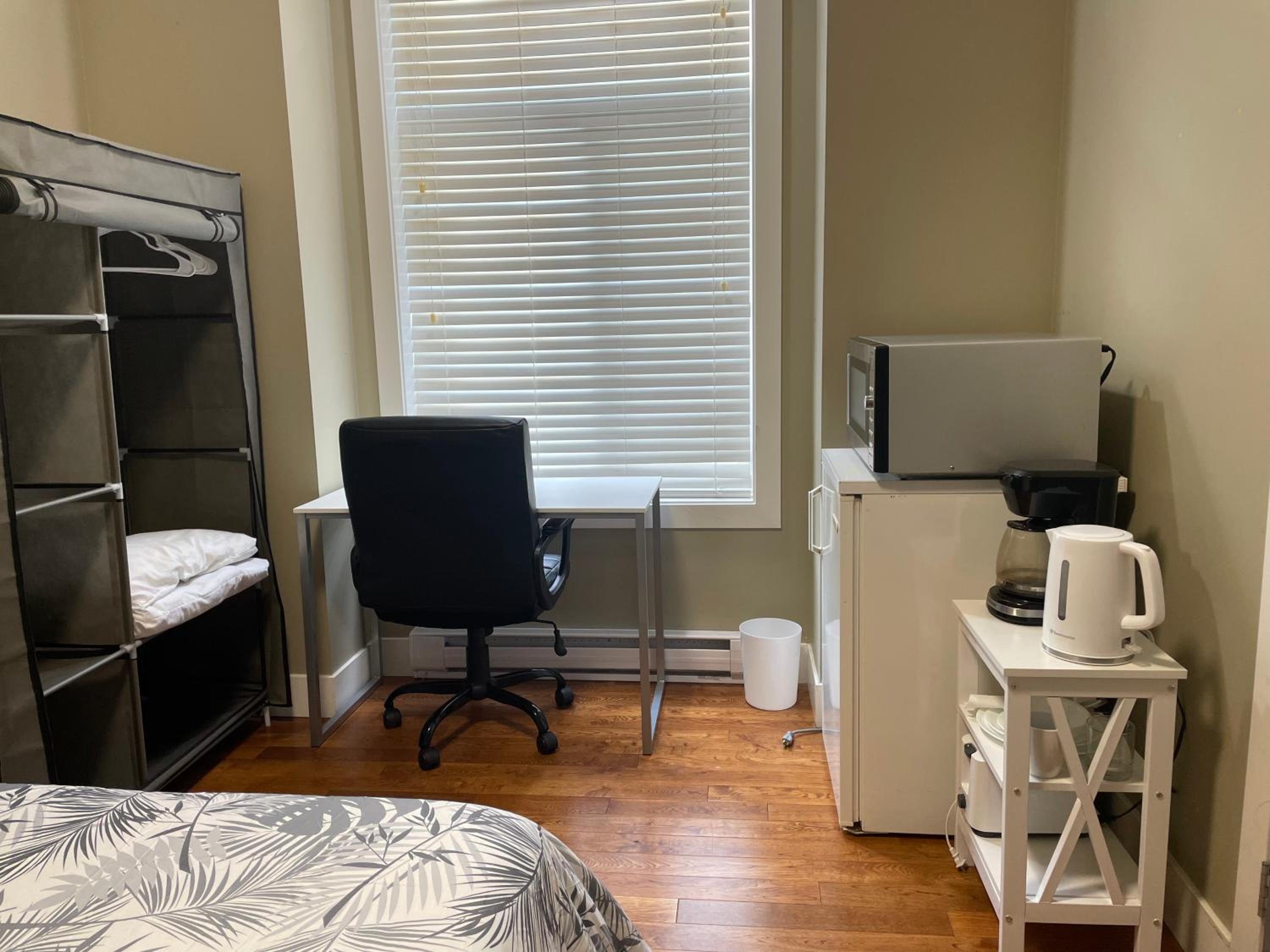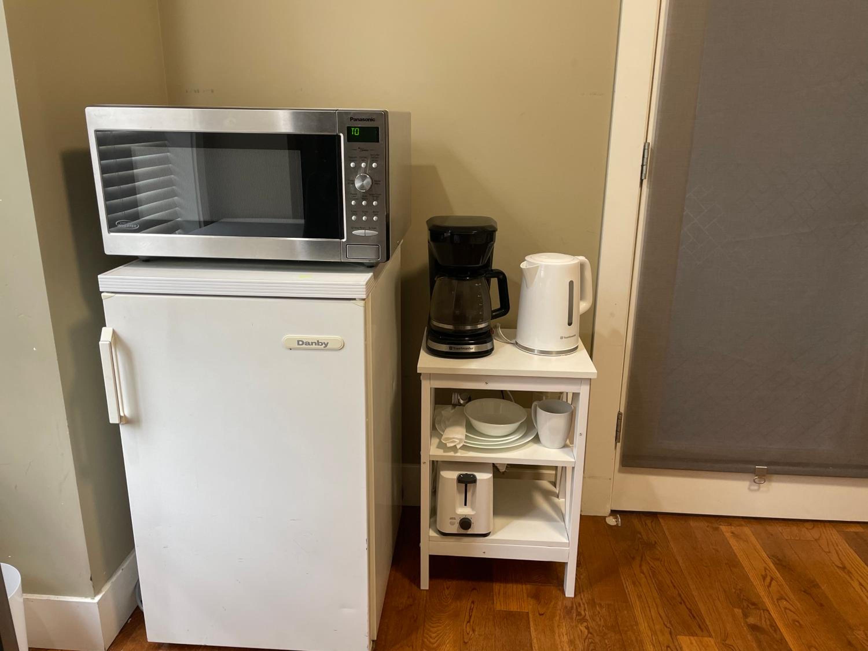 The room offers a kitchenette equipped with a microwave, toaster, and fridge for your convenience.