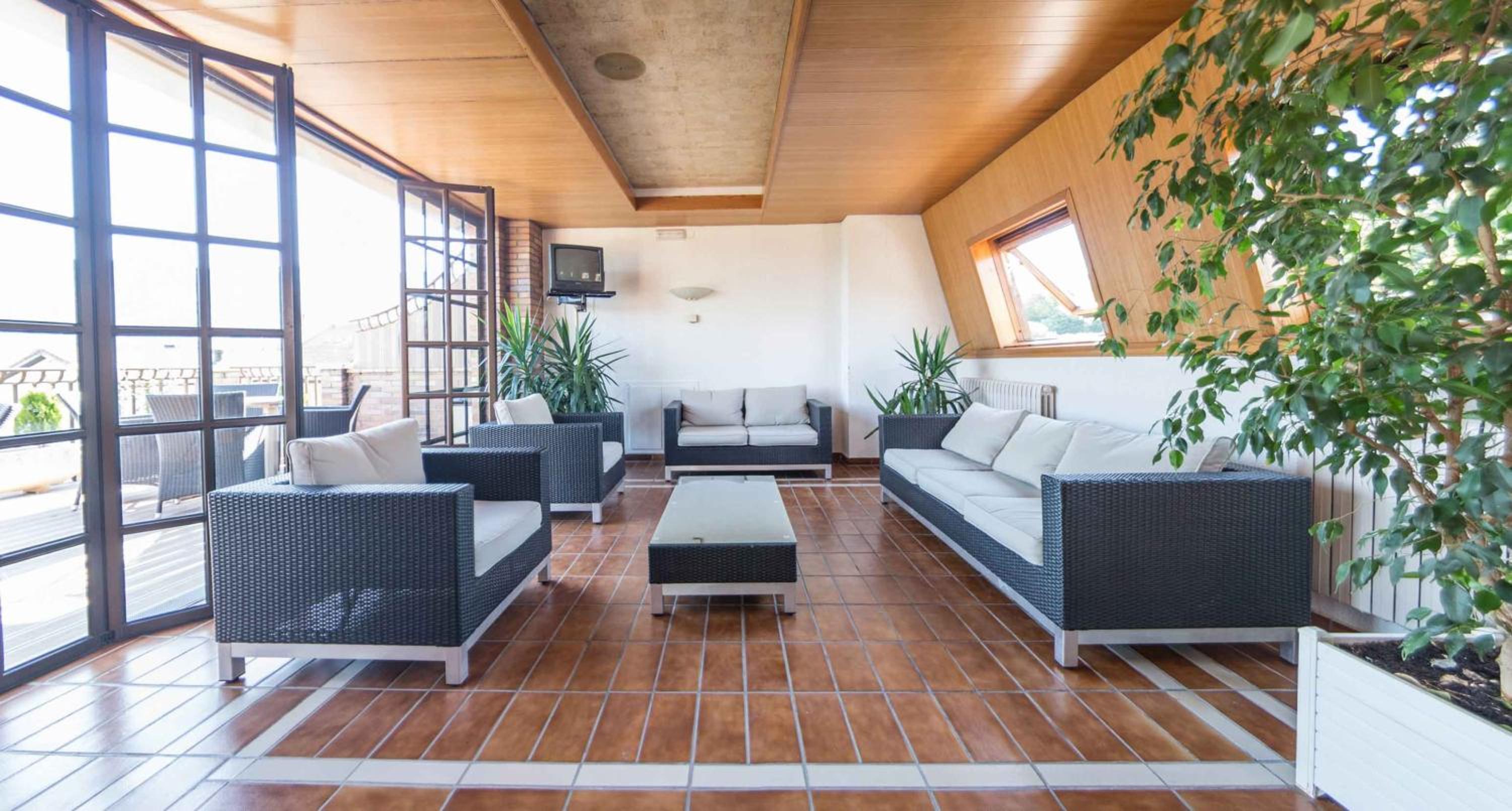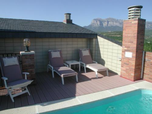 Guests can unwind on the rooftop sun terrace, complete with a relaxing seating area, a refreshing pool, and breathtaking views of the picturesque Pyrenees, creating a tranquil retreat.