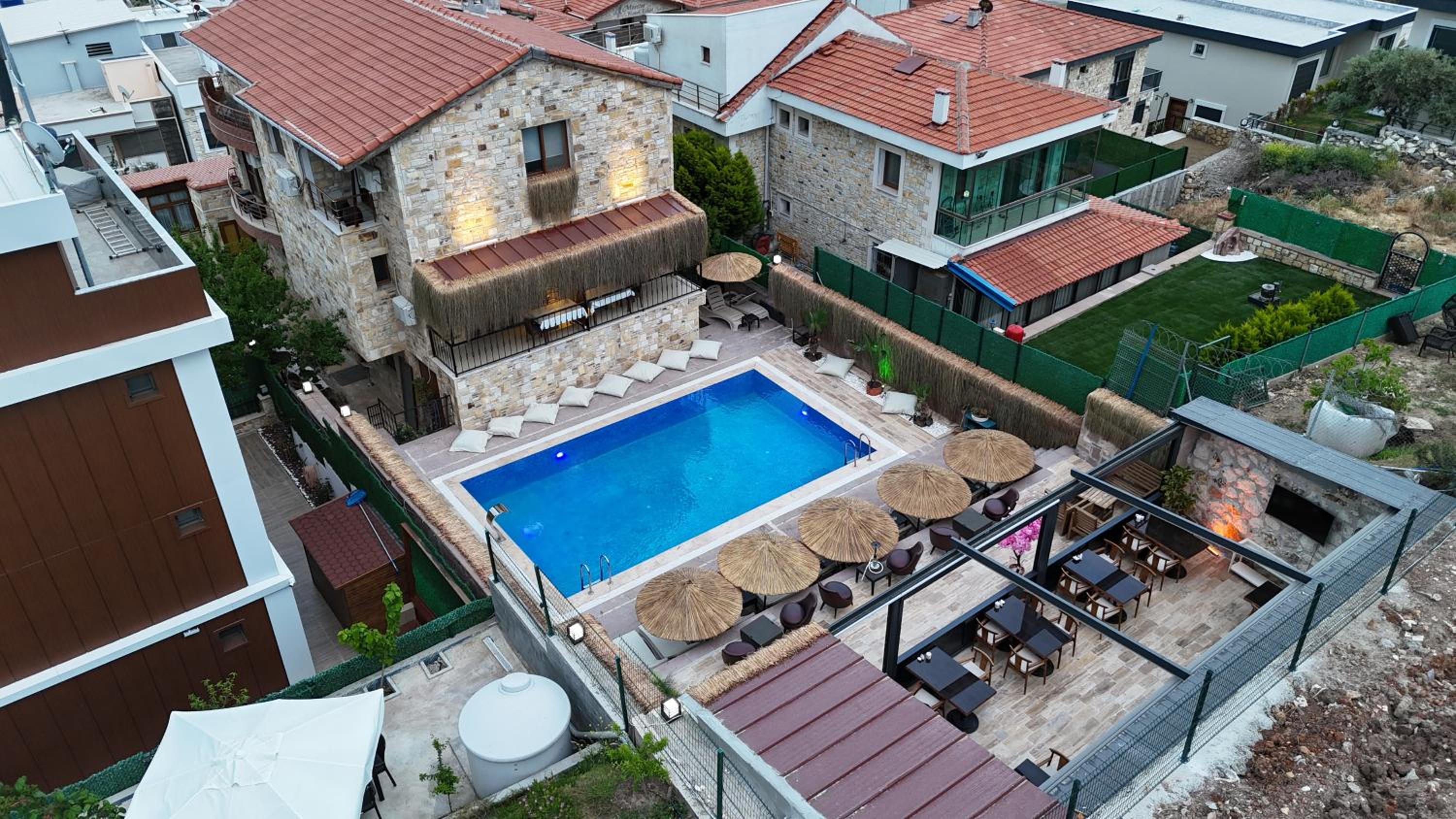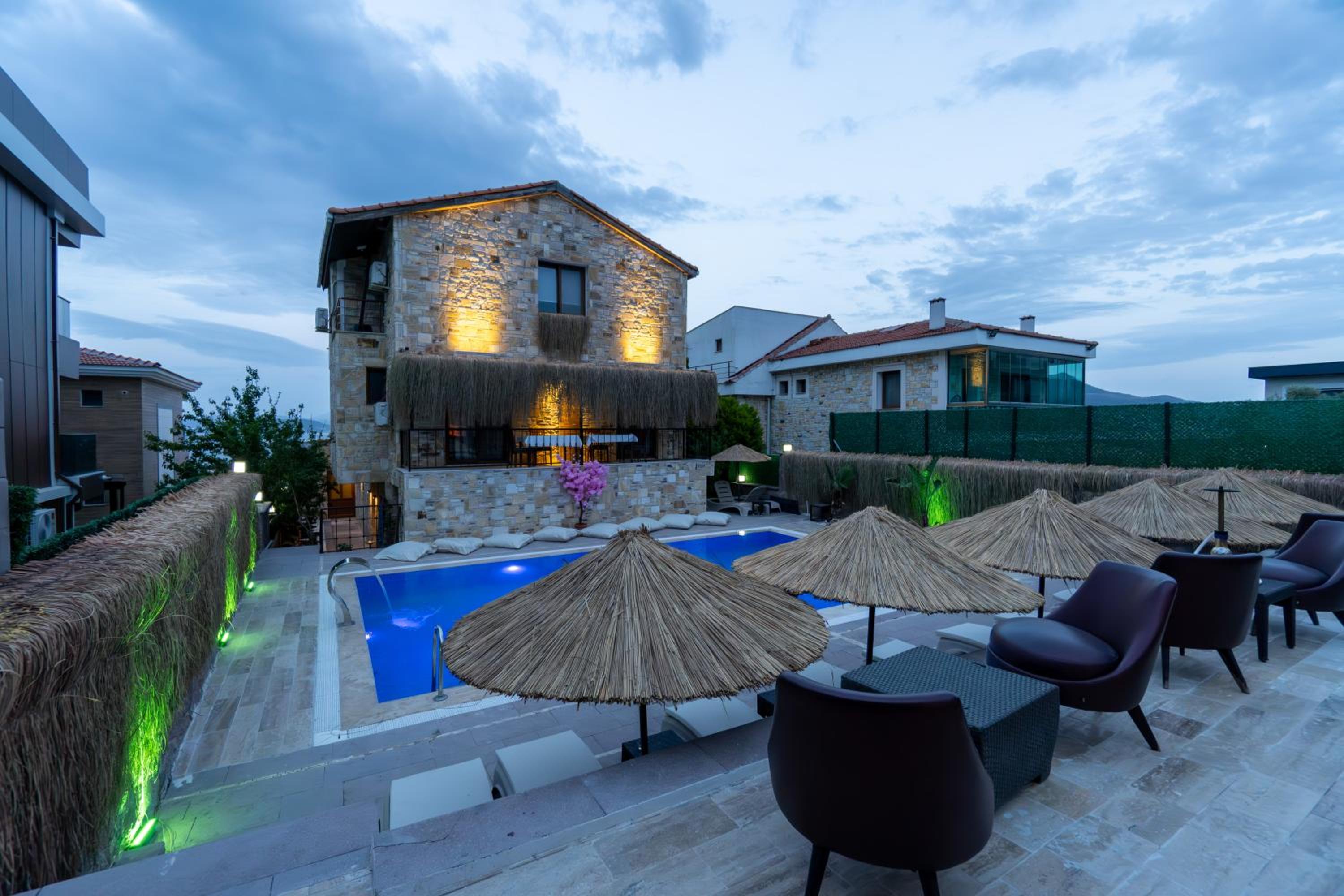 Explore the outdoor swimming pool, garden, and terrace at Stone House Butik Otel. Relax and unwind in the serene environment.