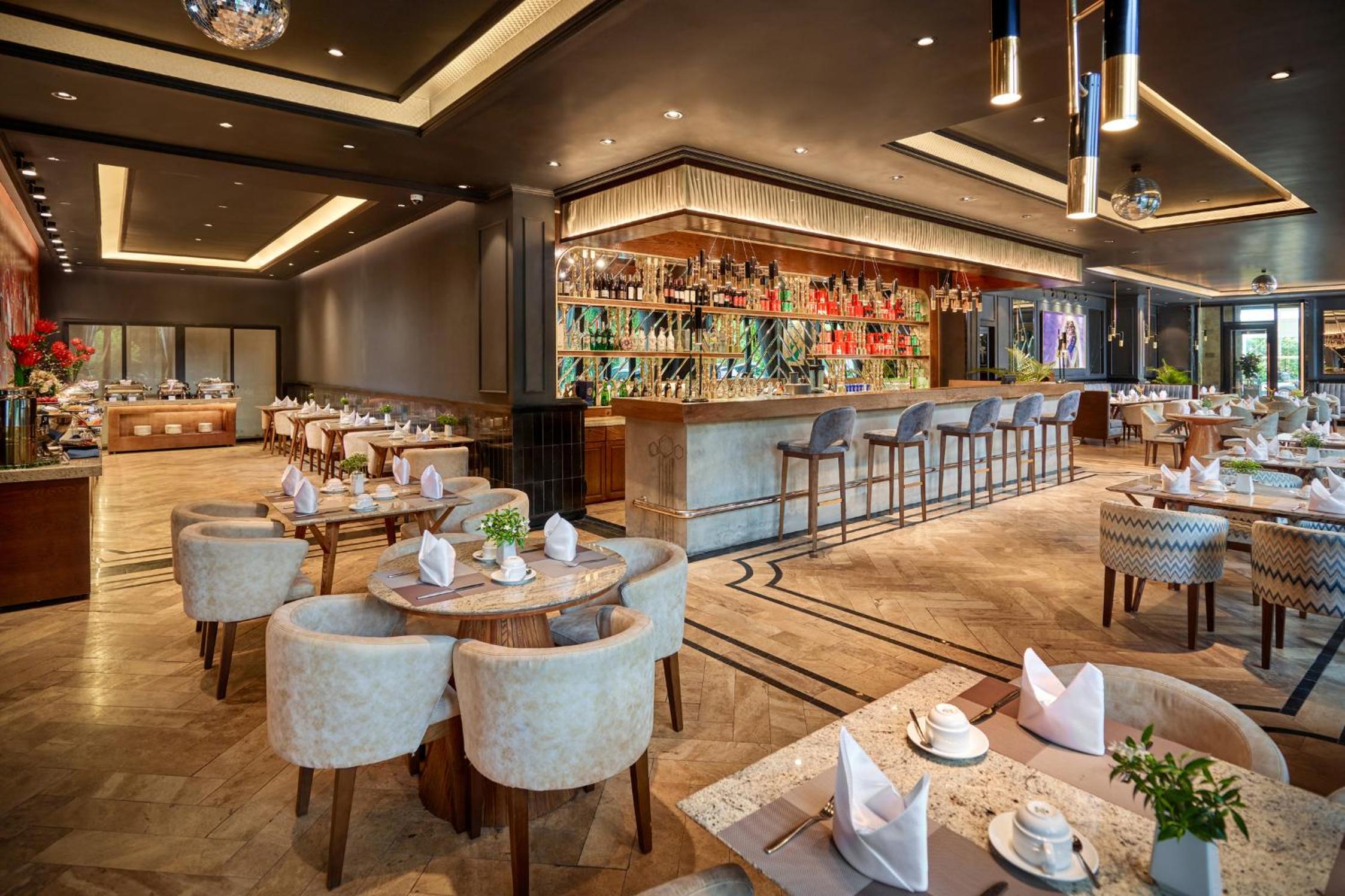 No bar or restaurant. Breakfast is served at their sister hotel but there is a shuttle.
