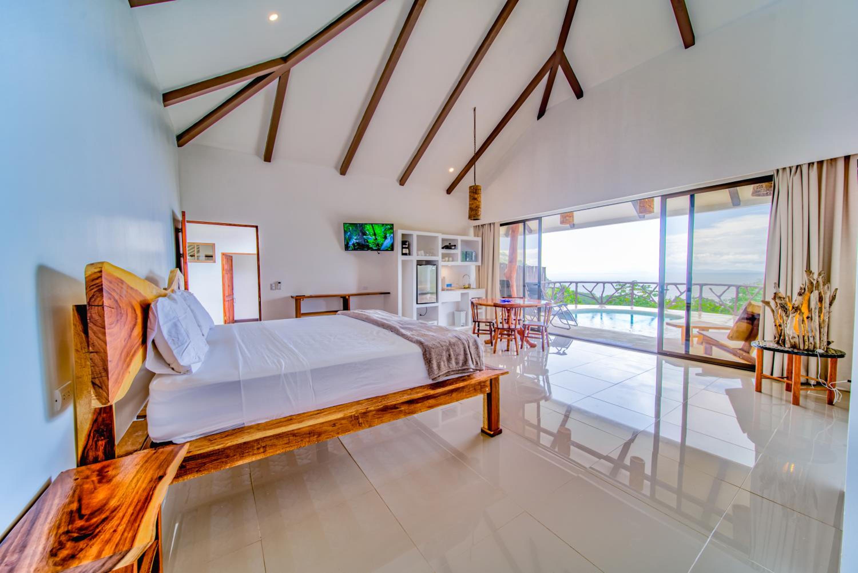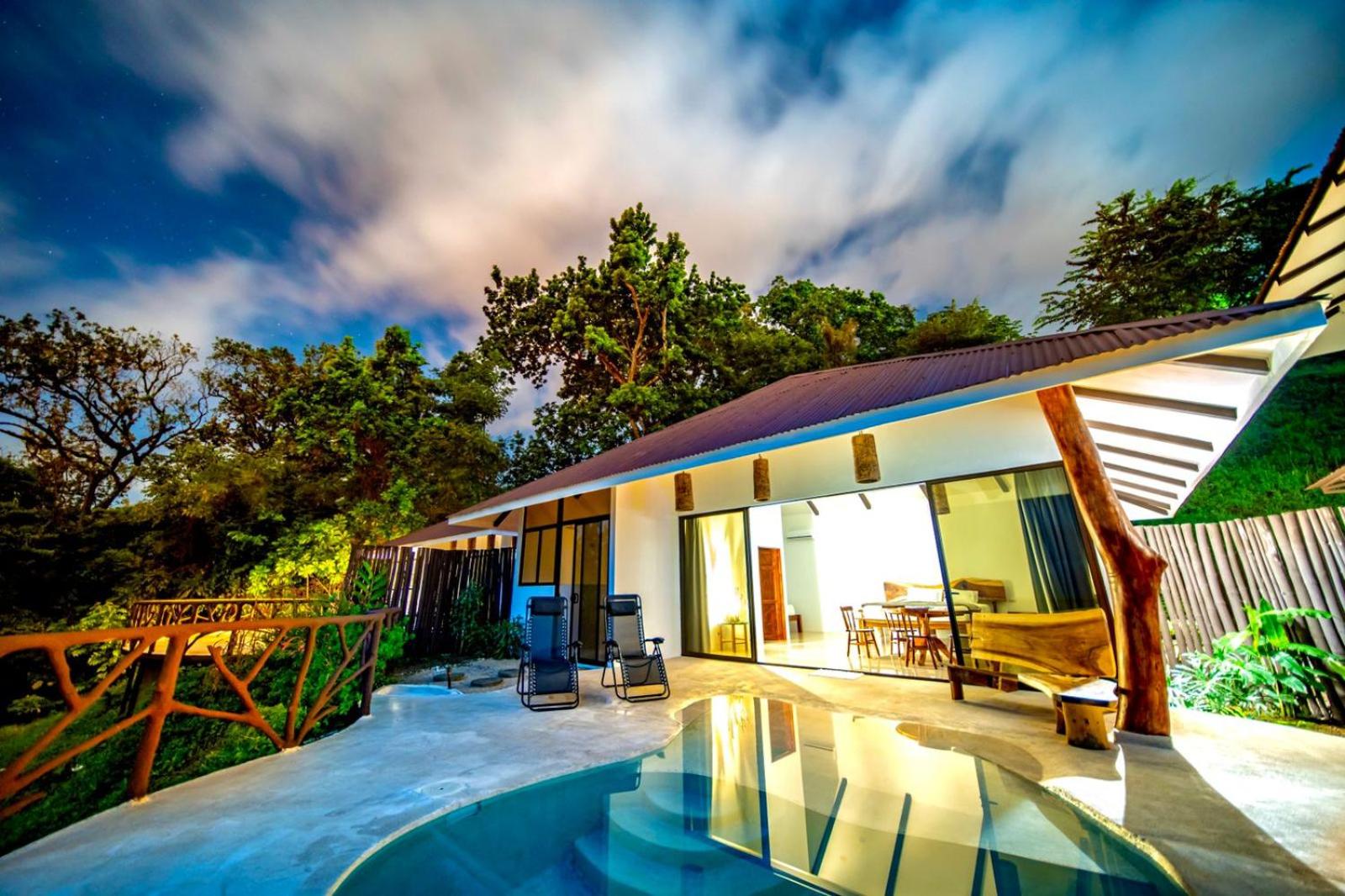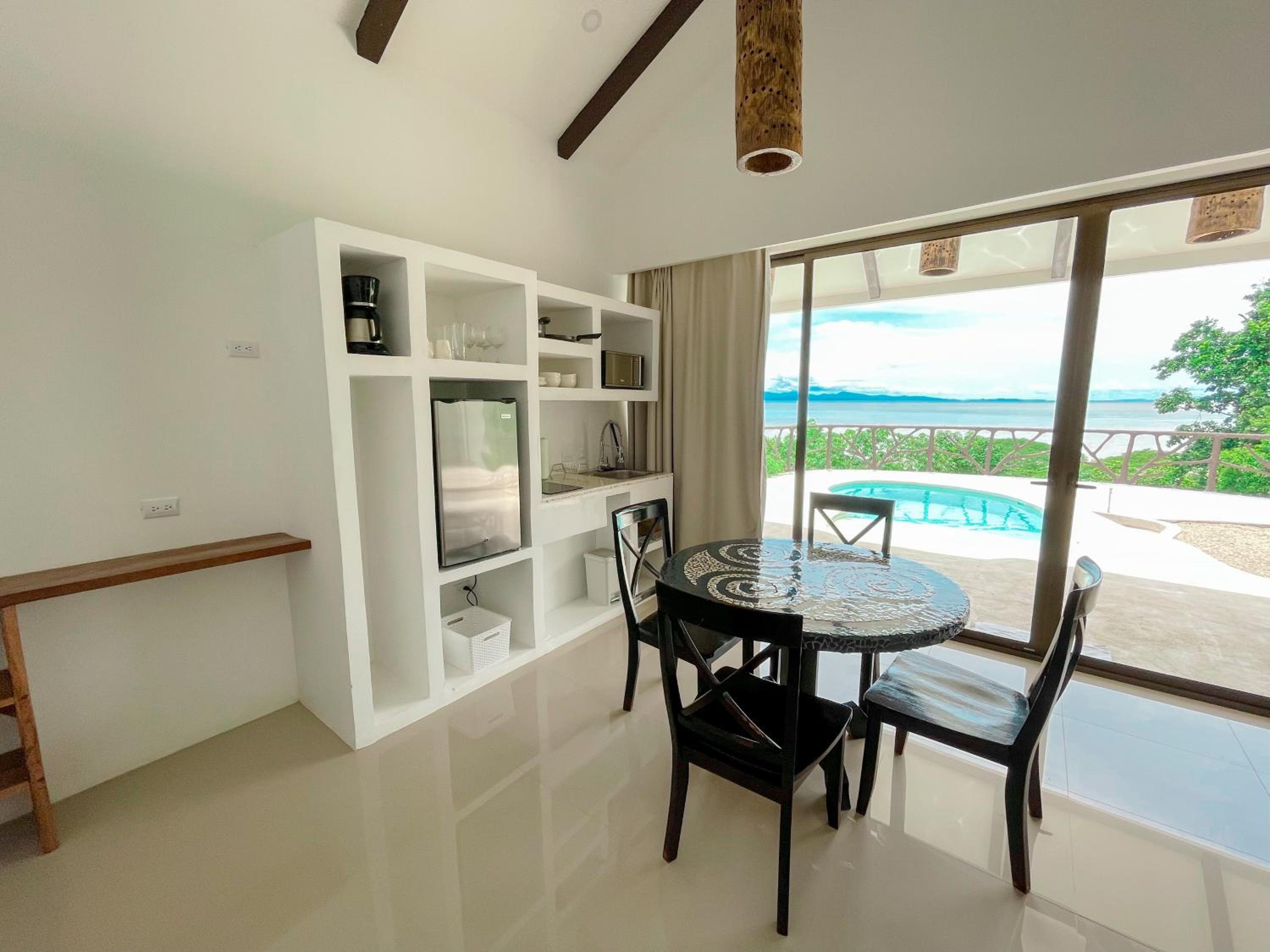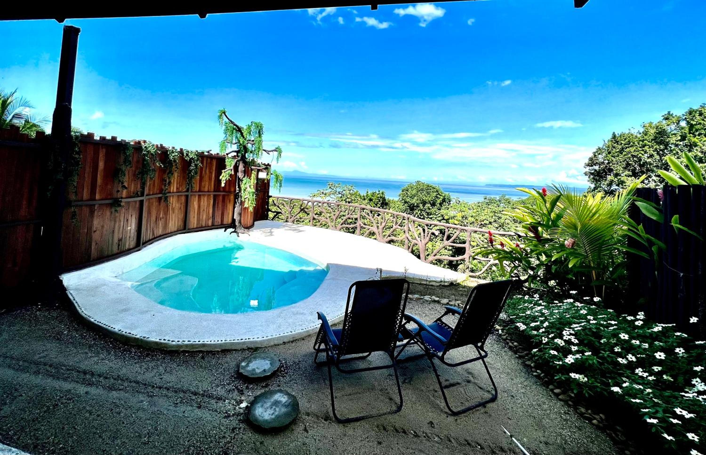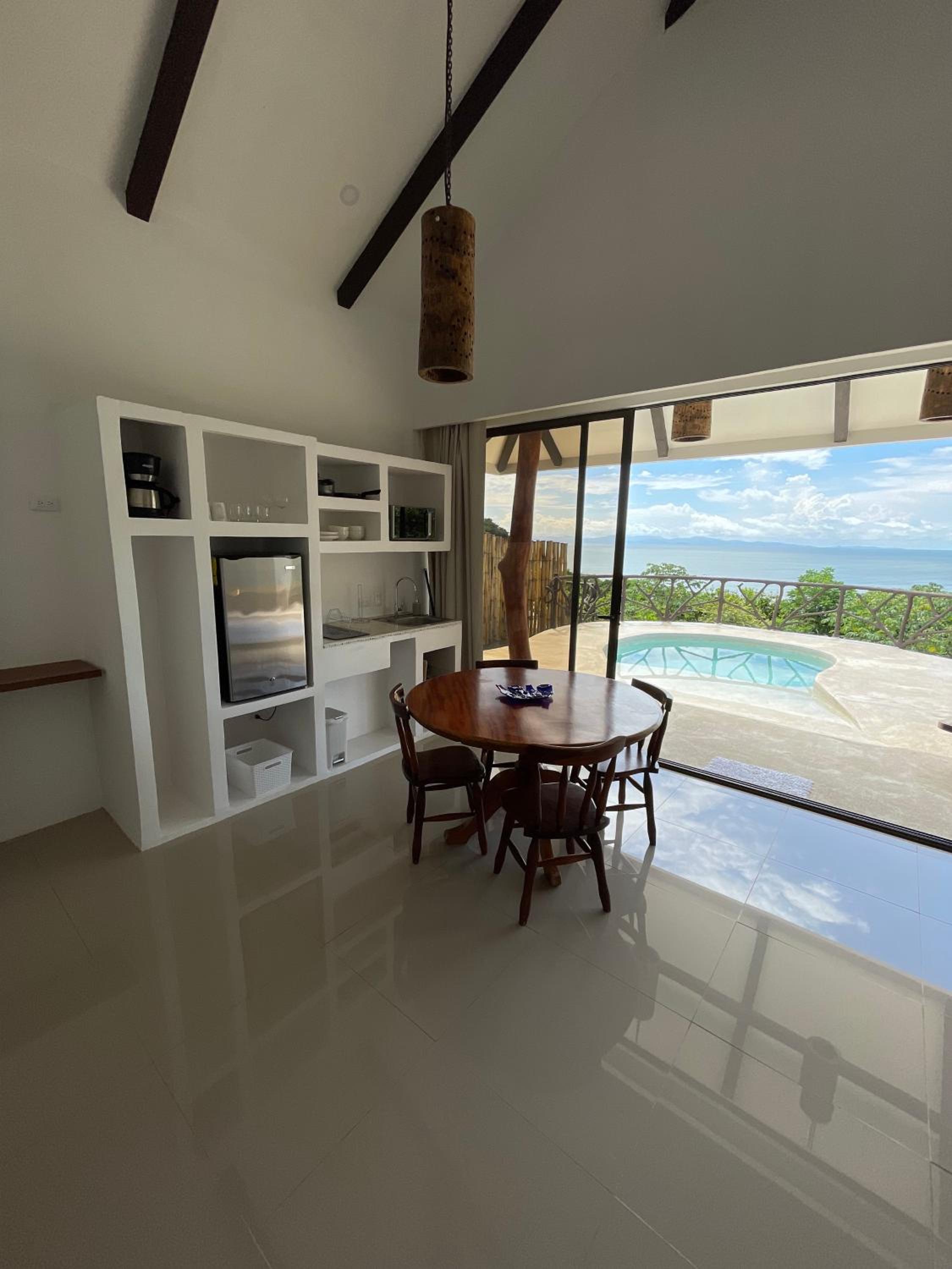 We stayed in Suite 1 for a 2 night stay 1.5hrs from San Jose - Spacious accommodation, 2 big comfortable beds. Fantastic views across the sea. Plunge pool 26c water temperature. Great communications and helpful advice. Taxi to restaurants 5,000 colones, 10$ each way. Tiko Restaurant Mirador 10 mins, has fantastic sunset views (pictured) wildlife and good food. La Oursa also recommended by owners was also good.