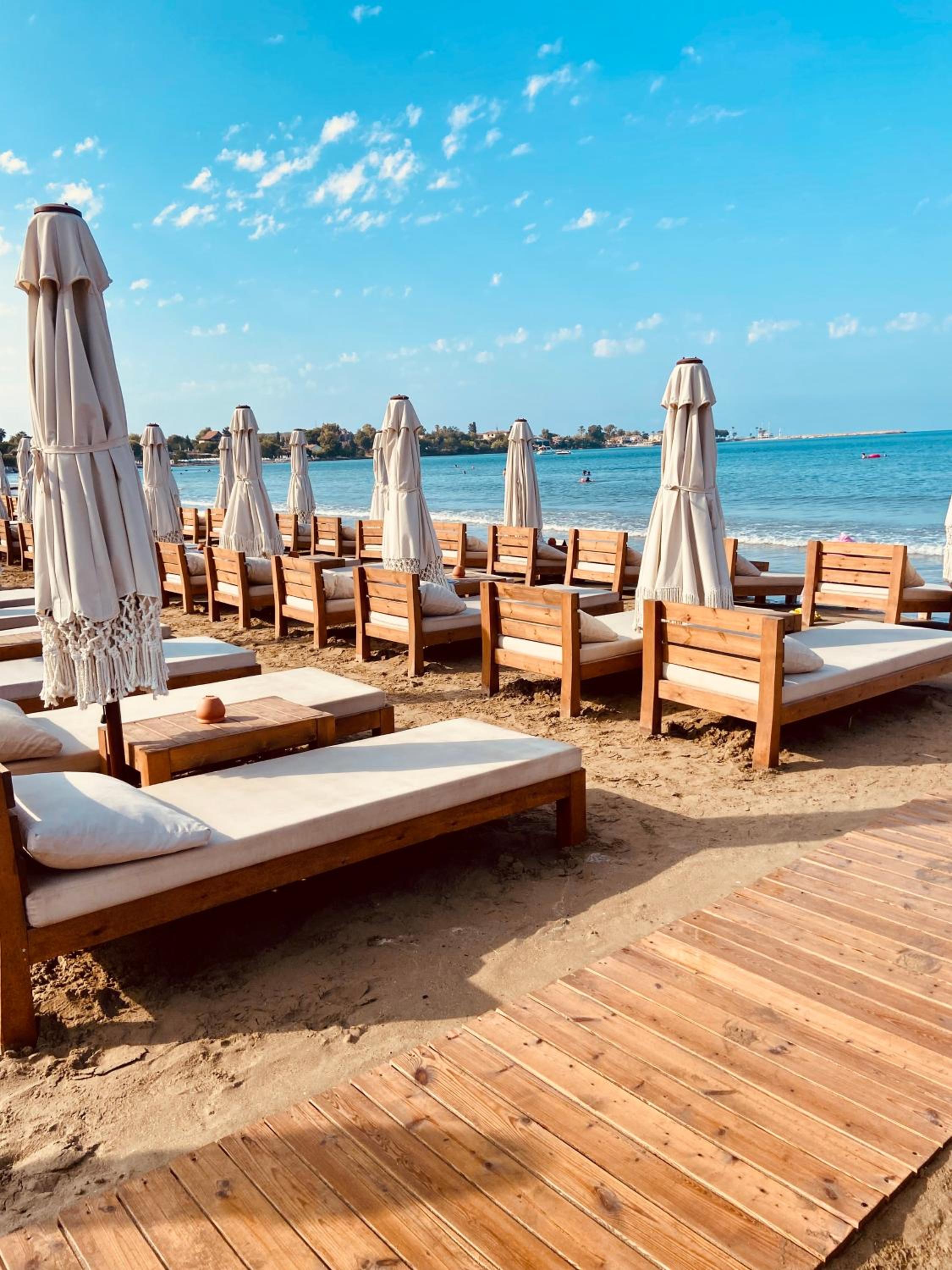 Direkte Strandlage, sehr bequeme Sonnenliegen.