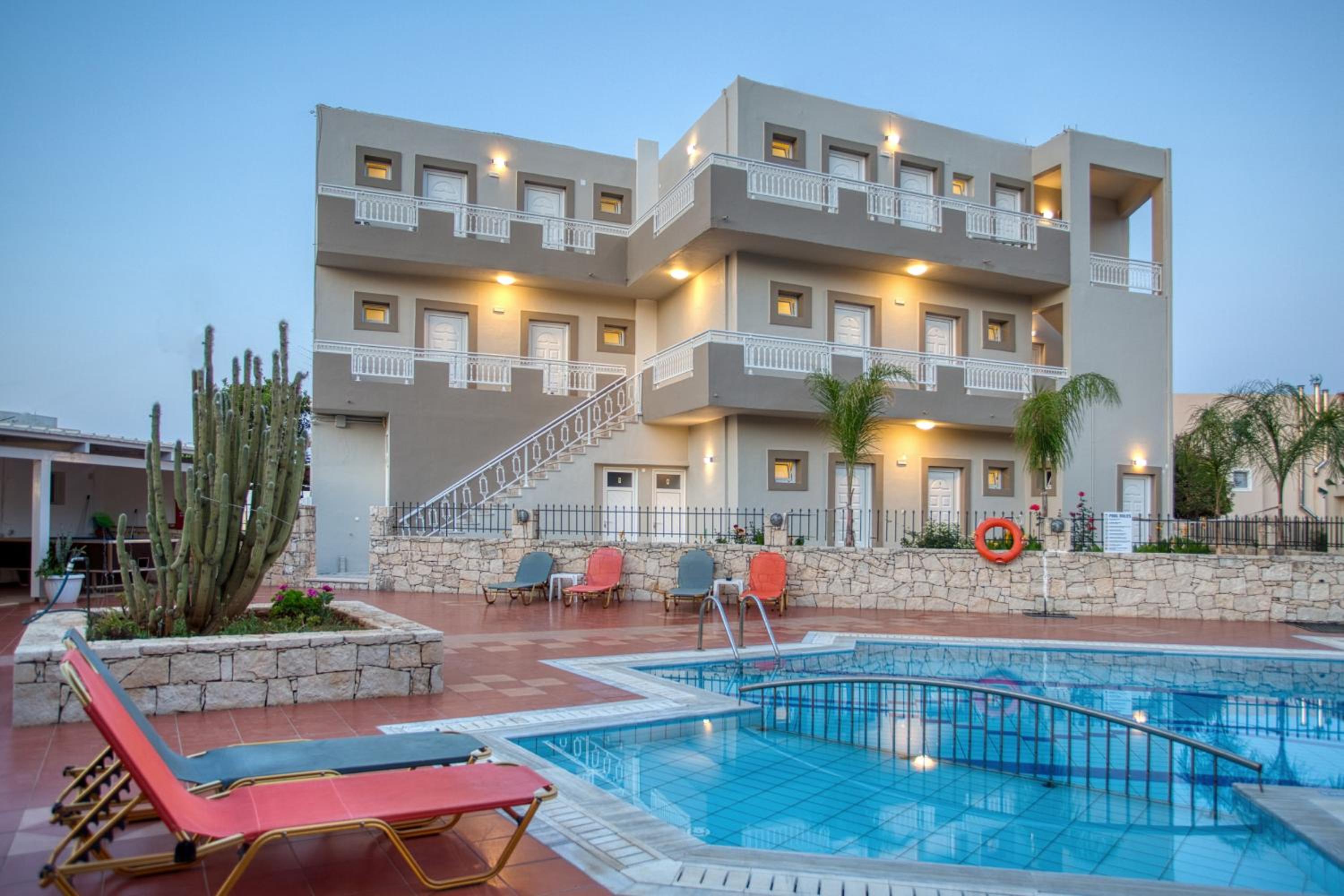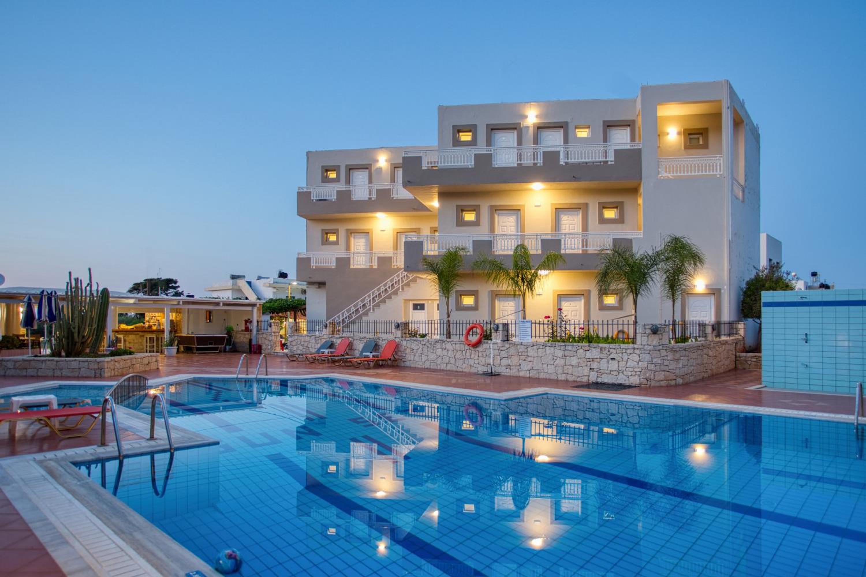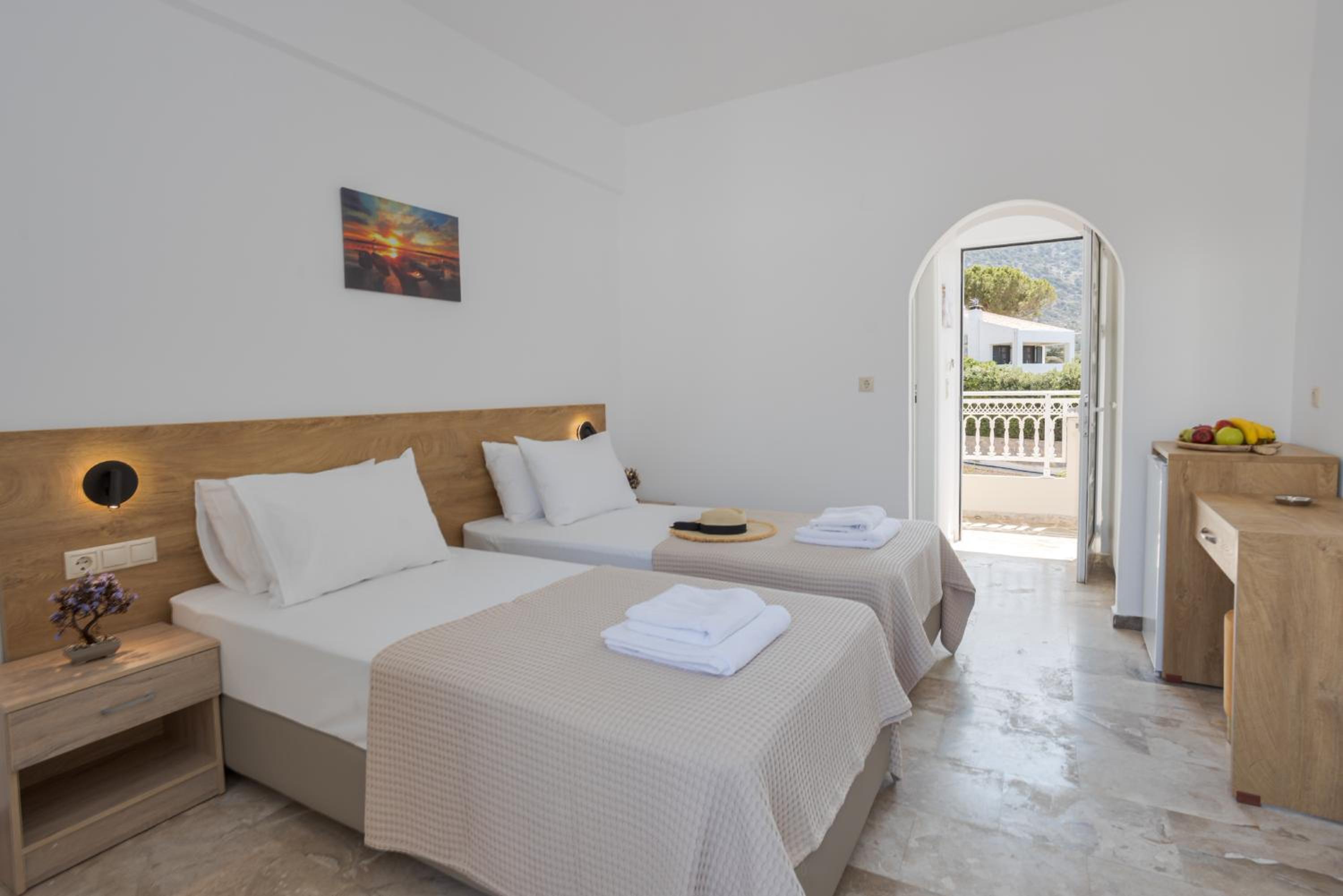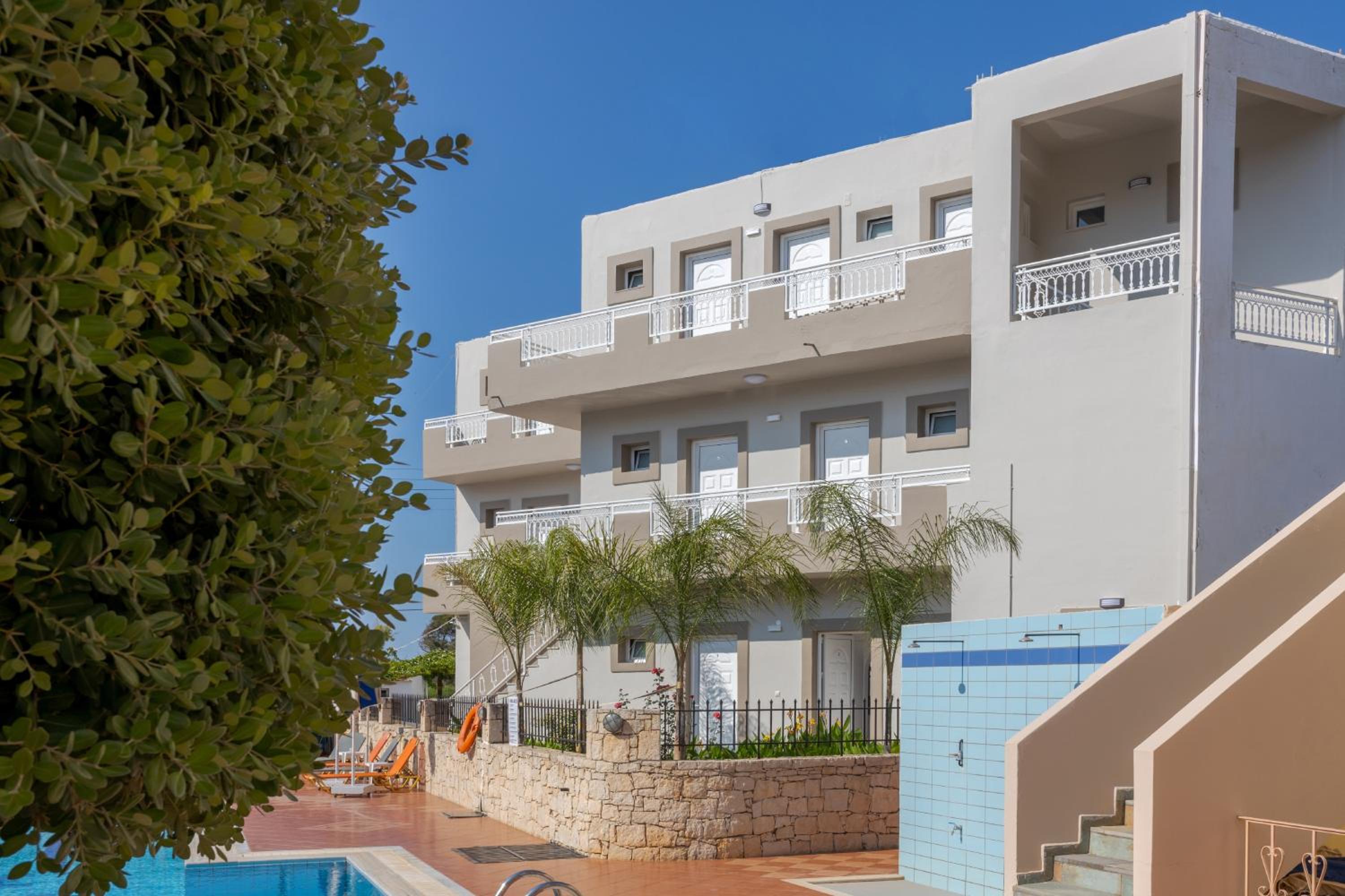 Super nice owners, super aircon quiet and efficient (and I hate aircon), nice pool and super modern rooms with a nice little balcony w/ ocean view, there is also a nice taverna next door and a little supermarket.