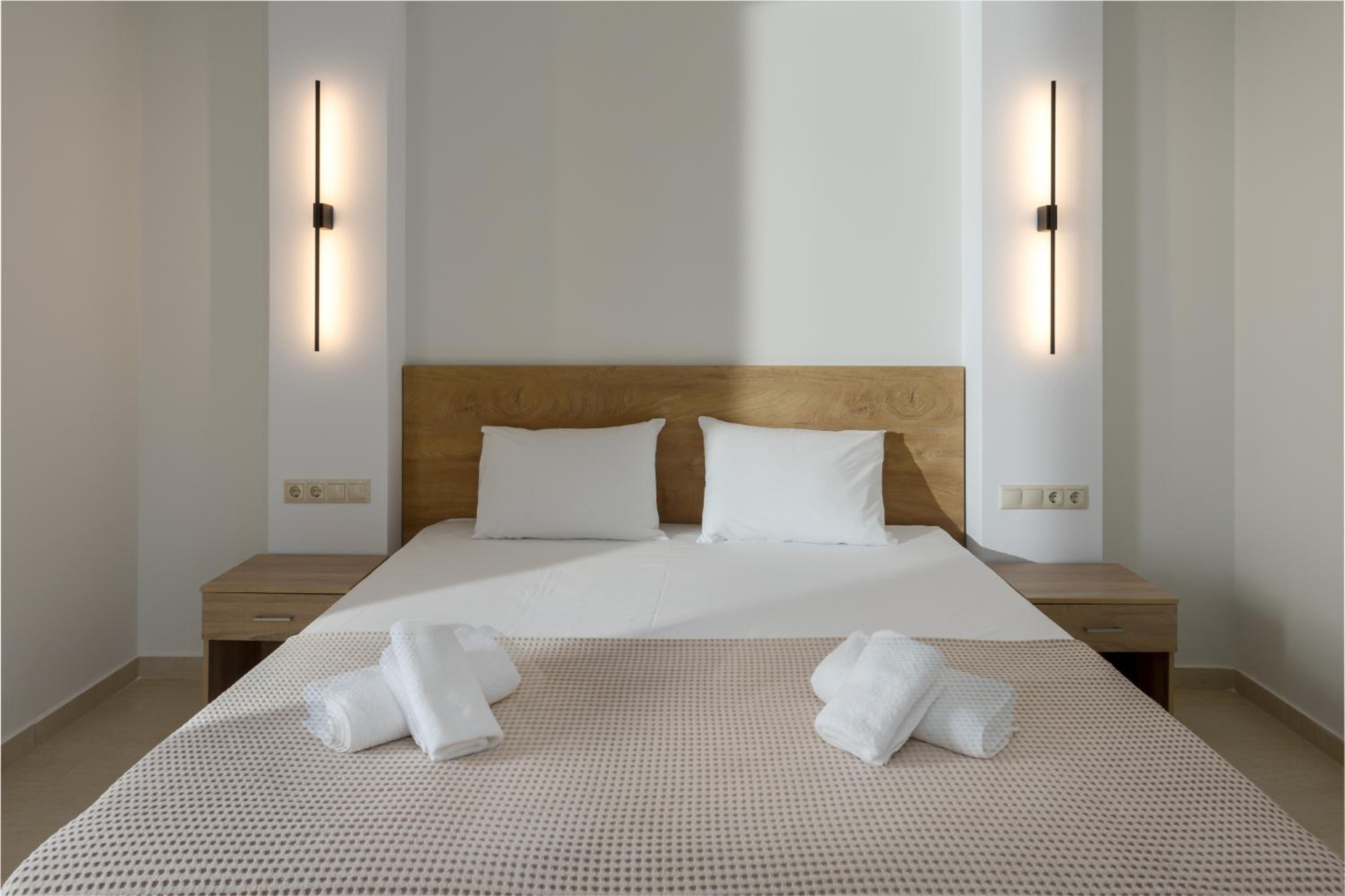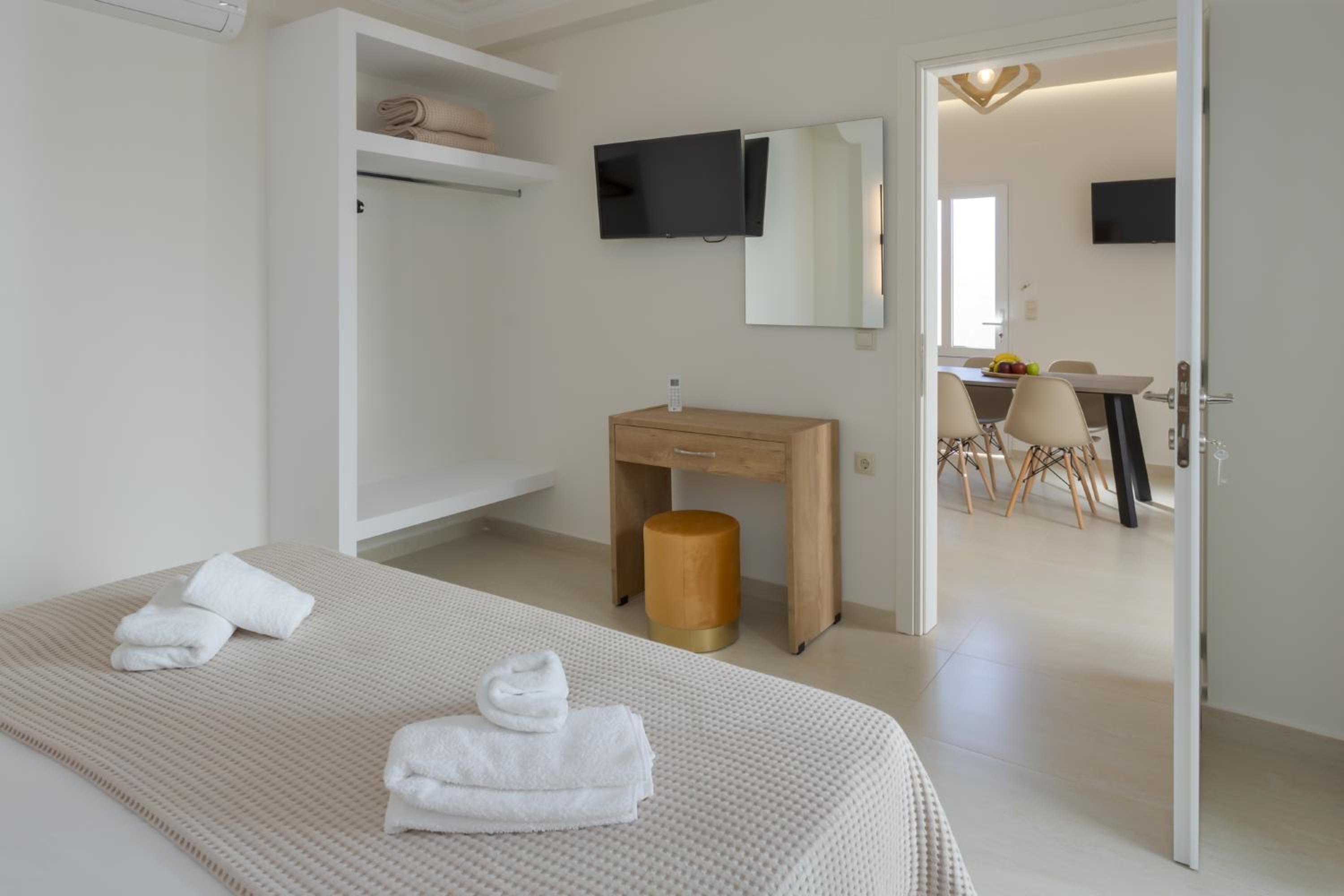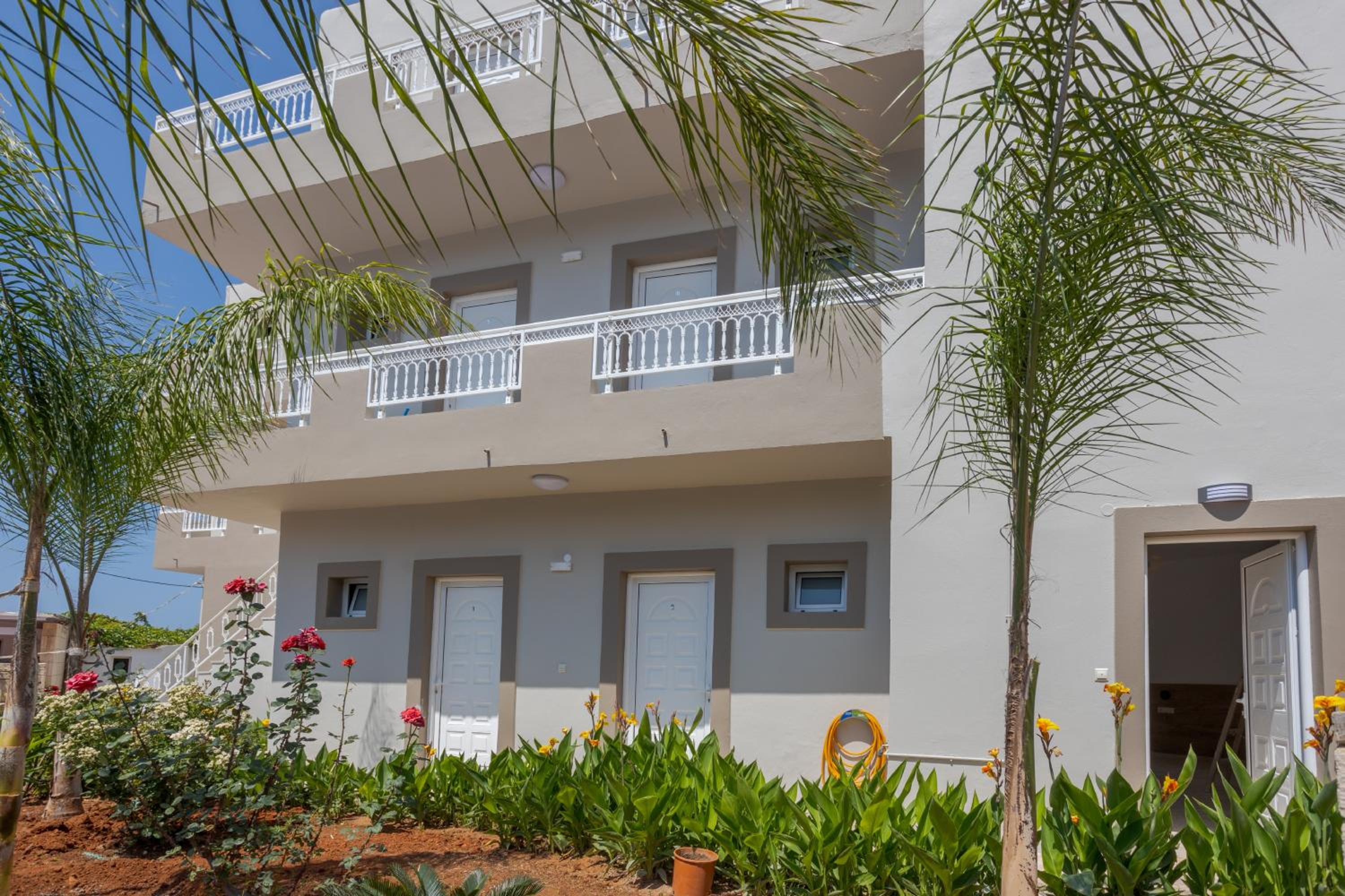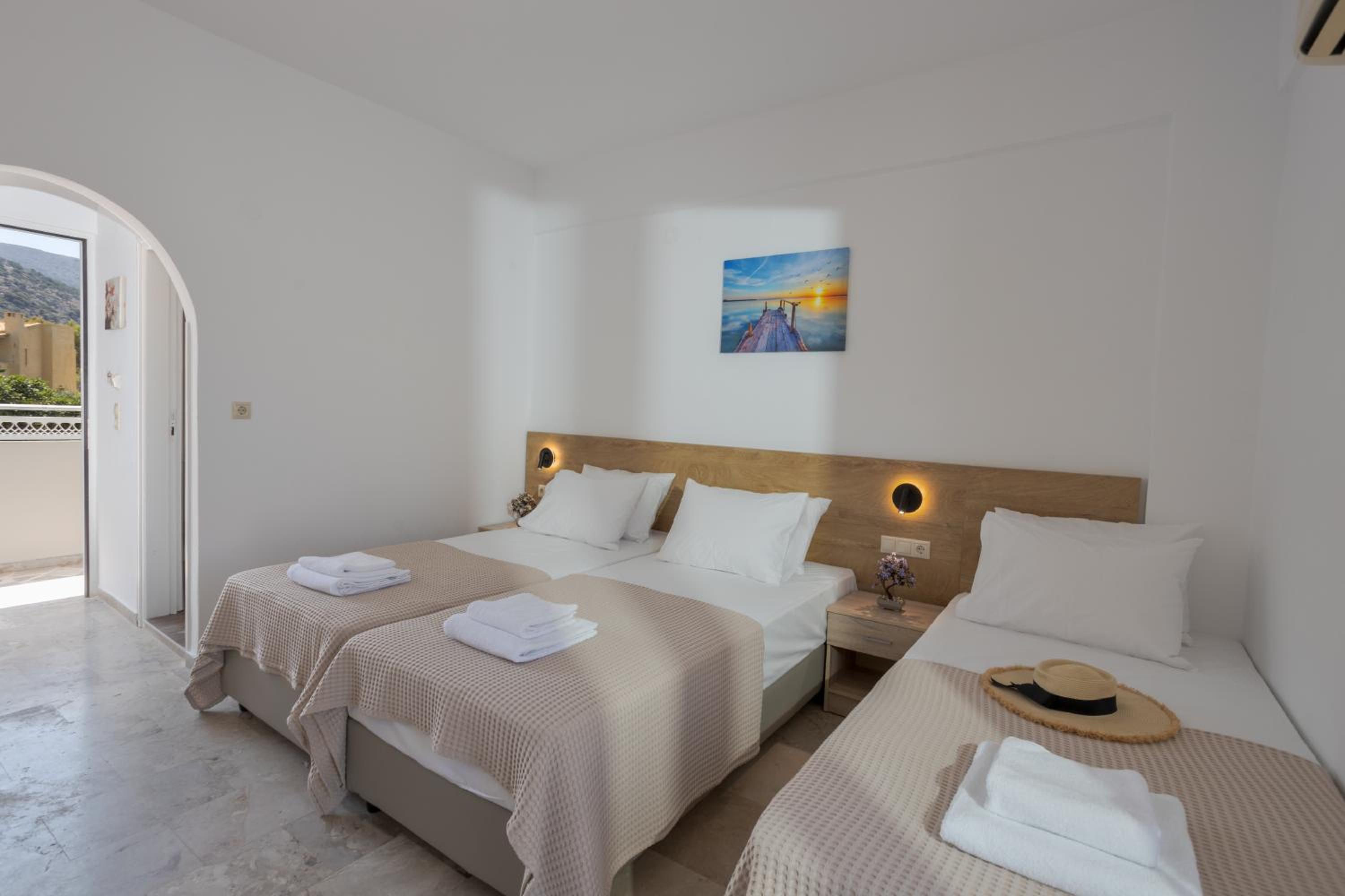 Super nice owners, super aircon quiet and efficient (and I hate aircon), nice pool and super modern rooms with a nice little balcony w/ ocean view, there is also a nice taverna next door and a little supermarket.