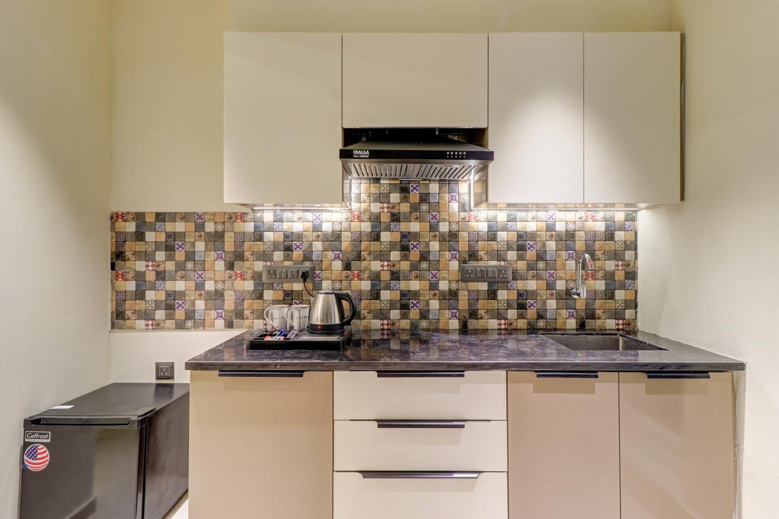 Modern Amenities - Enjoy air-conditioned rooms with essential amenities like a kettle, fridge, and flat-screen TV.