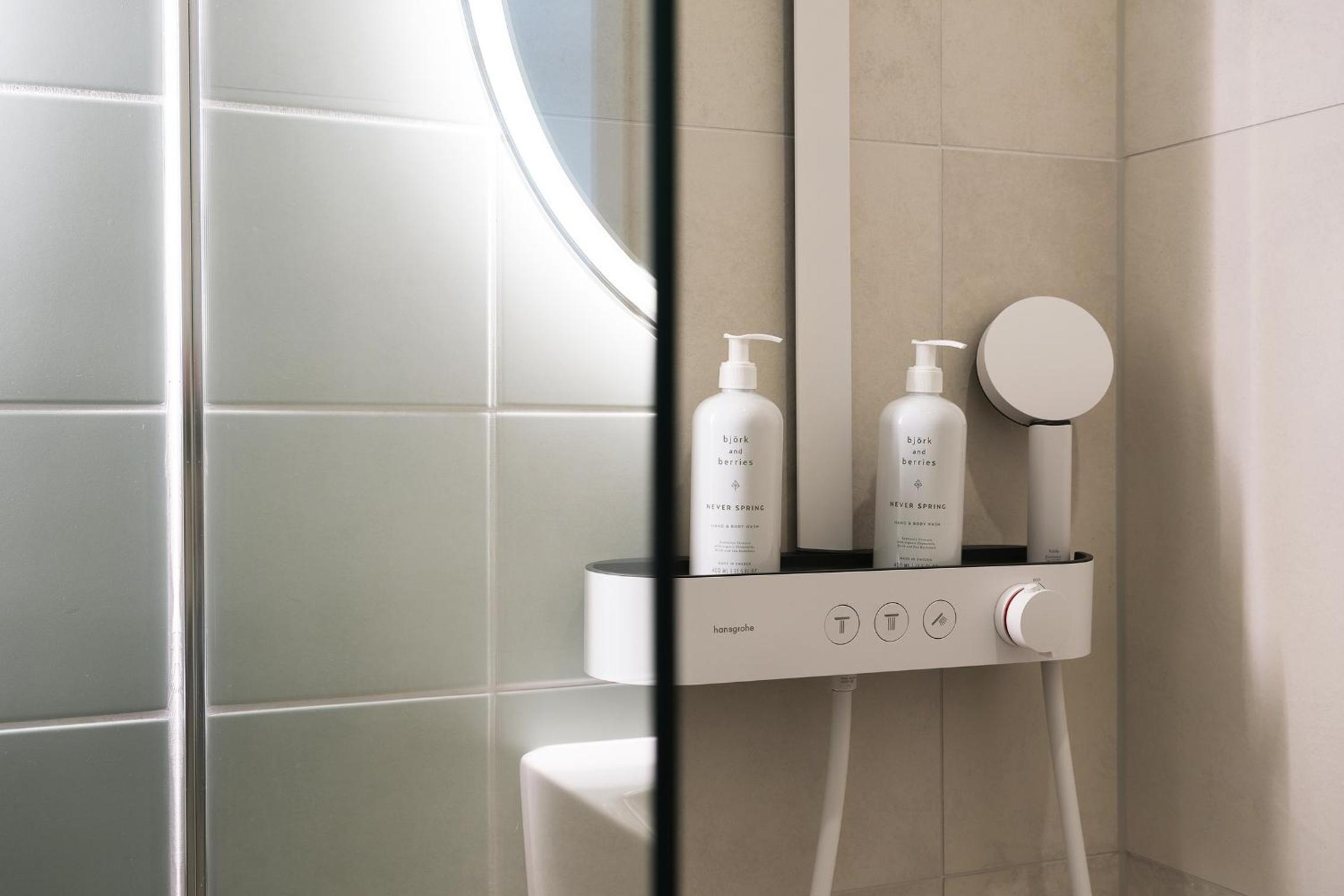 Sehr schöne Einrichtung. Geschmackvolle Farben und Materialien. Sehr gut duftende Seife und Shampoo! Ökologische Bettwäsche.