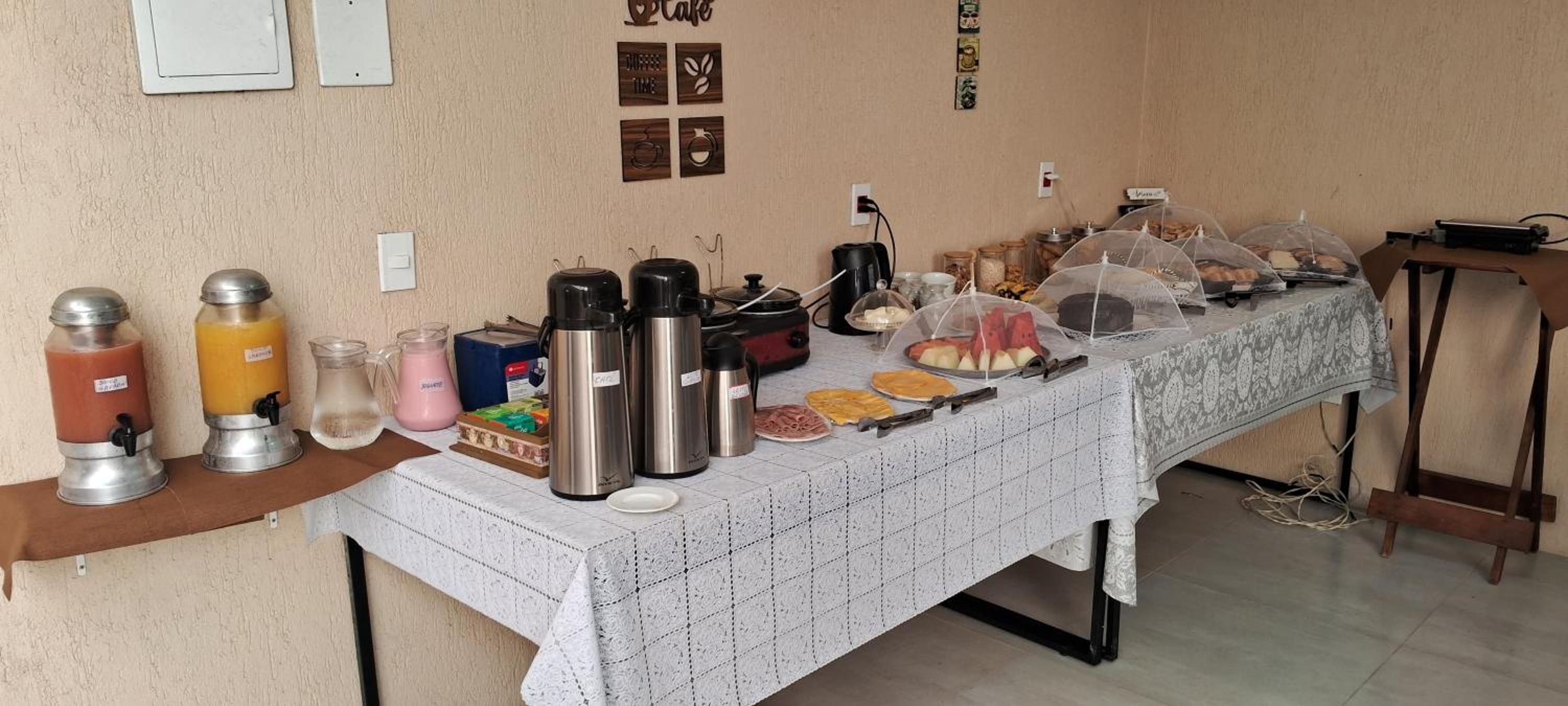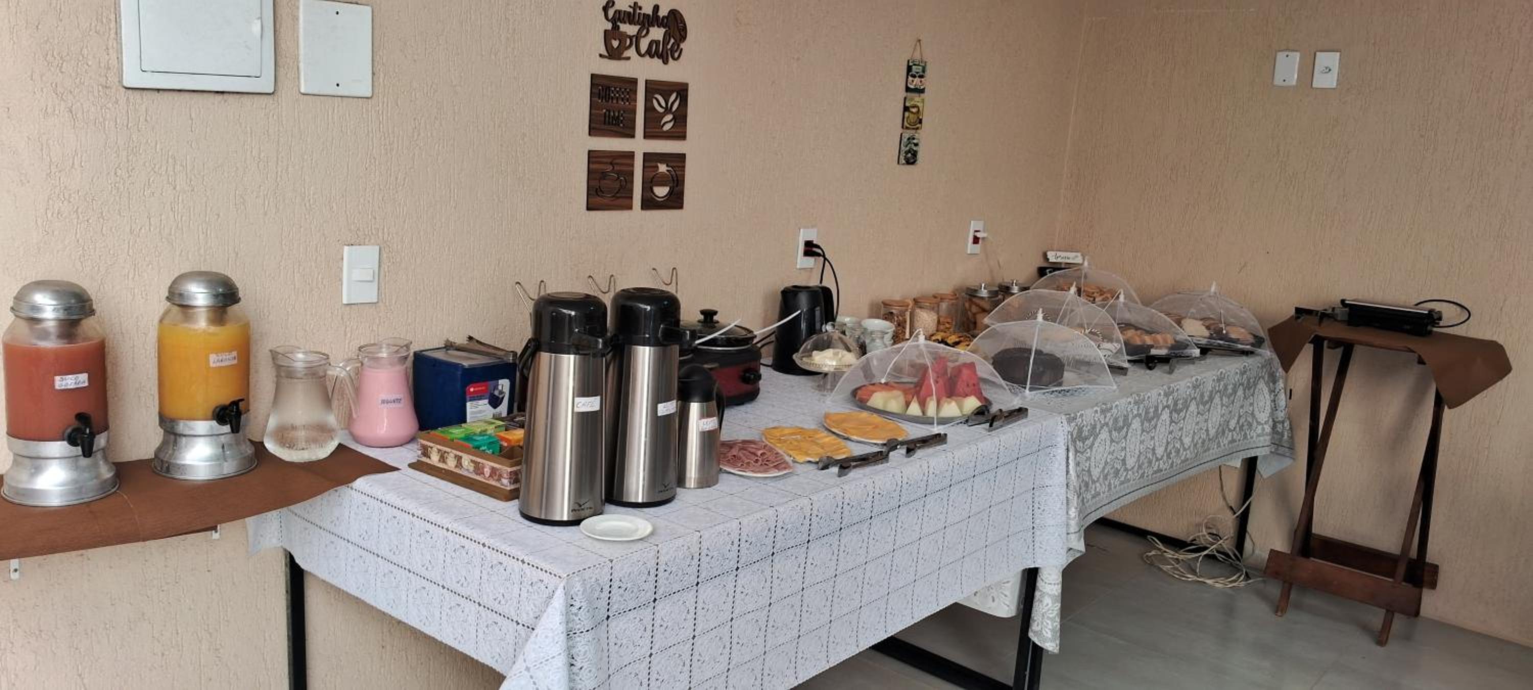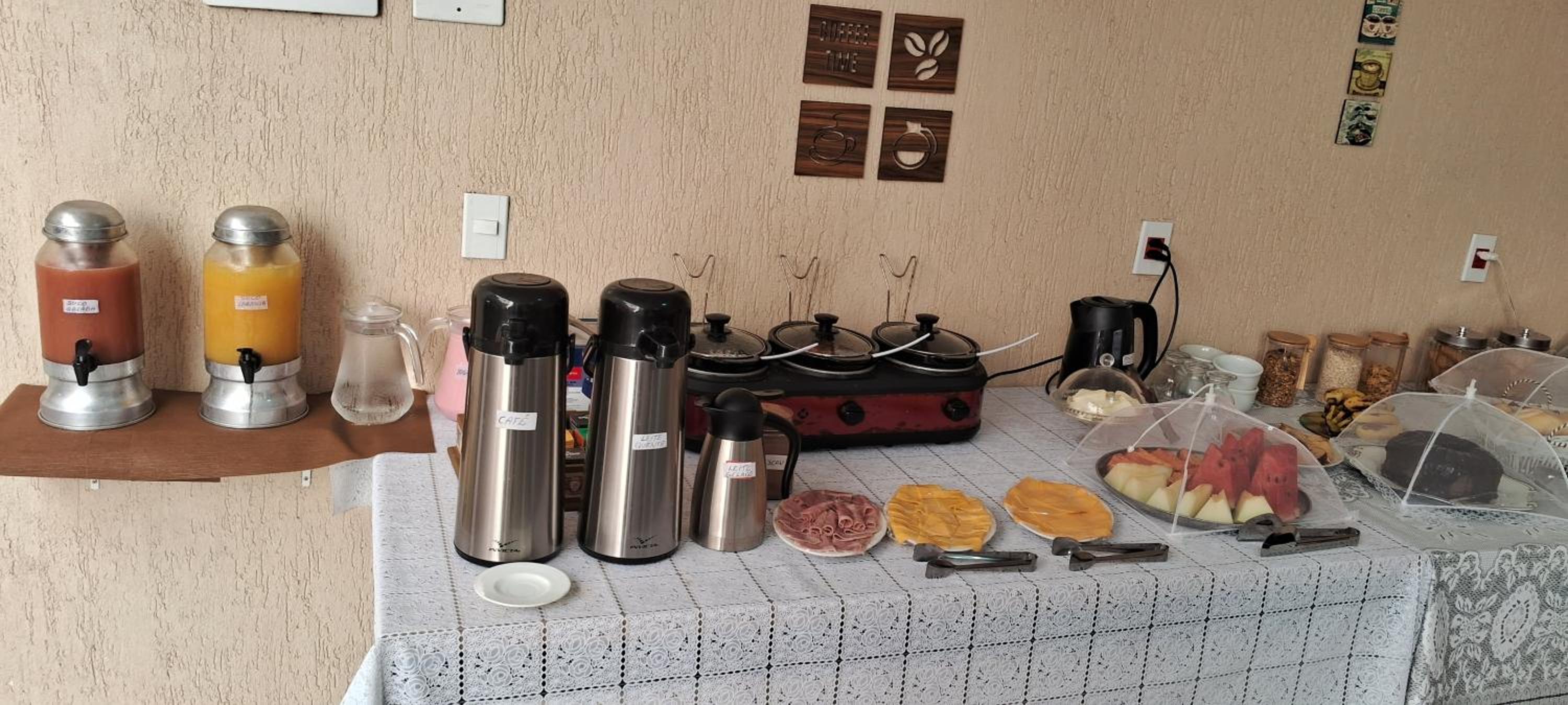 CAFÉ da manhã simples, porém tudo MUITO GOSTOSO e fresquinho! Sucos naturais, pães, pão de queijo, frutas, frios, bolos, cereais , chá, ovos mexidos e etc