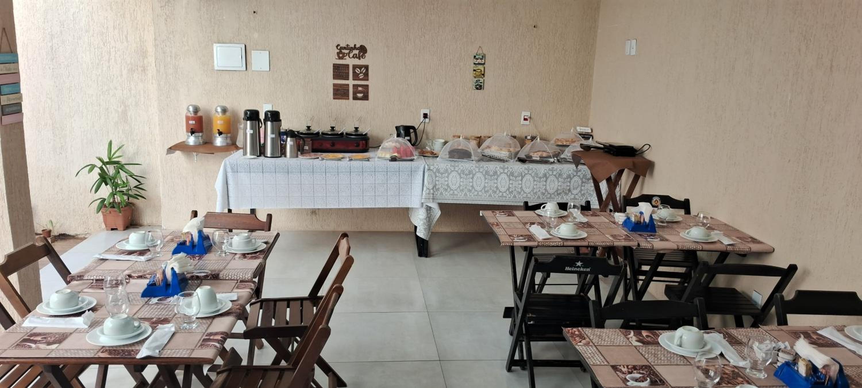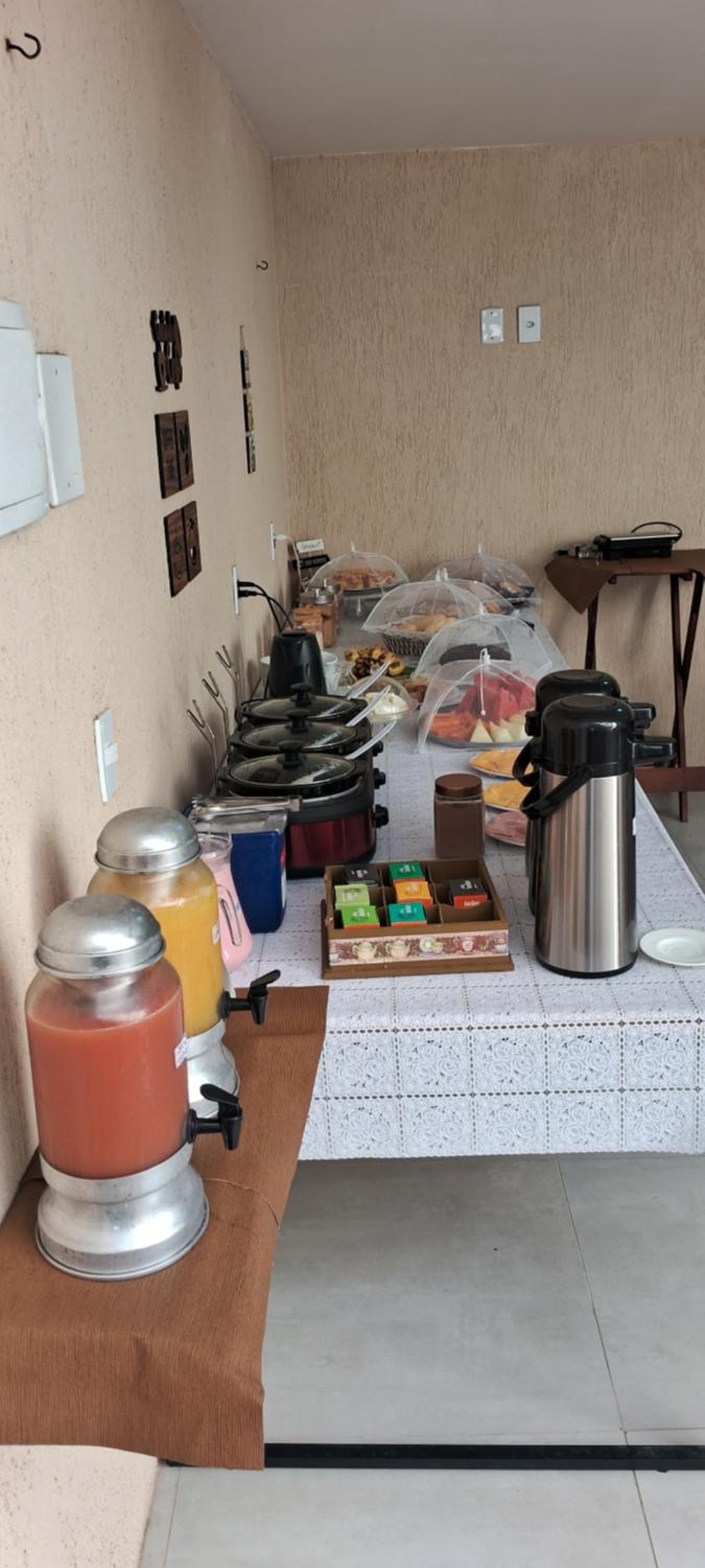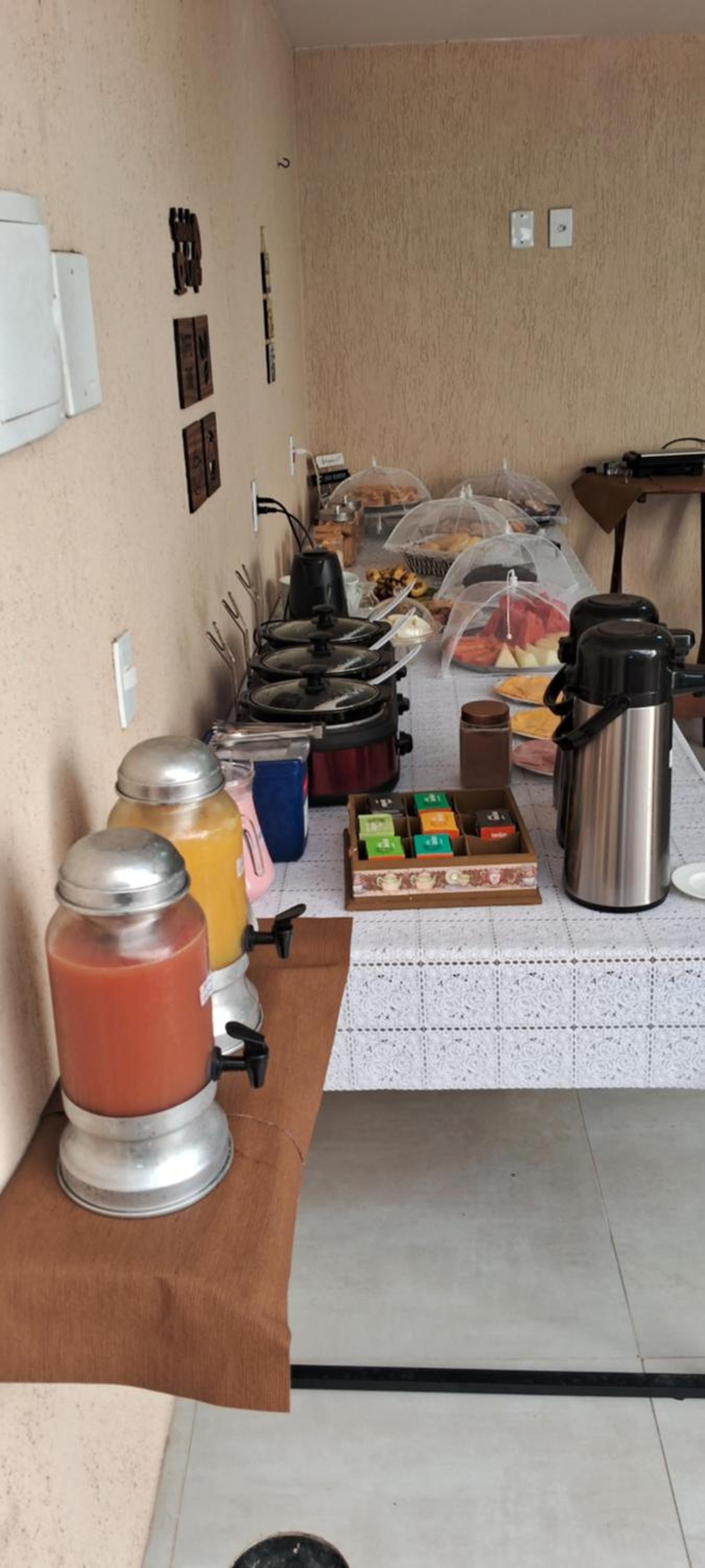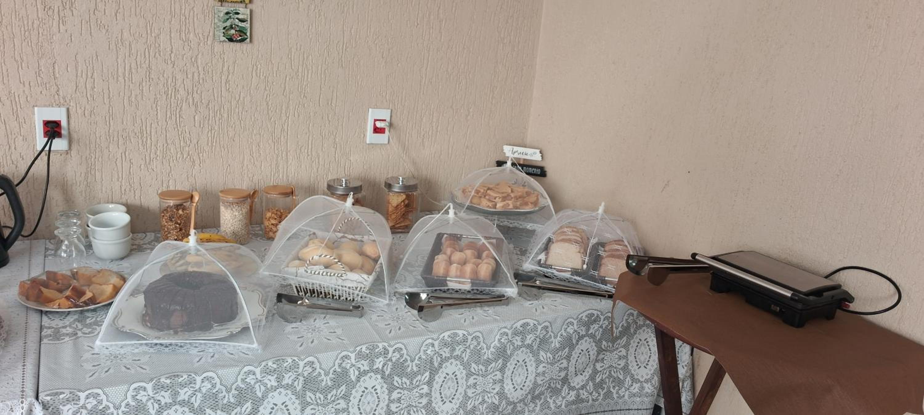 CAFÉ da manhã simples, porém tudo MUITO GOSTOSO e fresquinho! Sucos naturais, pães, pão de queijo, frutas, frios, bolos, cereais , chá, ovos mexidos e etc