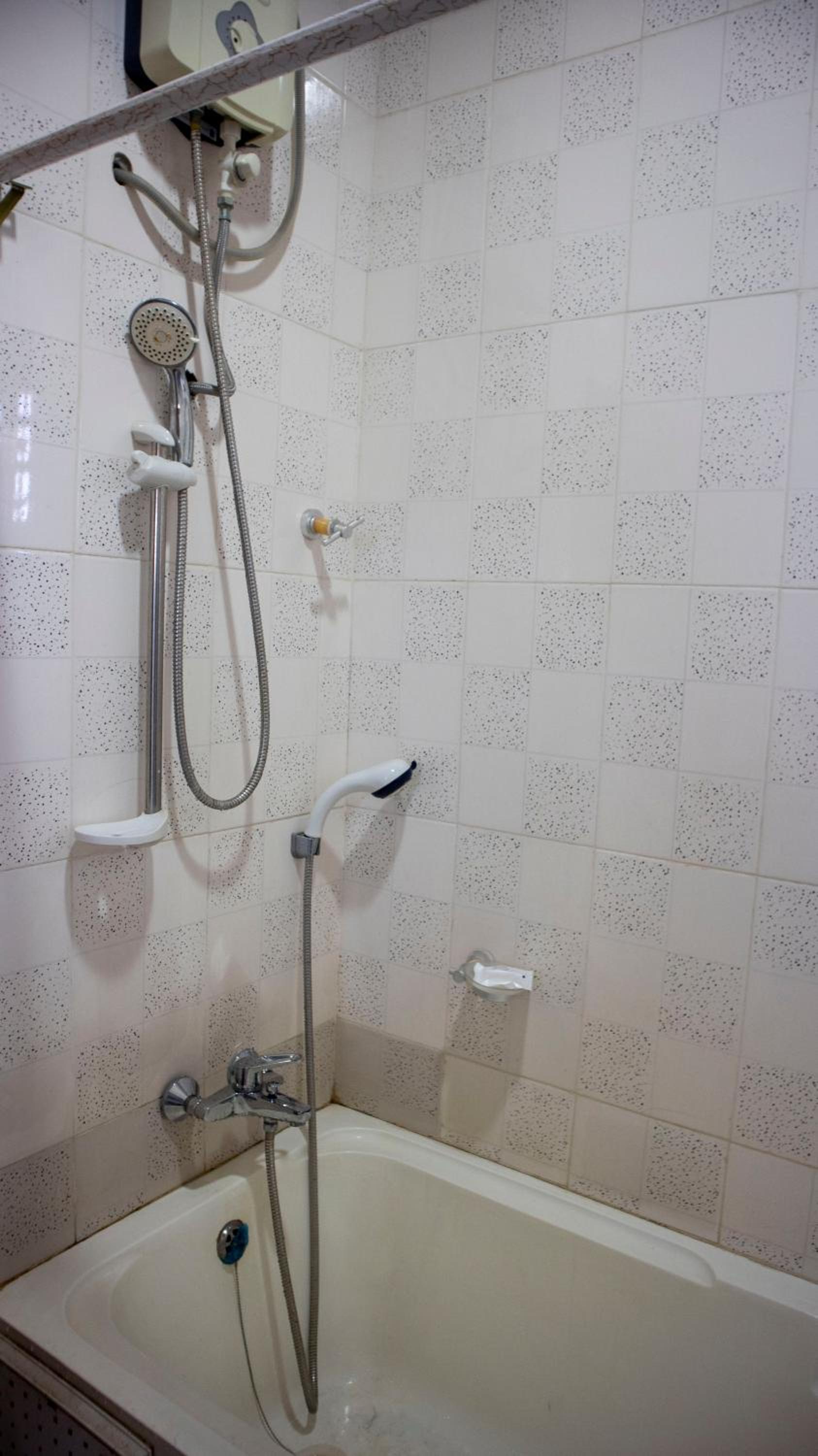 Slitet ofräscht badrum med spolning som inte fungerade optimalt.