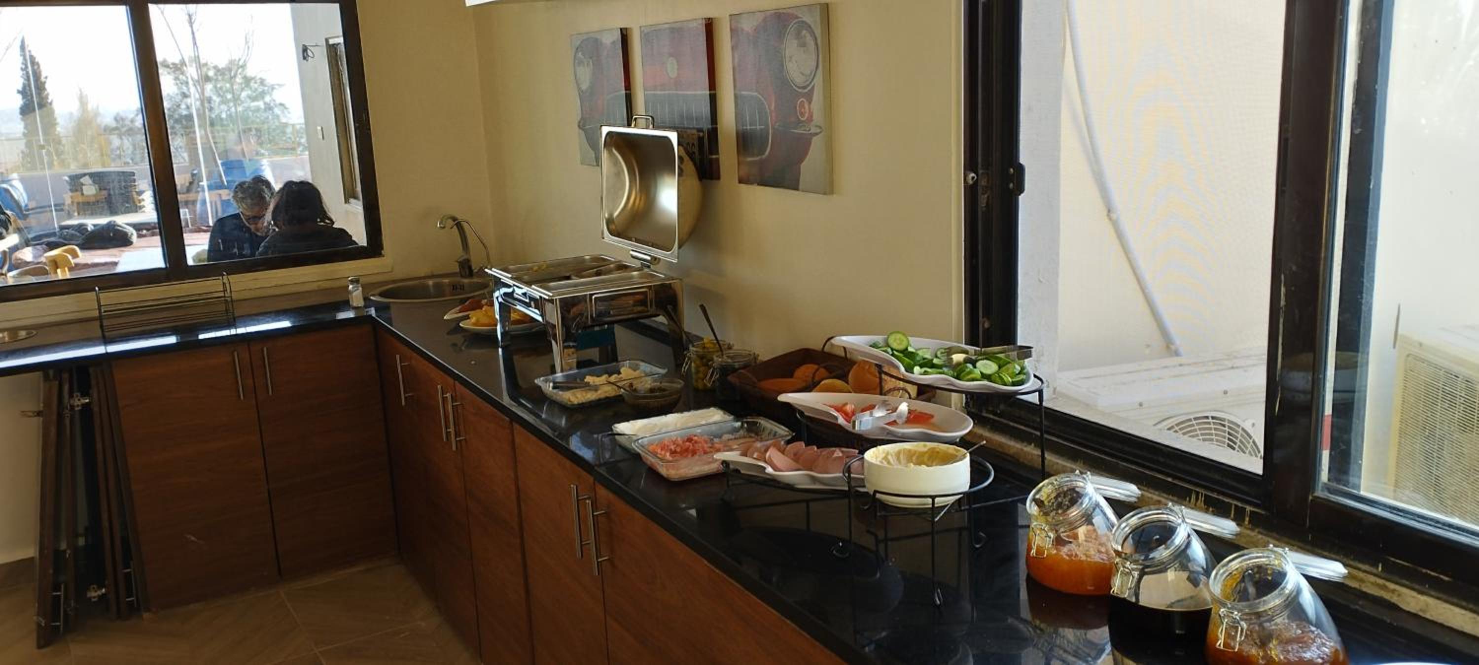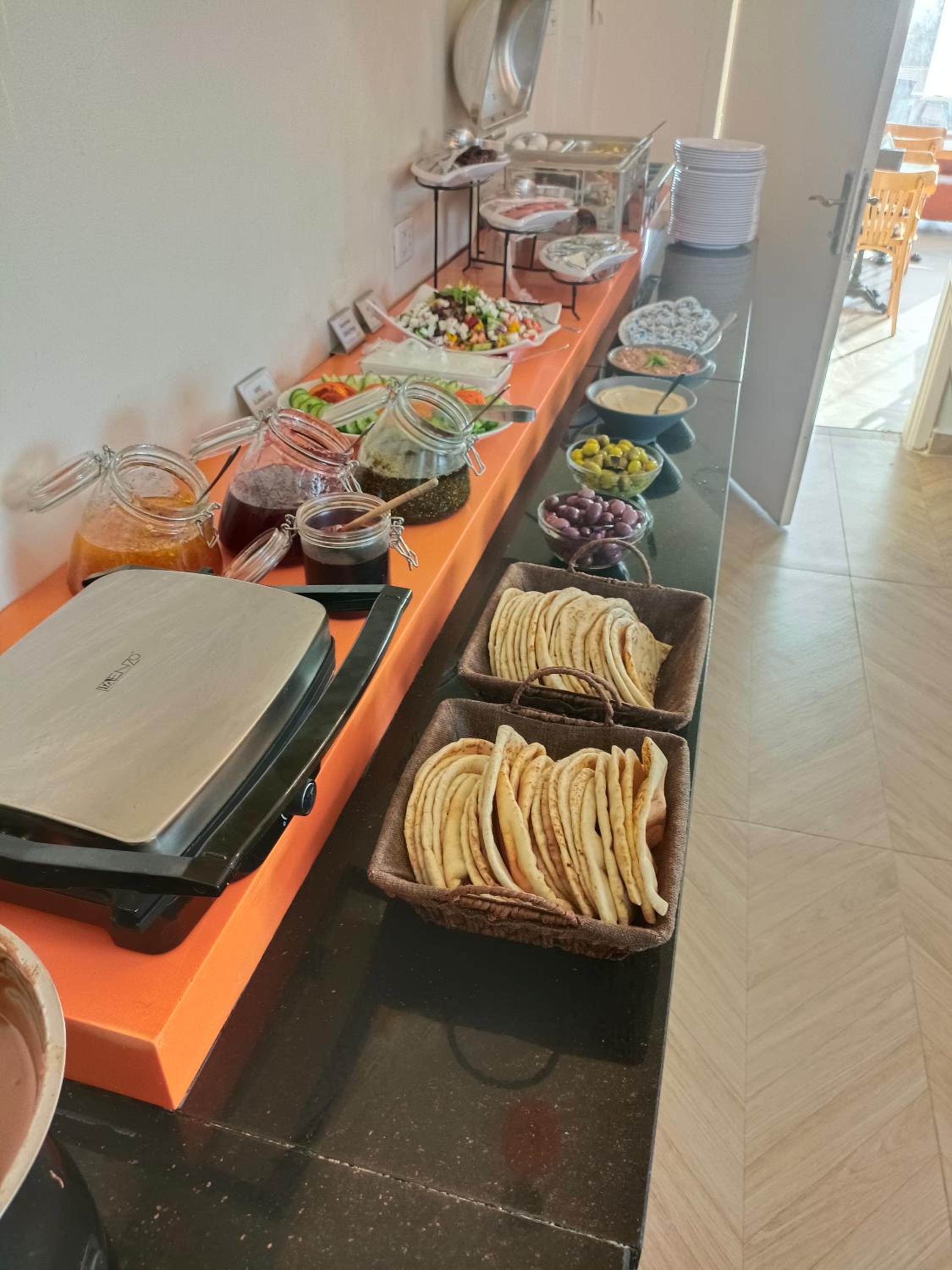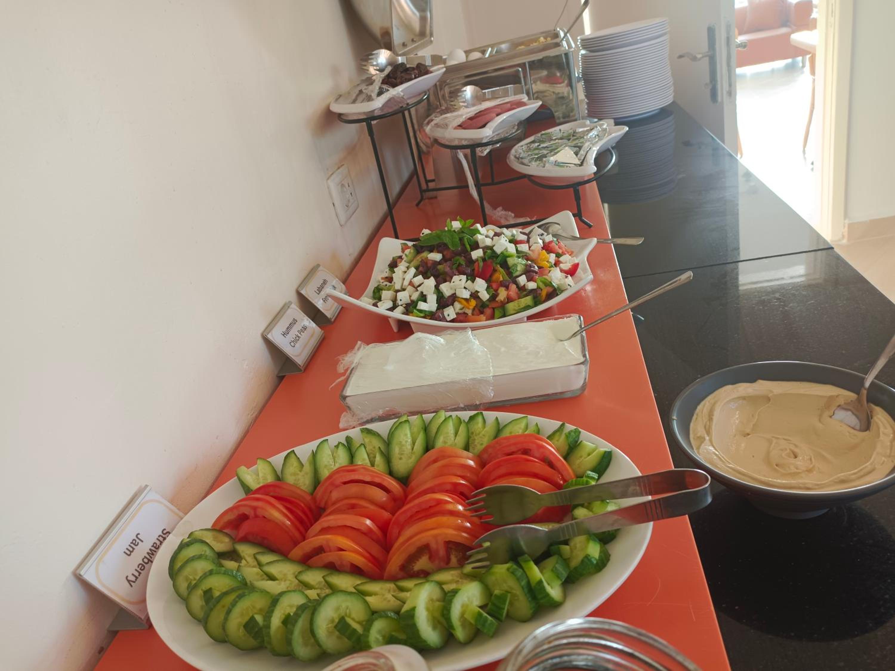 Colazione a buffett abbondante, sia dolce che salata, con yogurt, salse, datteri, pane, marmellate, cioccolata, verdure, salumi e formaggi, oltre a bevande calde e fredde, caffè, latte, ecc....
