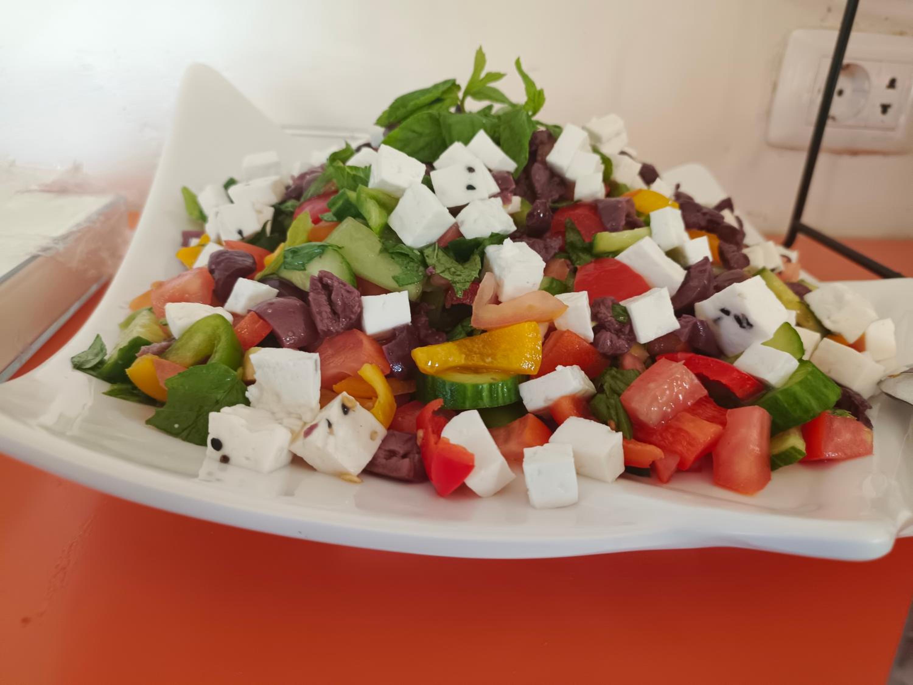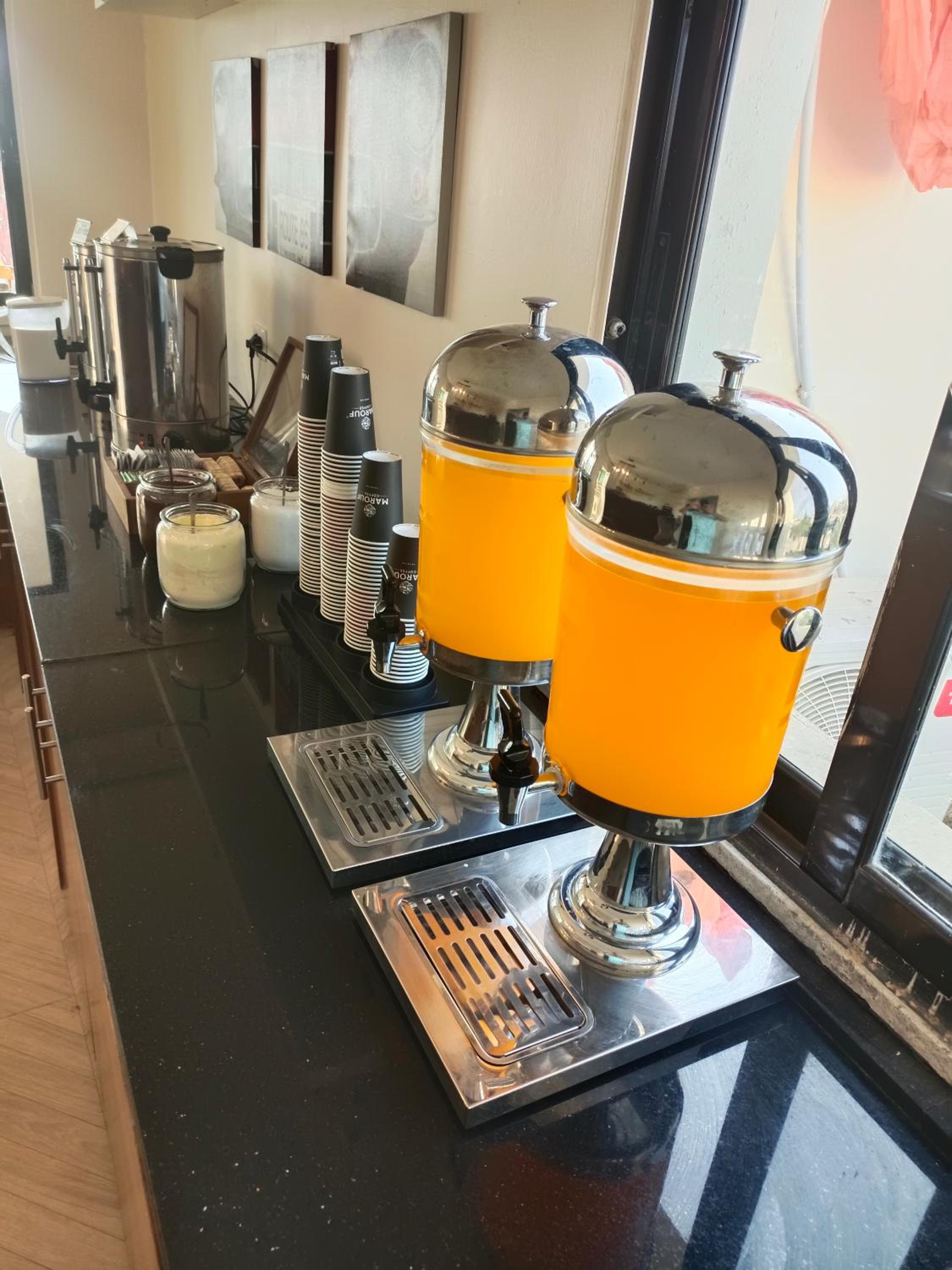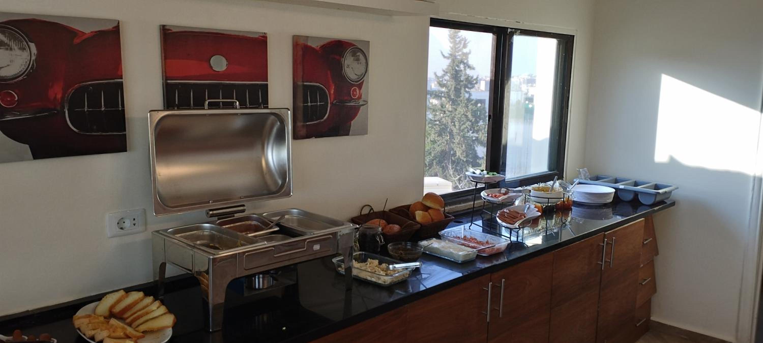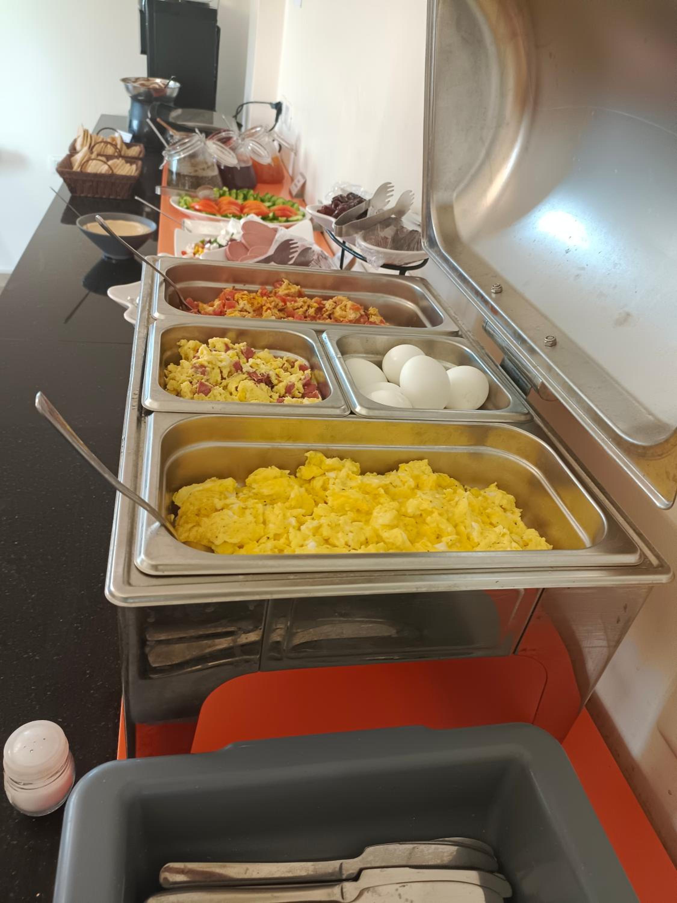 Colazione a buffett abbondante, sia dolce che salata, con yogurt, salse, datteri, pane, marmellate, cioccolata, verdure, salumi e formaggi, oltre a bevande calde e fredde, caffè, latte, ecc....
