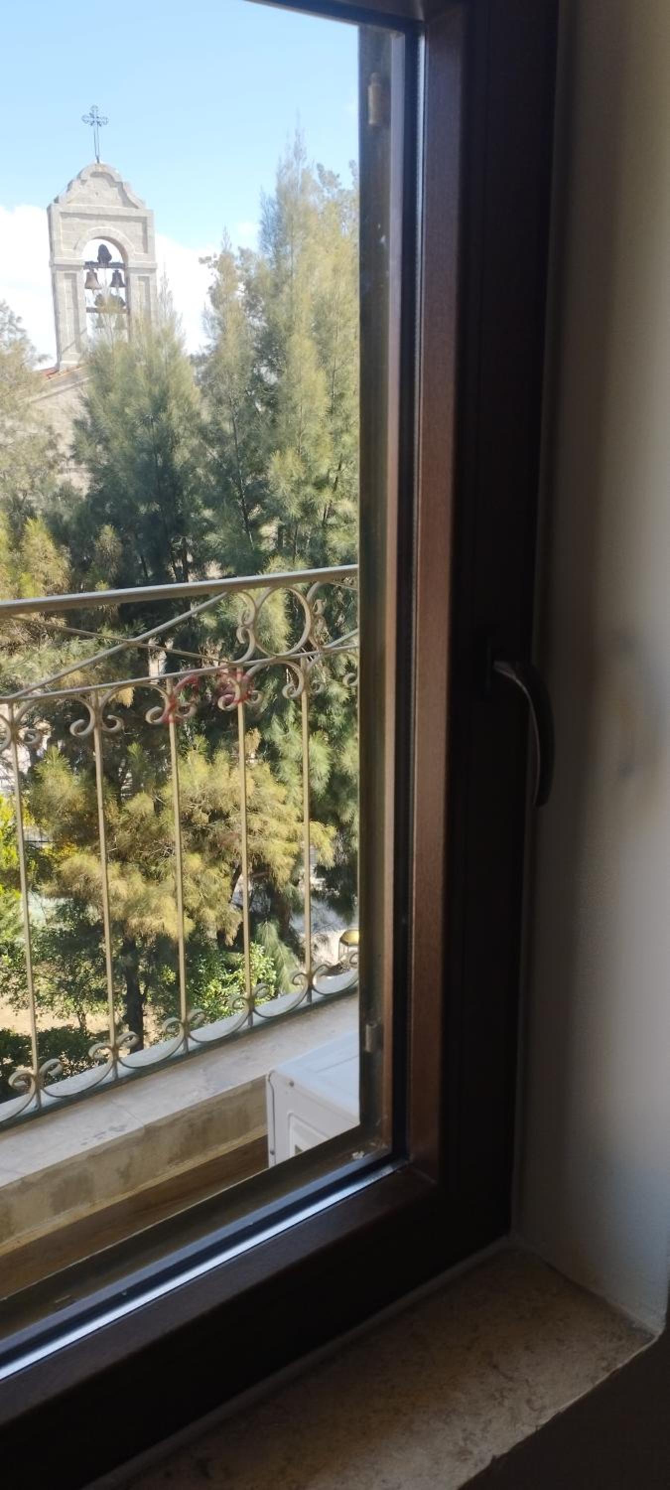 La camera era comoda, con vista su una delle chiese principali di Madaba.