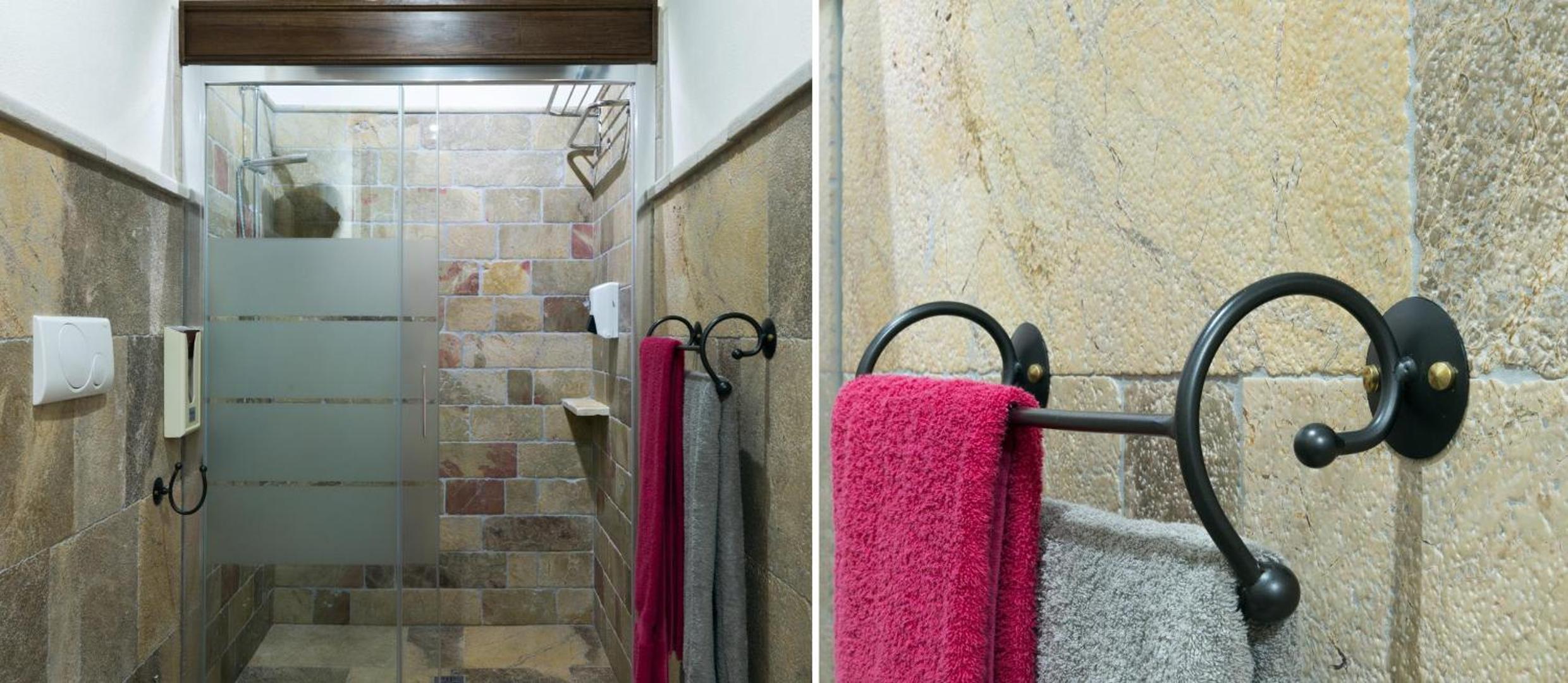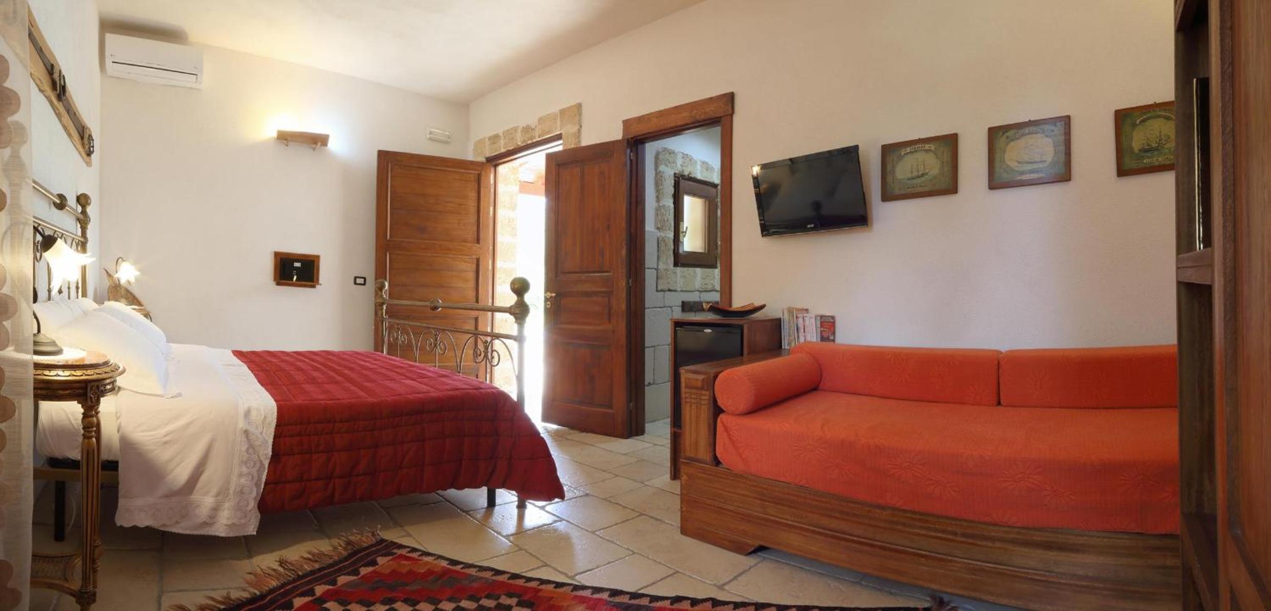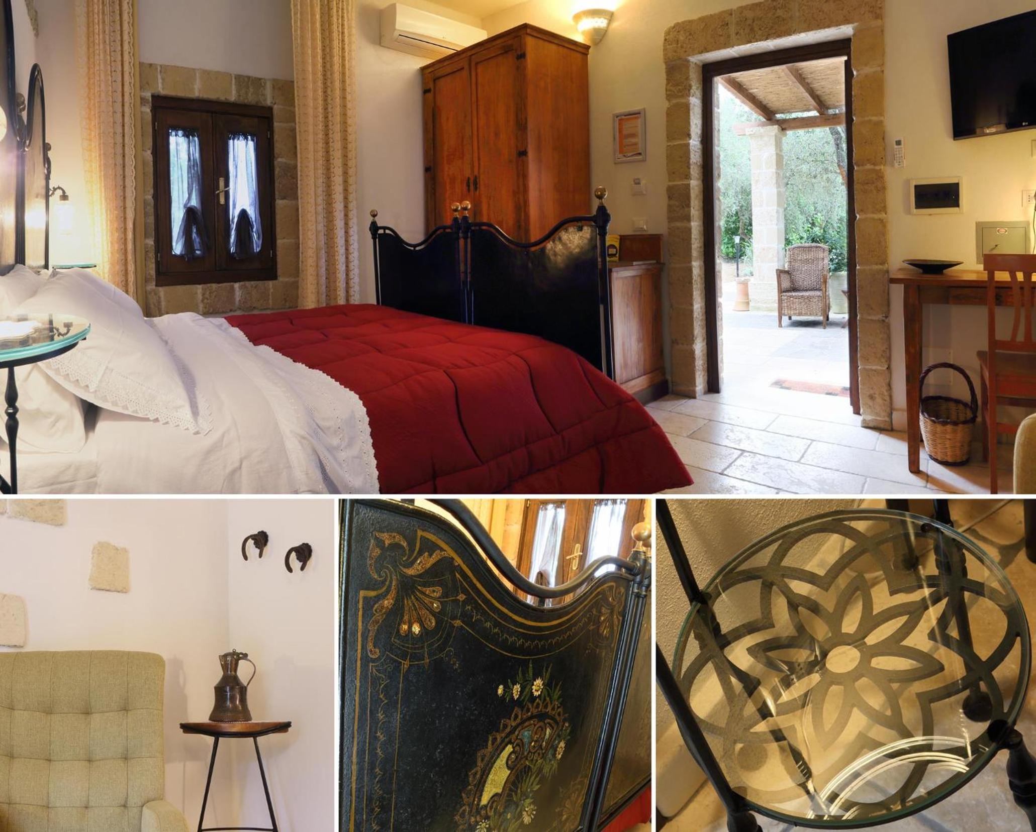 Experience the blend of rustic charm with modern comforts in our country-style rooms, each offering views of the serene olive groves. Relax in a cozy setting with whitewashed walls, natural-wood furniture, and essential amenities like an LCD TV and air conditioning.