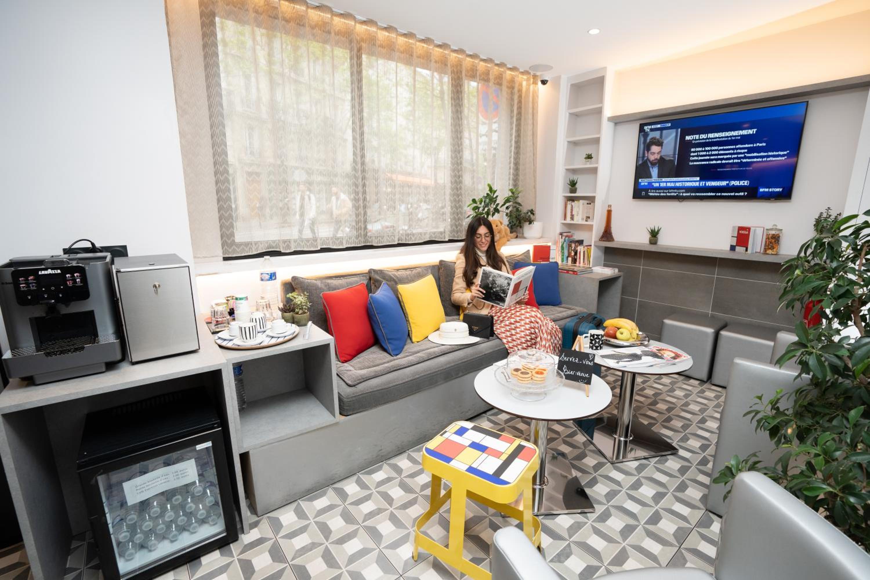 Guests can relax in the hotel's furnished patio and flowery courtyard, providing a peaceful retreat from the bustling city. These serene outdoor areas offer a perfect setting to unwind after a day of exploring the vibrant streets of Paris.