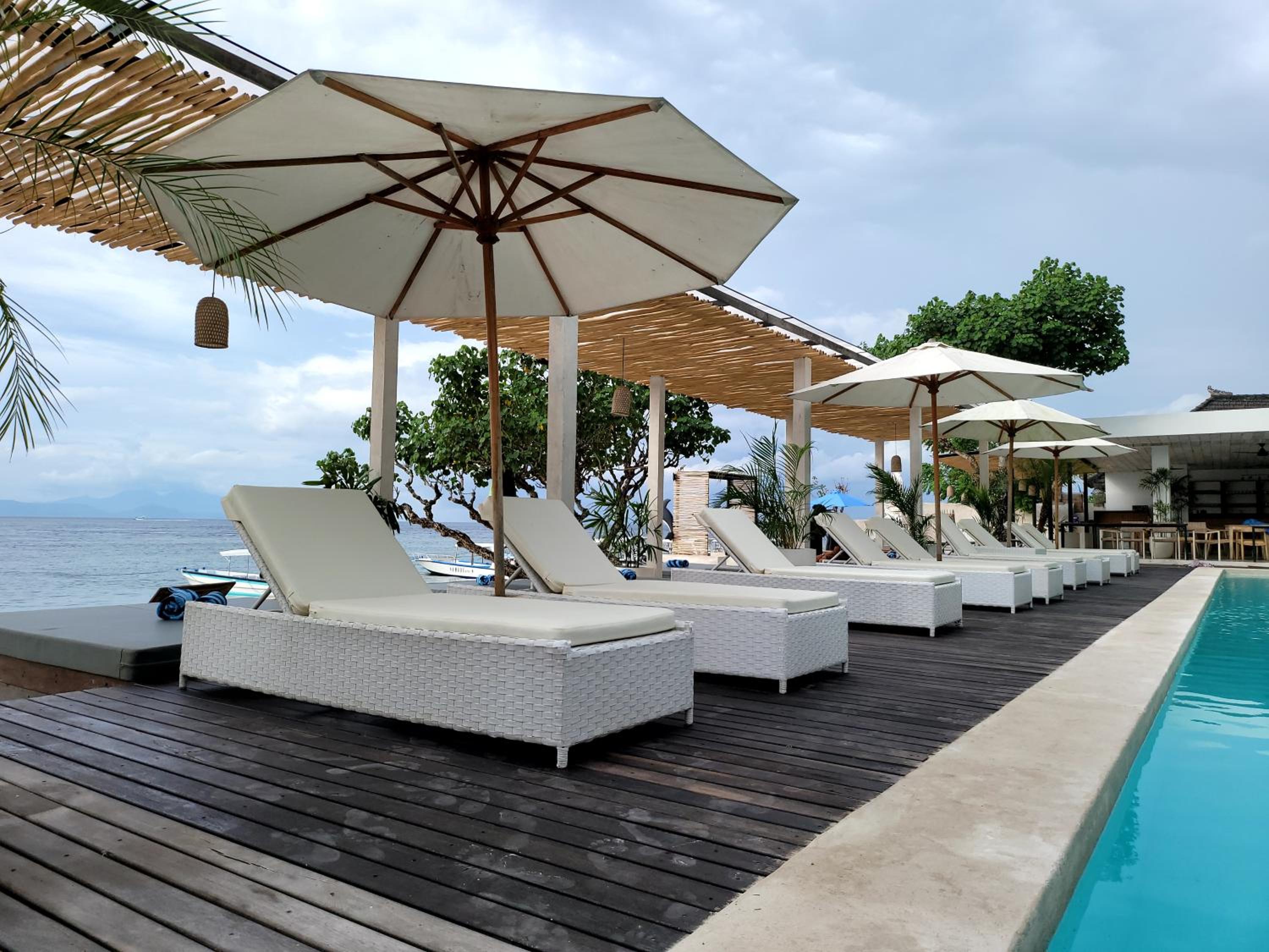 We had the end room right next to the beach. It was just amazing sitting on our patio, the pool infront & beach at the side. Breakfast was best weve had so far! Lovely village feel outside, no where near the hussle and bussle of Bali. Bathroom was a little dated but adequate. They were renovating some rooms while we were there so hopefully a nice fresh look.