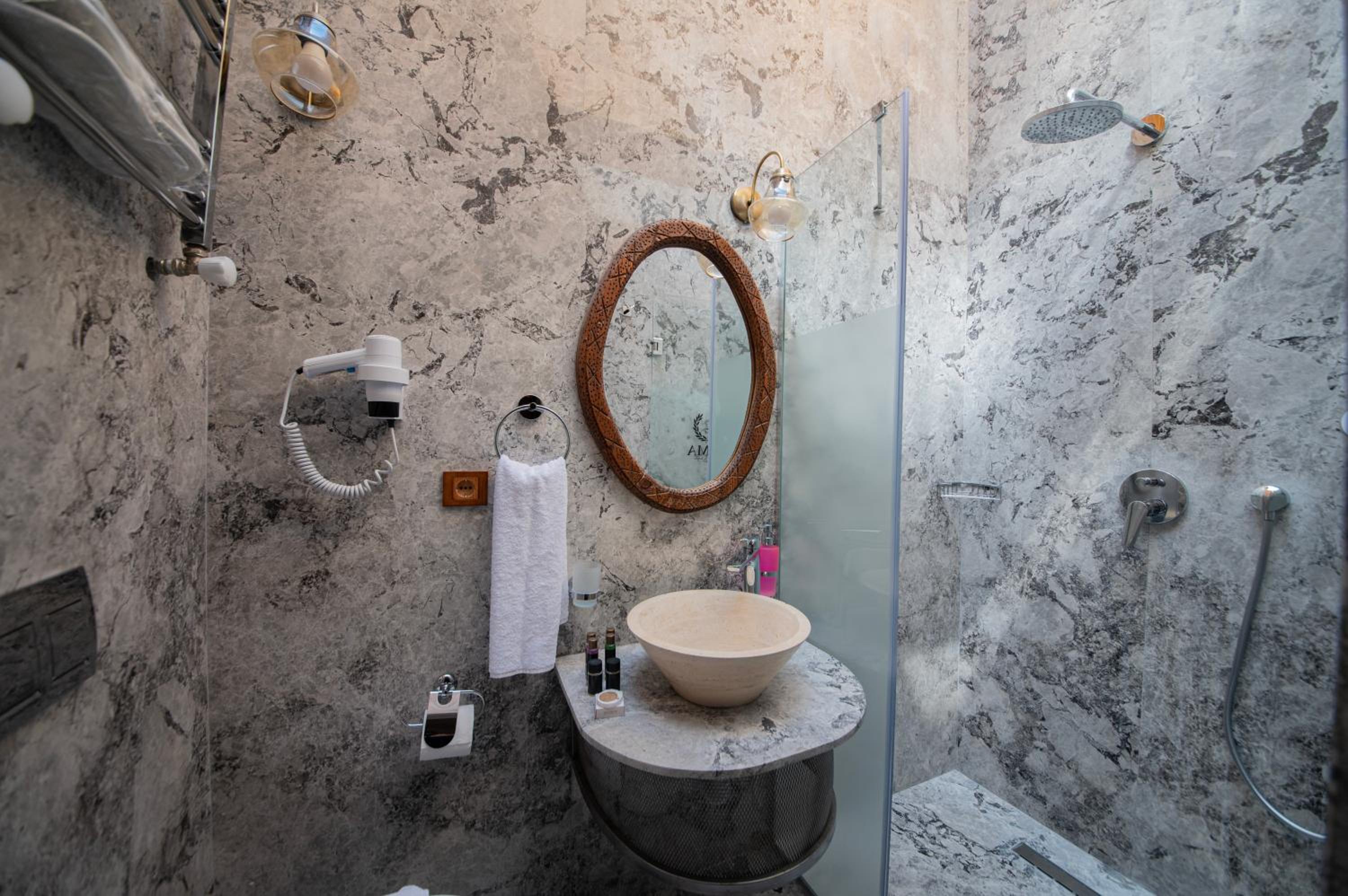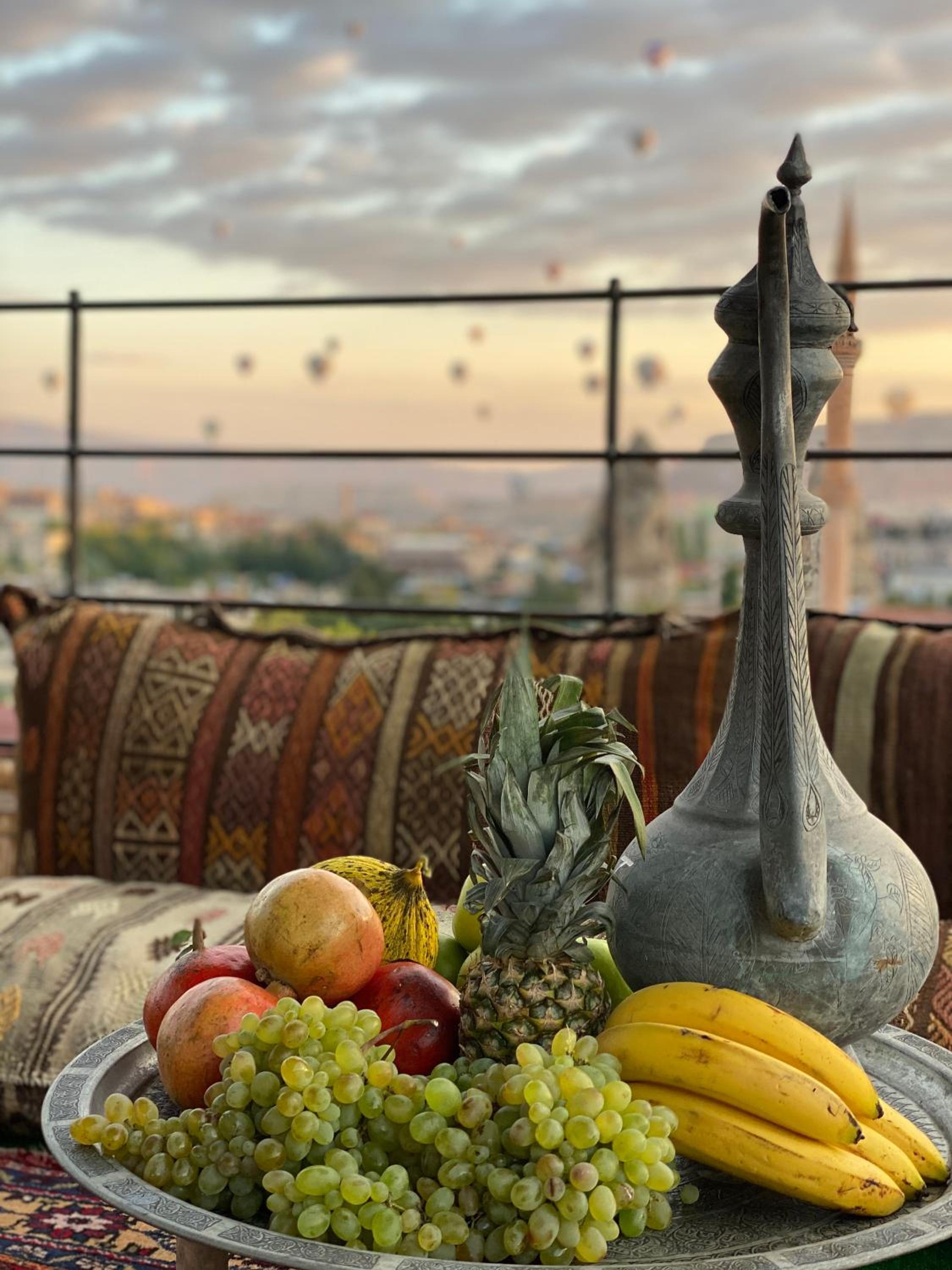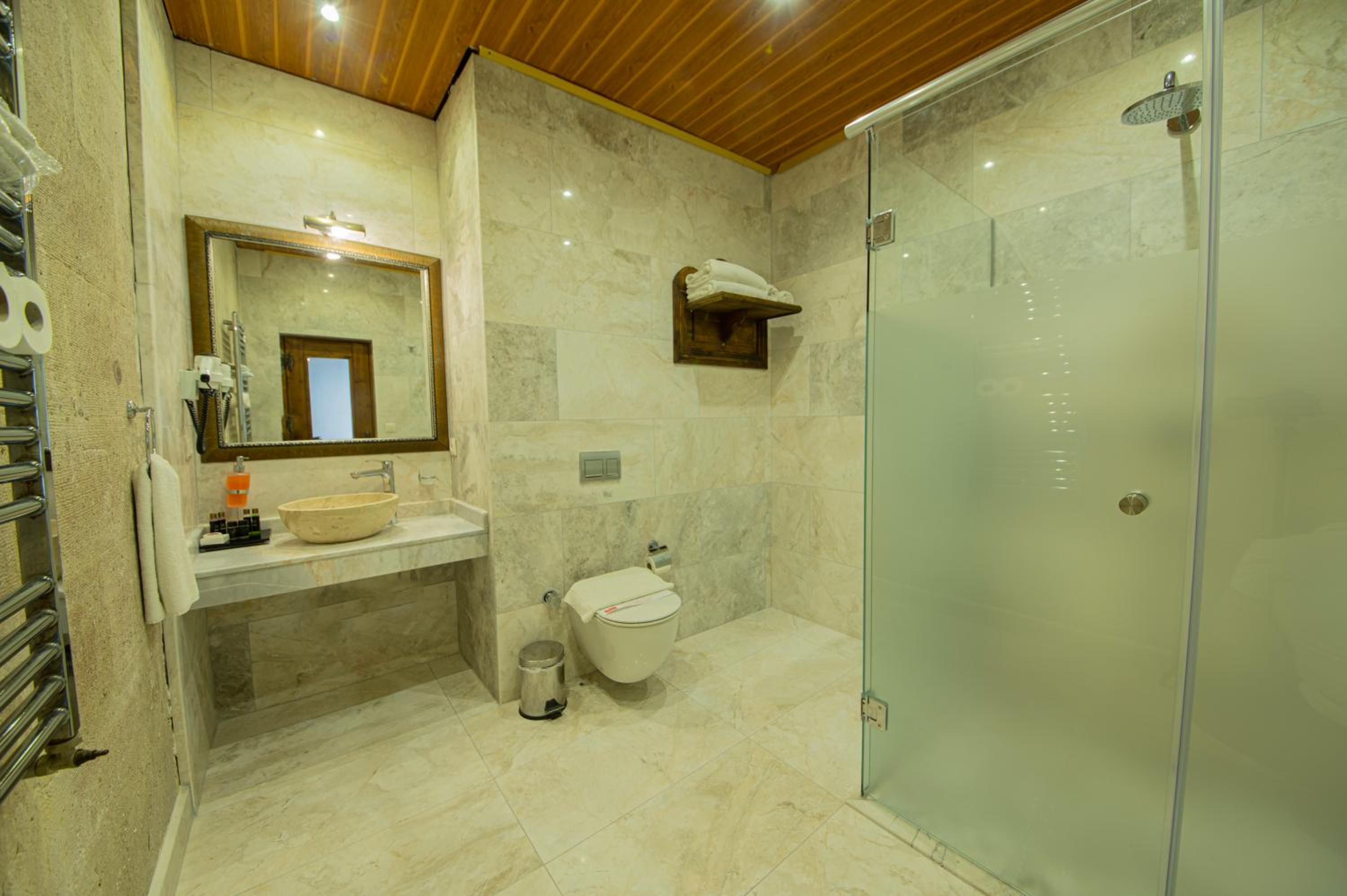 L'hôtel à du charme et bénéficie de terrasse ( Bar et décontraction) avec une belle vue sur Göreme. D'ailleurs pour voir les montgolfière c'est intéressant. La chambre et la salle de bain étaient très agréable et nous avons apprécié la climatisation lors de notre séjour par 40 degré extérieur. Ajouté à cela que la chambre étant située dans une grotte en pierre, cela faisait aussi une climatisation naturelle. Personnel très sympa et aux petits soins. Il peuvent s'occuper d'organiser votre tour en montgolfière et c'est ce que nous avons fait . Bien sur c'est plus cher que de passer par des sites internet . Dommage qu'il y a avait absence de piscine sinon ça aurait été le top. Par contre vous pouvait généralement utiliser les piscines d'autres hôtels mais faut payer évidement. Nous avons utilisé celle de l'hôtel Göreme cave suites , une piscine super ( Il fallait débourser 30 euros par personne mais ça vaut le coût )