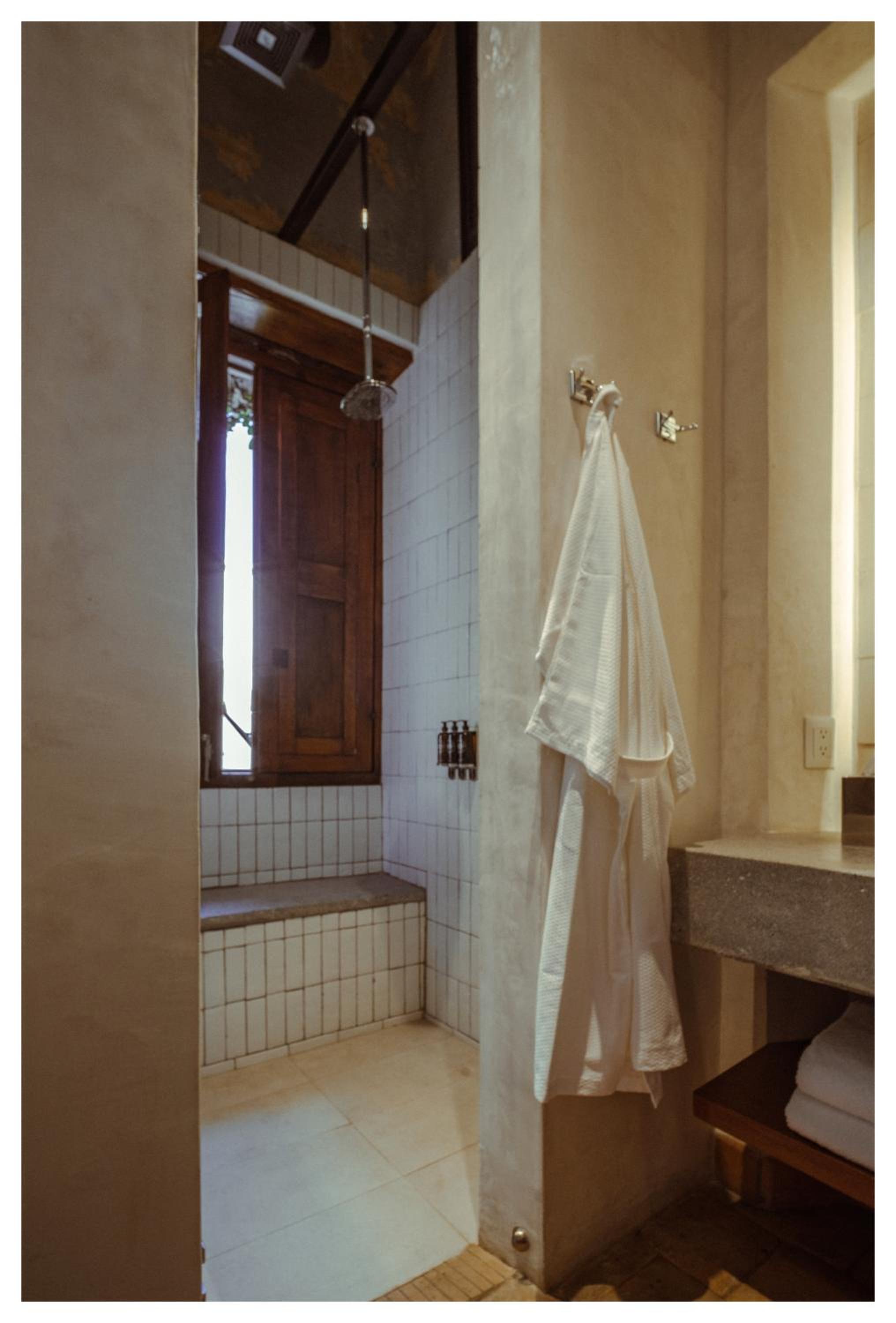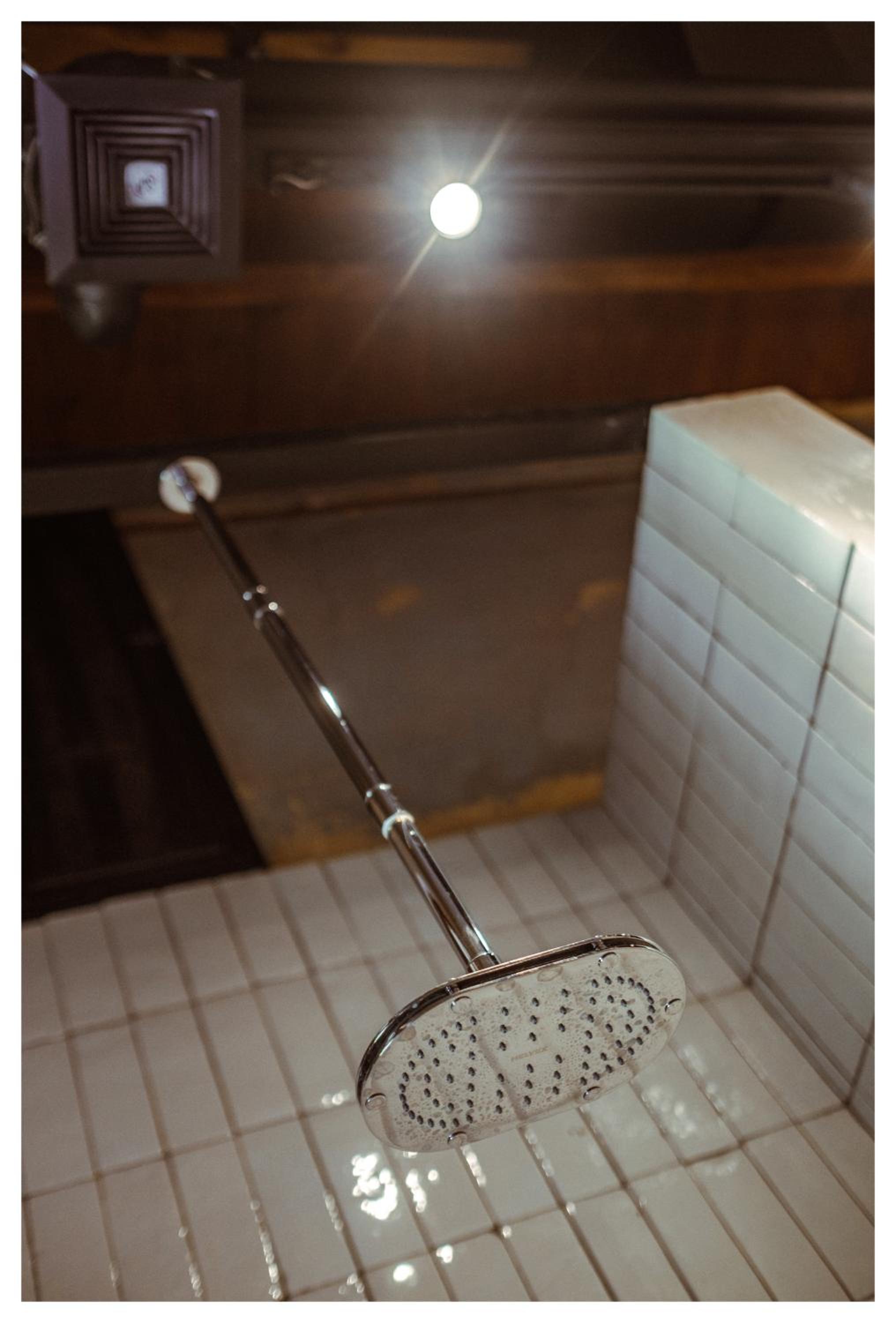 No windows in the room. Half the tile on the long wall in the shower was missing.