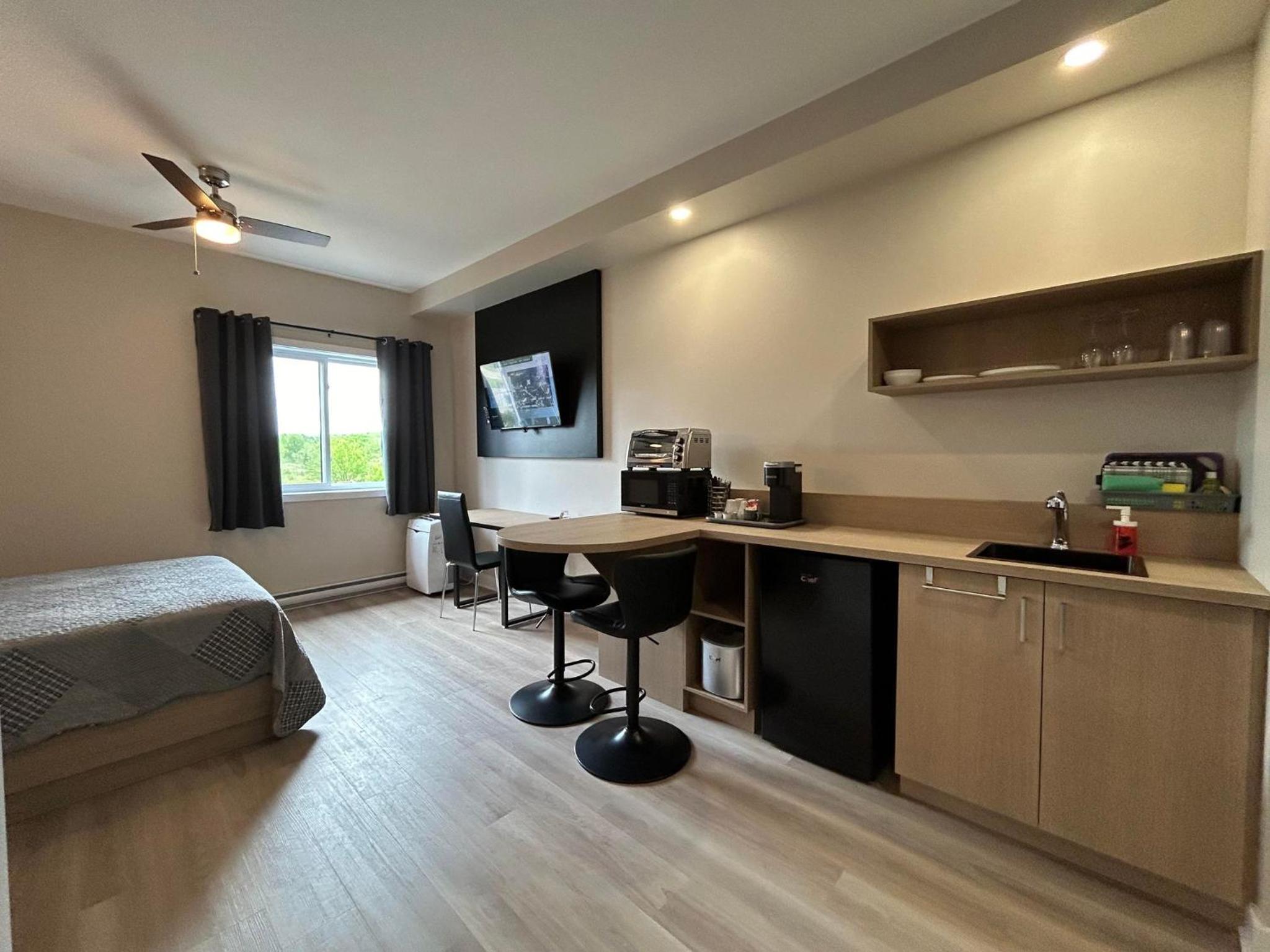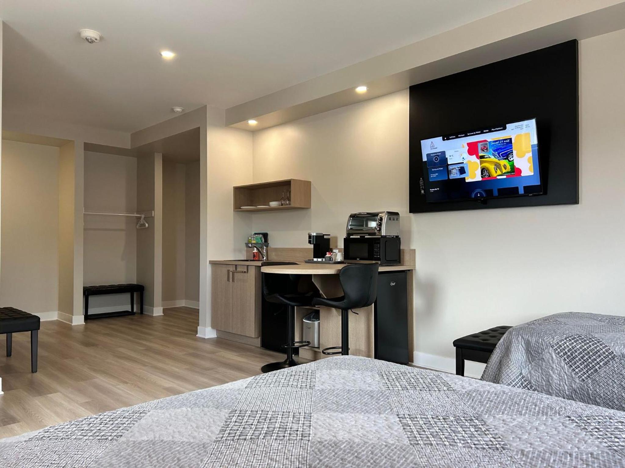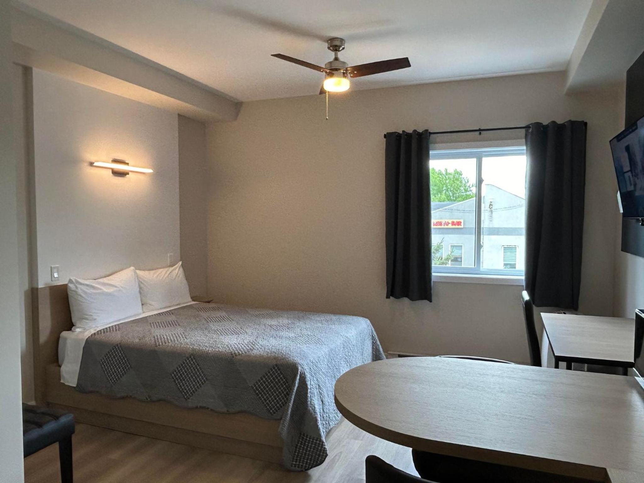 La chambre était sur un coin donc 3 fenêtres, très appréciée. Air climatisé maintenant, génial! Ma deuxième fois à cet hotel et rajout de crochets pour serviettes à la douche: MERCI,) tellement propre, coin cuisine, avec ses Ustensiles vaisselle + table bistro Wow,) bien insonorisé