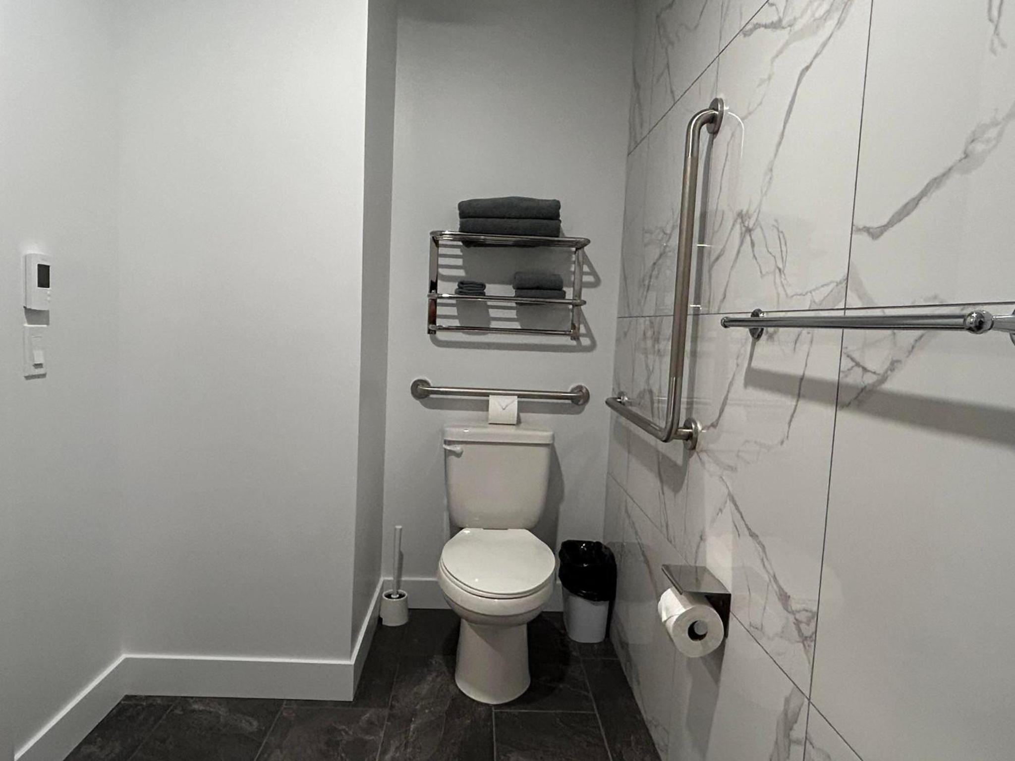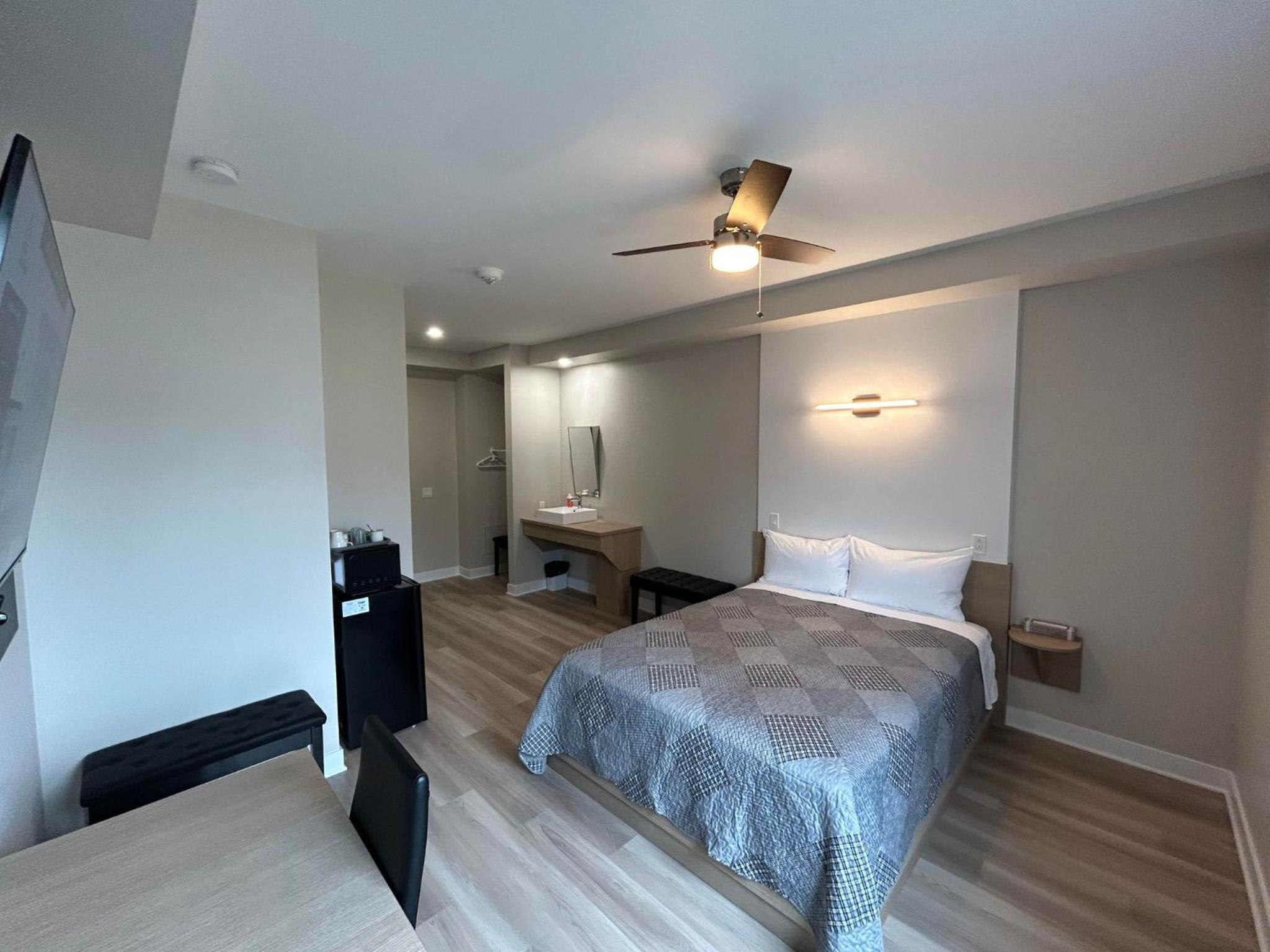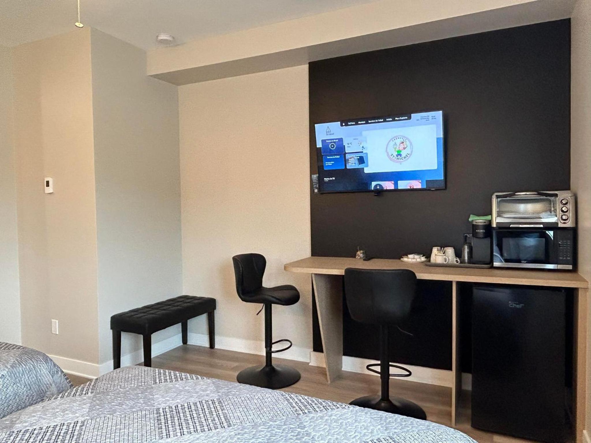 La chambre était sur un coin donc 3 fenêtres, très appréciée. Air climatisé maintenant, génial! Ma deuxième fois à cet hotel et rajout de crochets pour serviettes à la douche: MERCI,) tellement propre, coin cuisine, avec ses Ustensiles vaisselle + table bistro Wow,) bien insonorisé