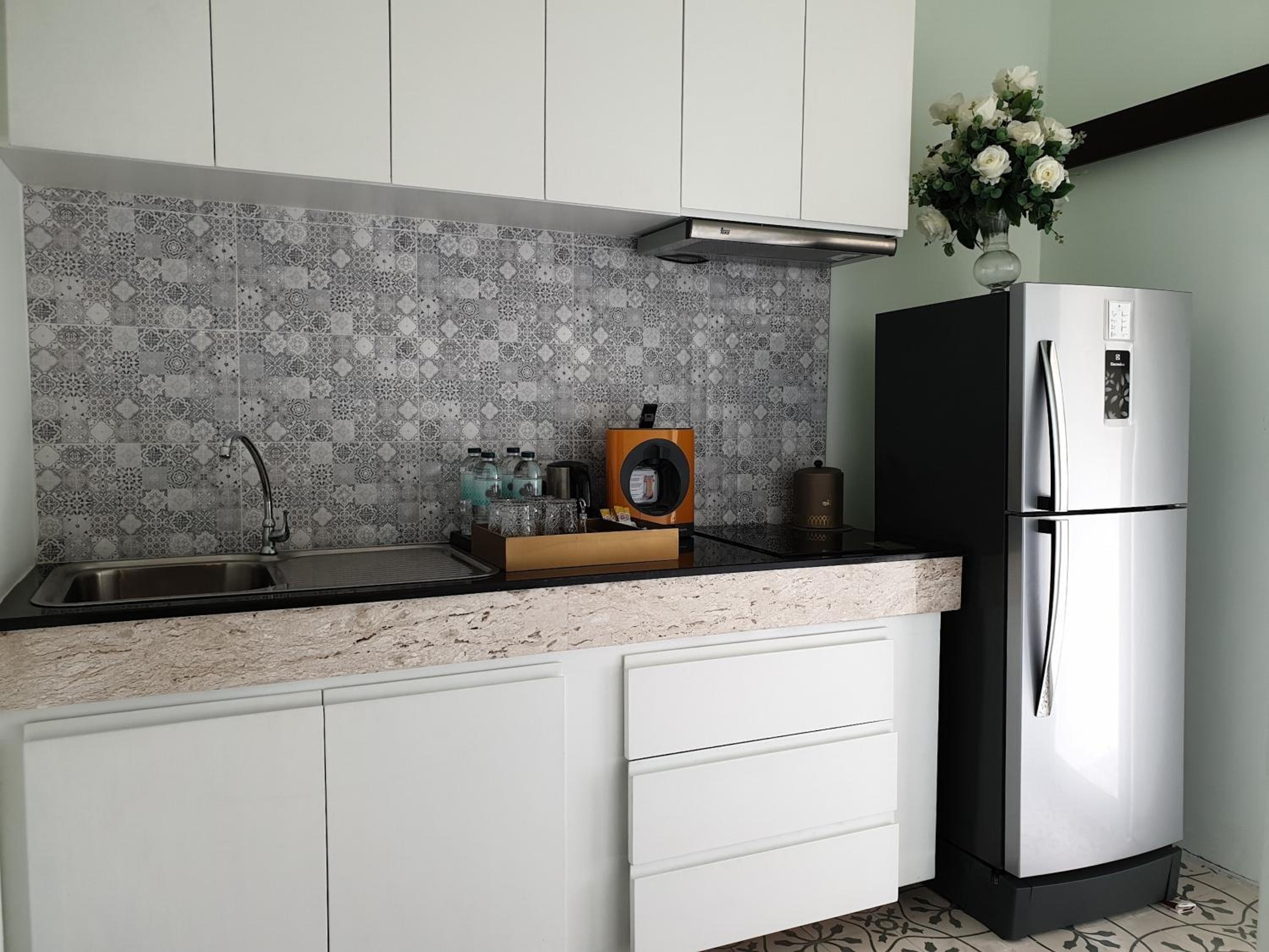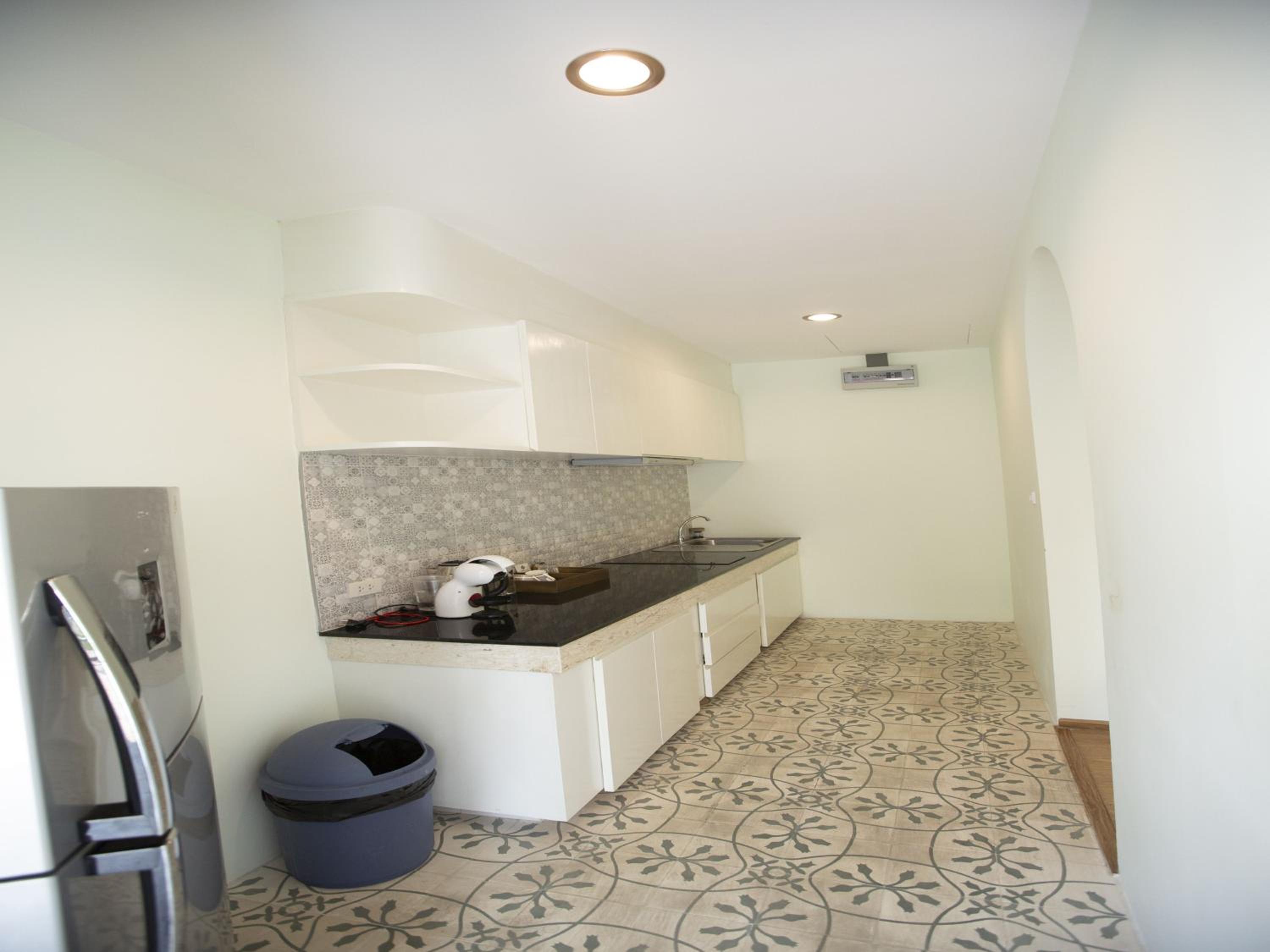 2. There was, surprisingly, no microwave in the room. The place feels like it used to be a condo (the kitchen is complete with a 2-burner stove, a hood and a full-size fridge) - but there are no cooking pans, utensils, etc. to be found in the ample cabinetry and drawers. The lack of cookware is absolutely understandable. You can't allow guests to cook and expect to offer the room (and whatever smells are left from cooking) to the next guest. The missing microwave was unfortunate though. Expect the staff may have accommodated us or allowed use of the breakfast area microwave if we'd asked, but we just ate the food we brought from the market cold instead.