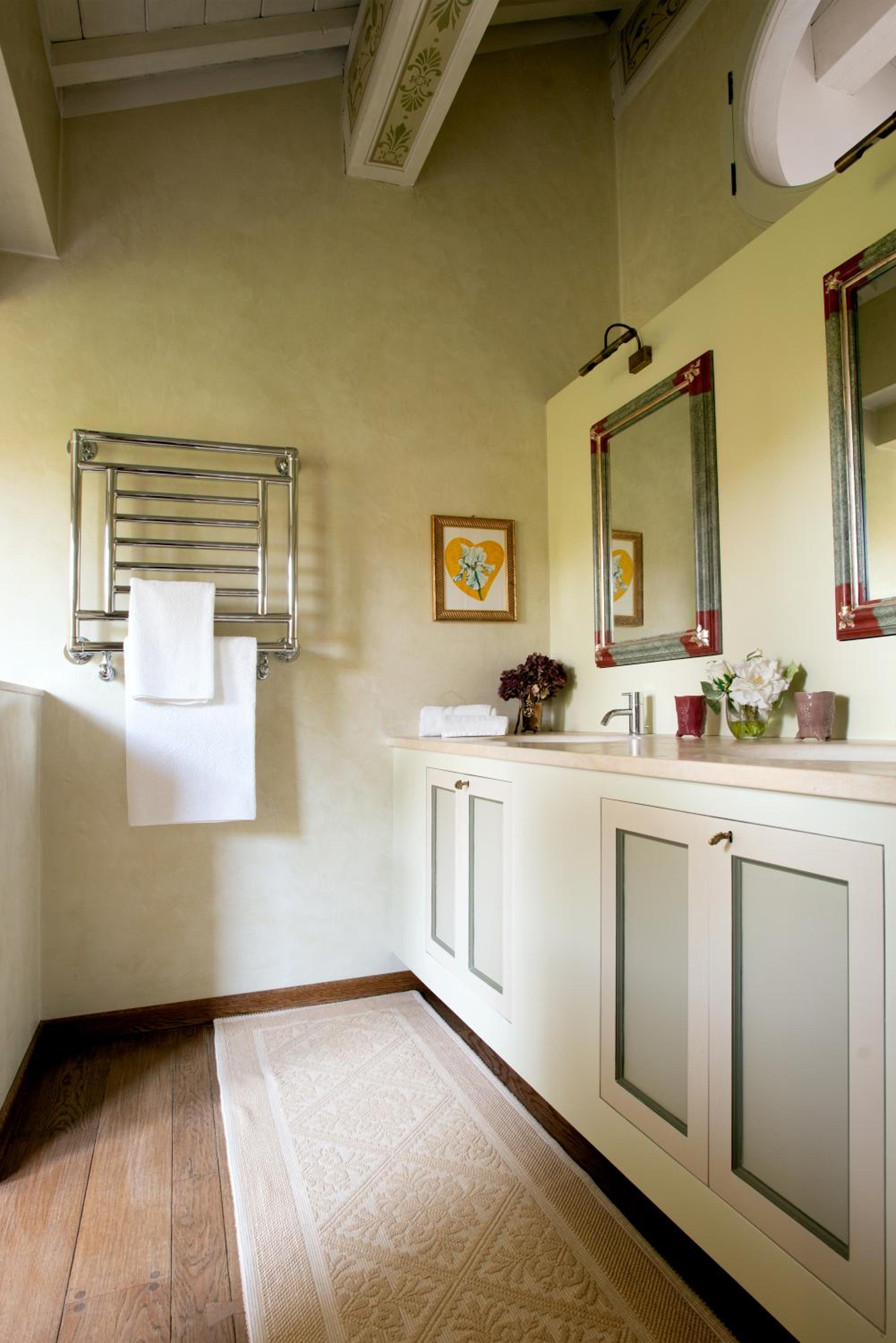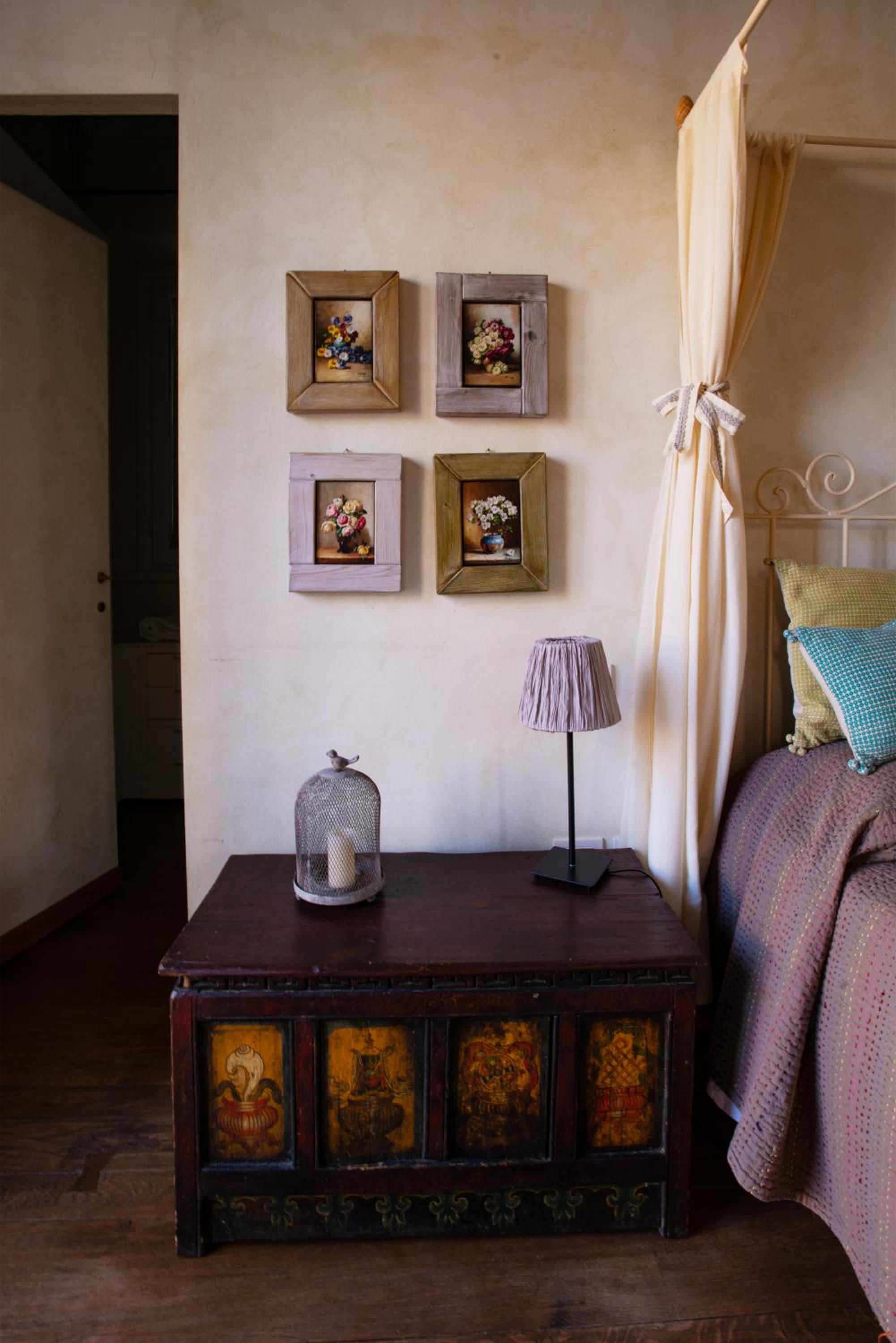 The room in this beautiful private house has high ceilings with painted and restored beams, botanical specimens, beautifully displayed, on the walls and an oak floored bathroom that is one of a kind. That and one of the biggest terraces / balconies ever.