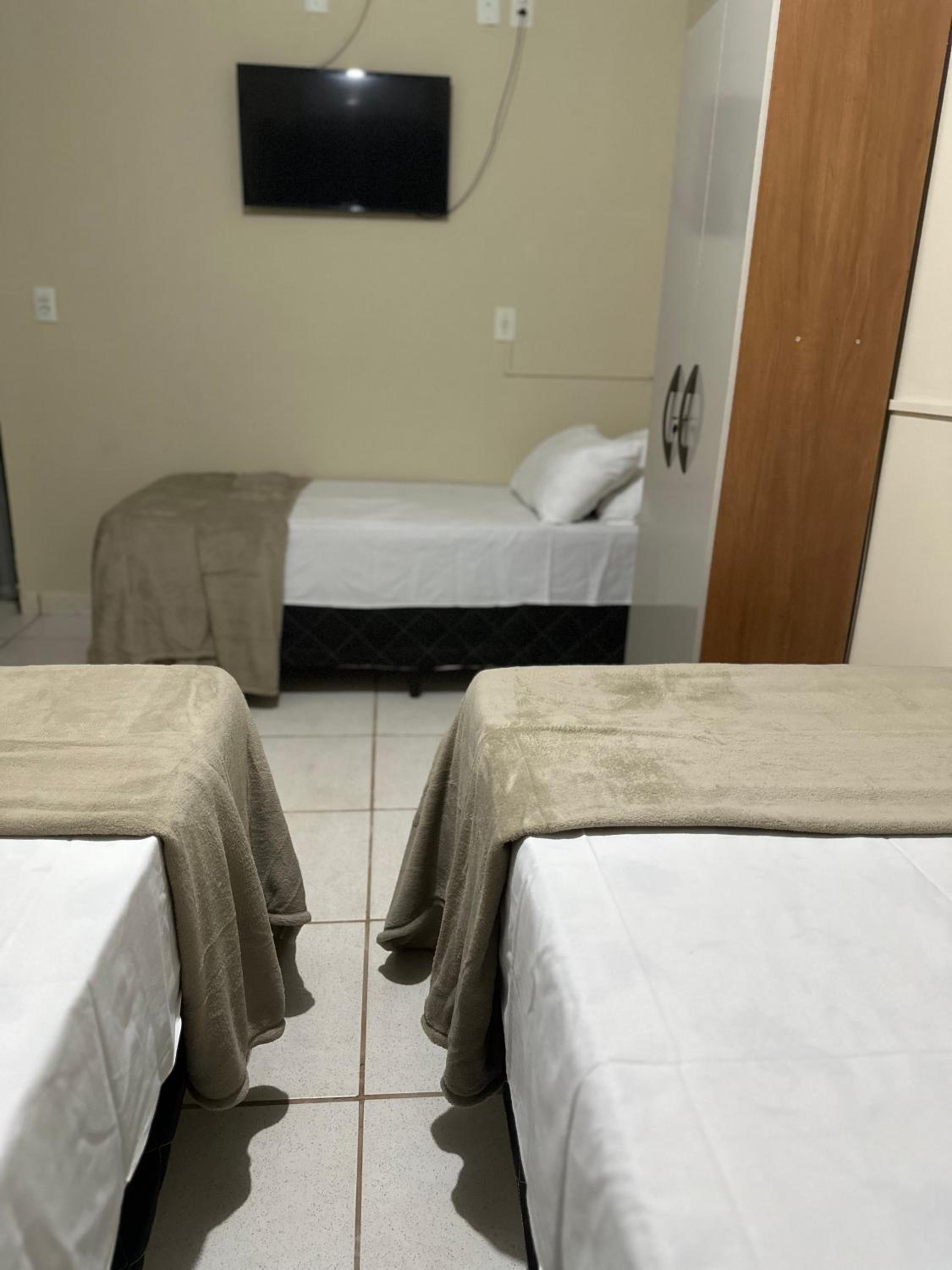 Relax in well-equipped rooms featuring modern amenities like a flat-screen TV, a microwave, and cozy bedding at Hotel Nossa Senhora de Lourdes.
