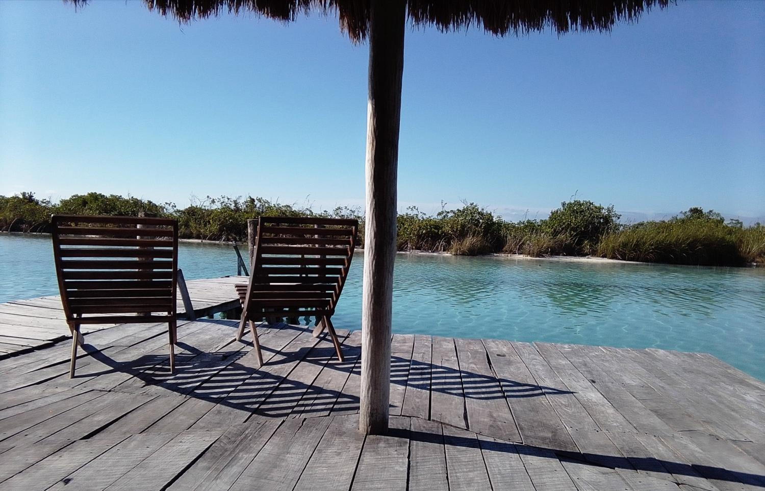 The hotel's dock in the middle of the lagoon offers a perfect spot for relaxation and easy access to water activities like boat trips. The dock leads to a traditional palapa, enhancing the authentic experience.