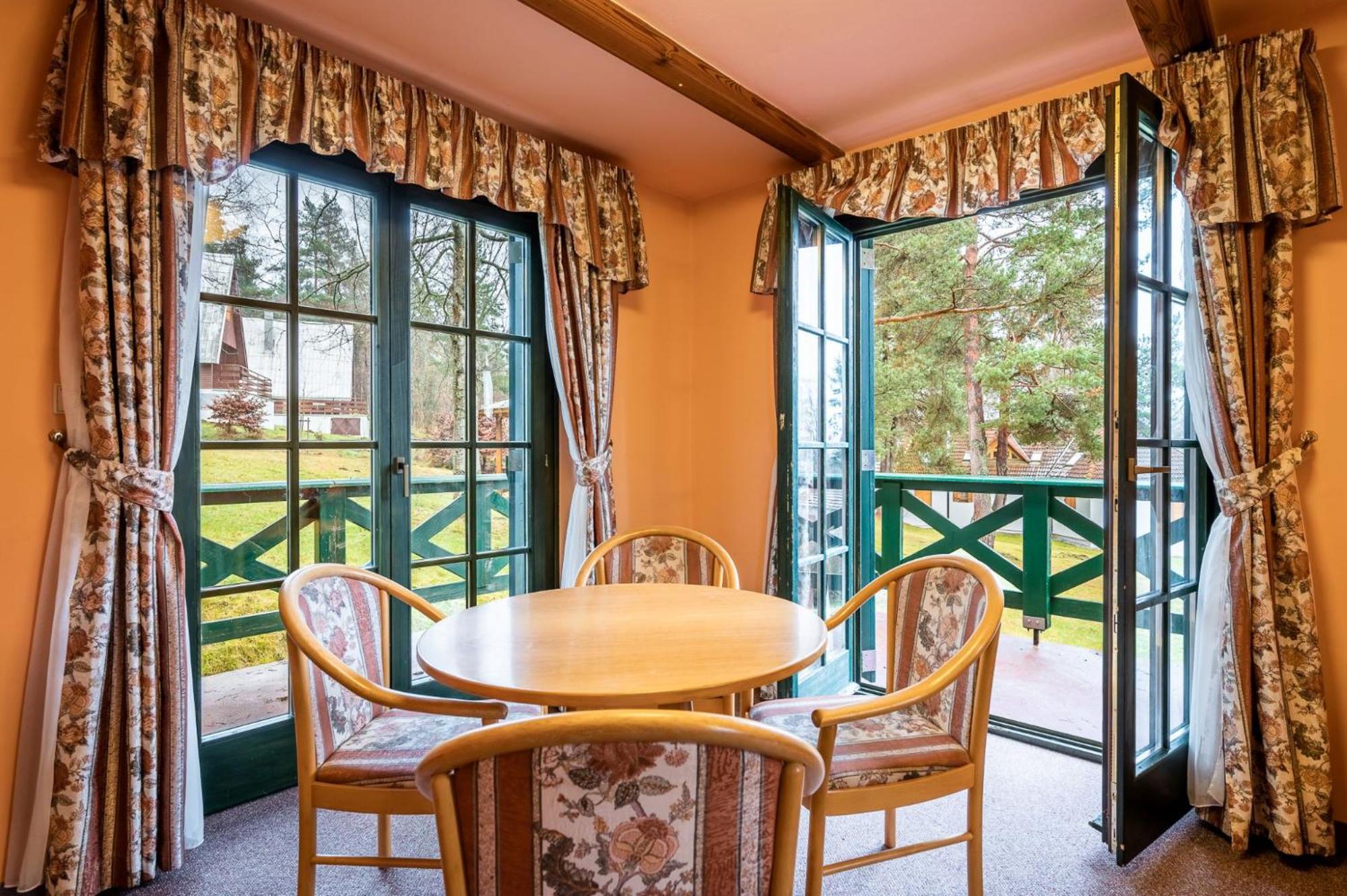 Hotel to kilkanaście domów rozstawionych na pięknym, zadrzewionym terenie i w każdym domku jest po kilka pokoi. Główne zdjęcie to restauracja ( robiąc rezerwację myślałam, że tam będziemy mieszkać). Także na miejscu okazuje się, że jest o wiele lepiej. Kilka dań do wyboru w restauracji, podstawowe śniadanie i do tego pizzeria na terenie hotelu- idealne miejsce na krótki wypad. Wszystko wystarczająco. Przepiękna lokalizacja hotelu. Bardzo sympatyczna obsługa. Idealne miejsce dla rowerzystów, trasa naokoło jeziora- rewelacyjna, 85 km pięknej, utwardzonej drogi rowerowej.