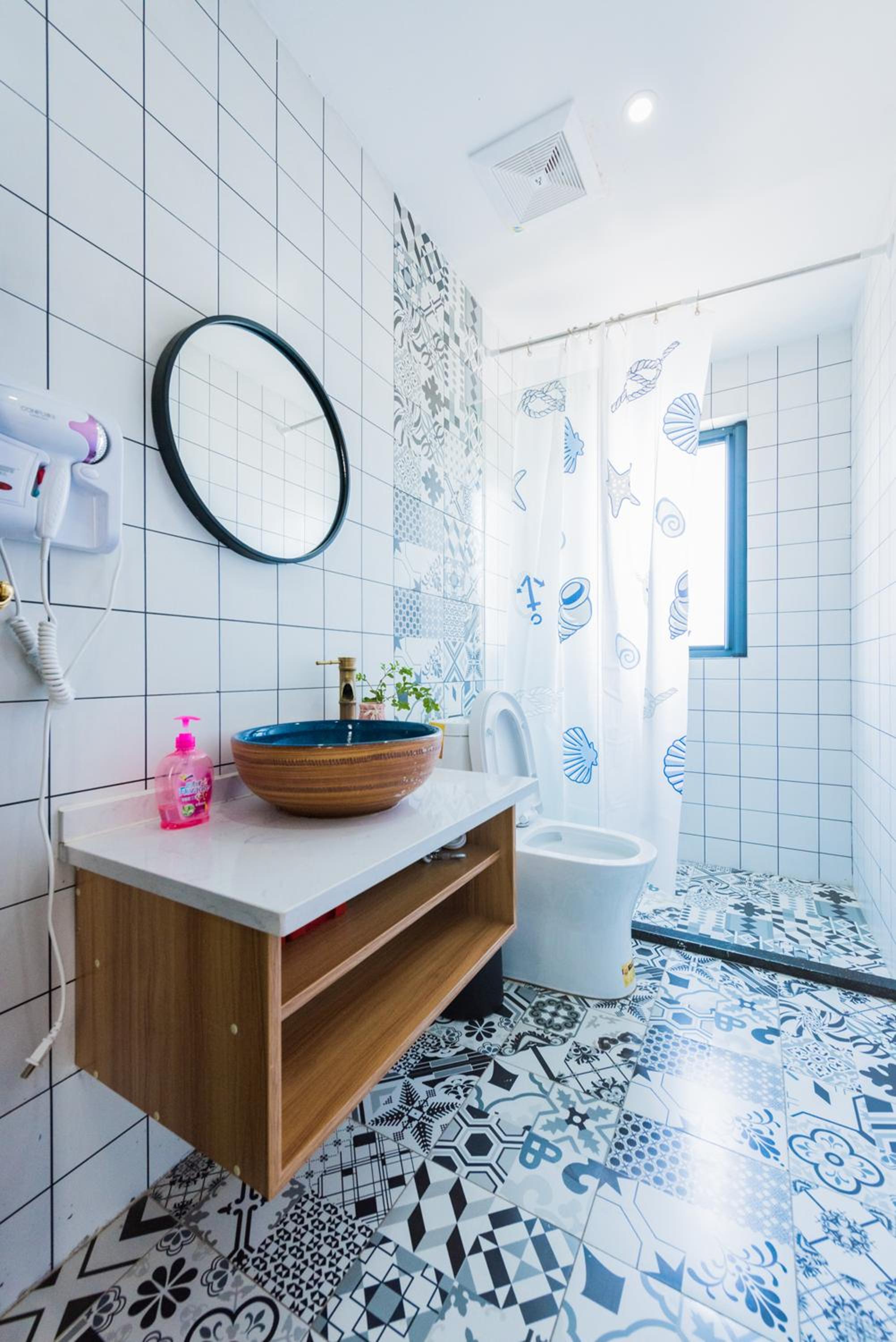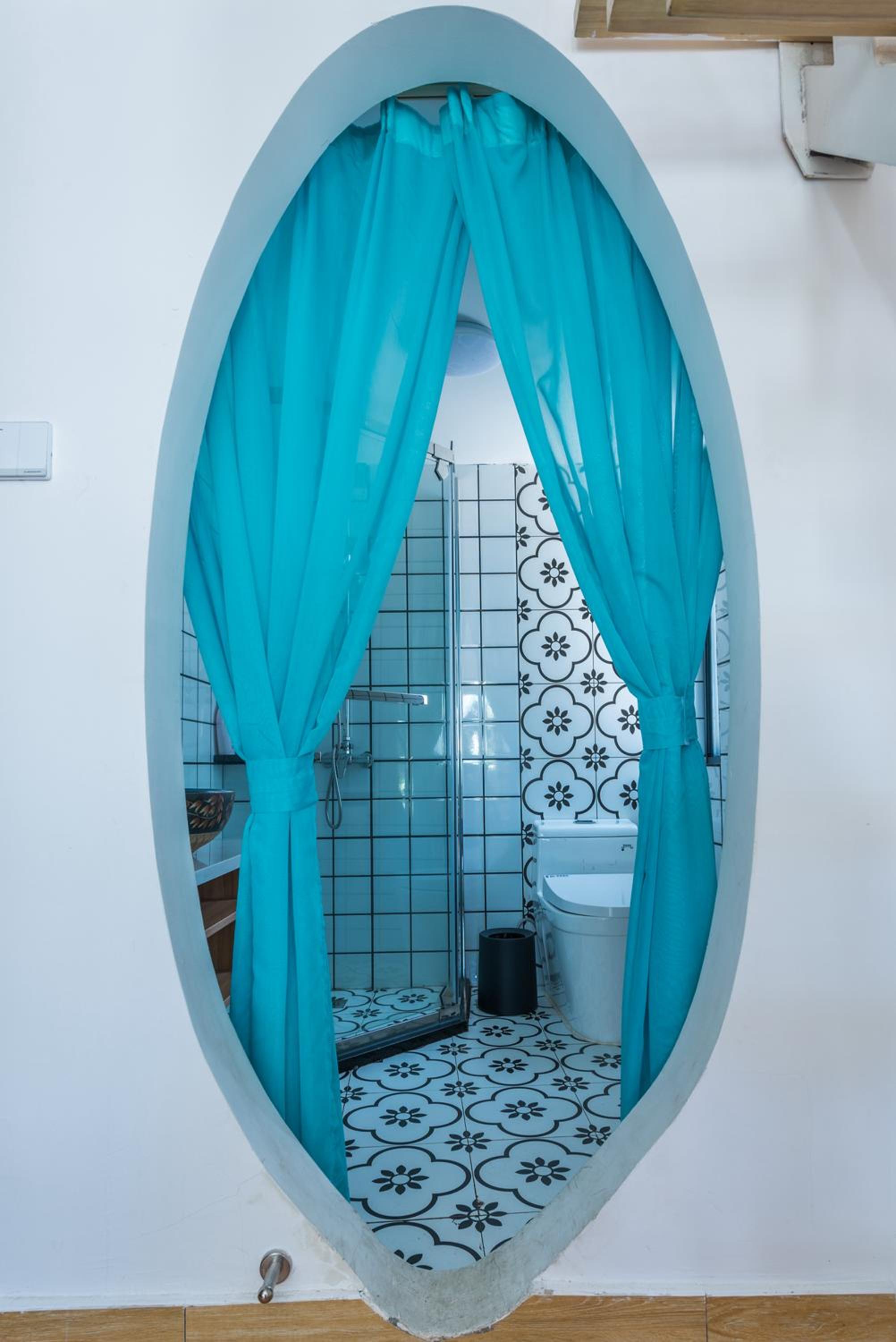 The bathroom doesn't have walls but glasses/plastic covers.