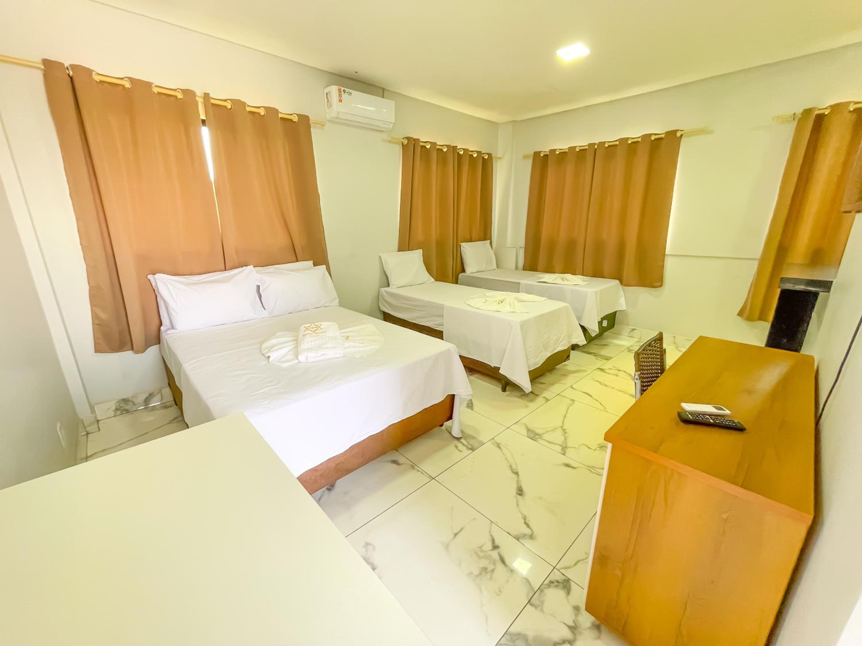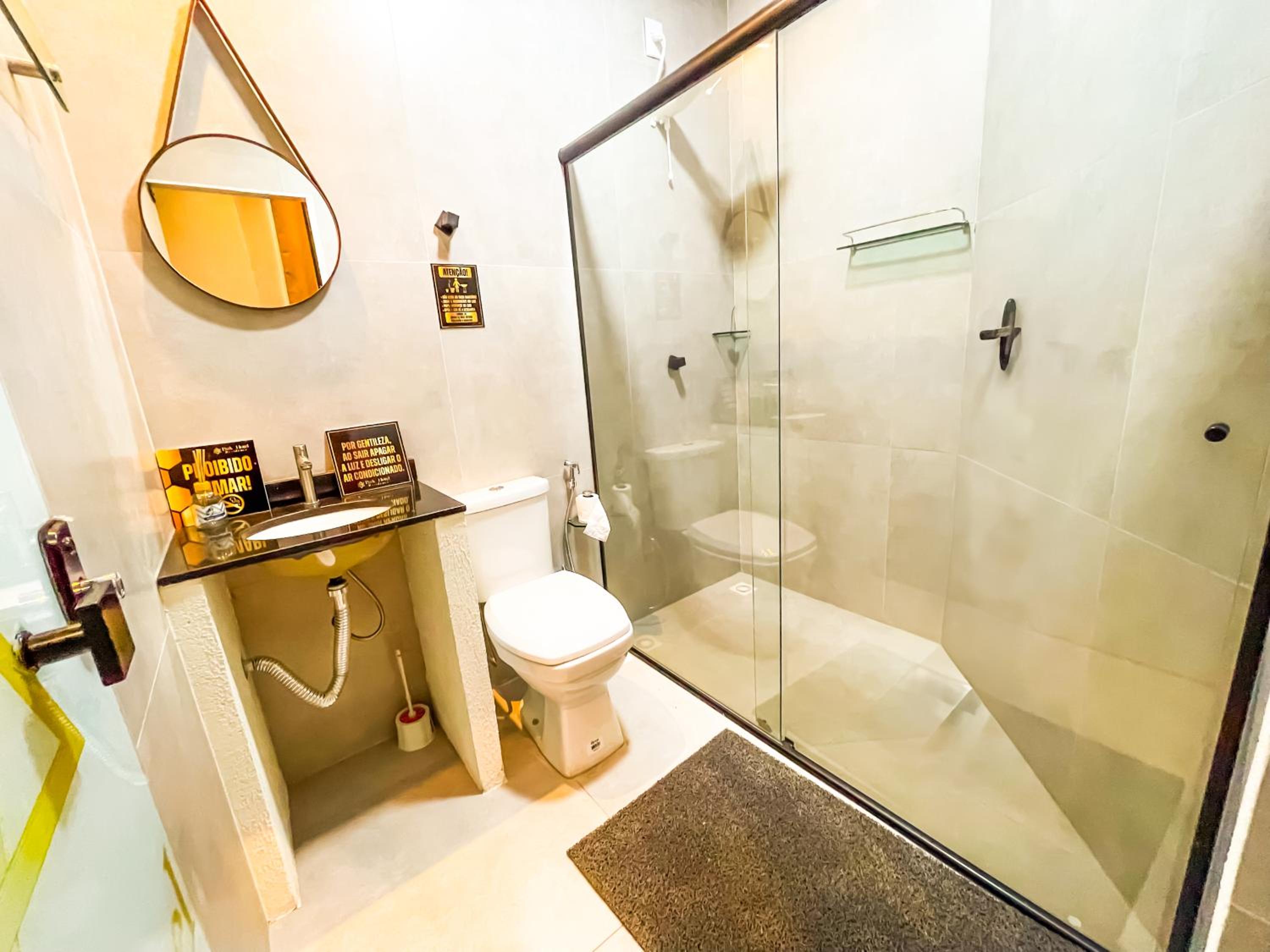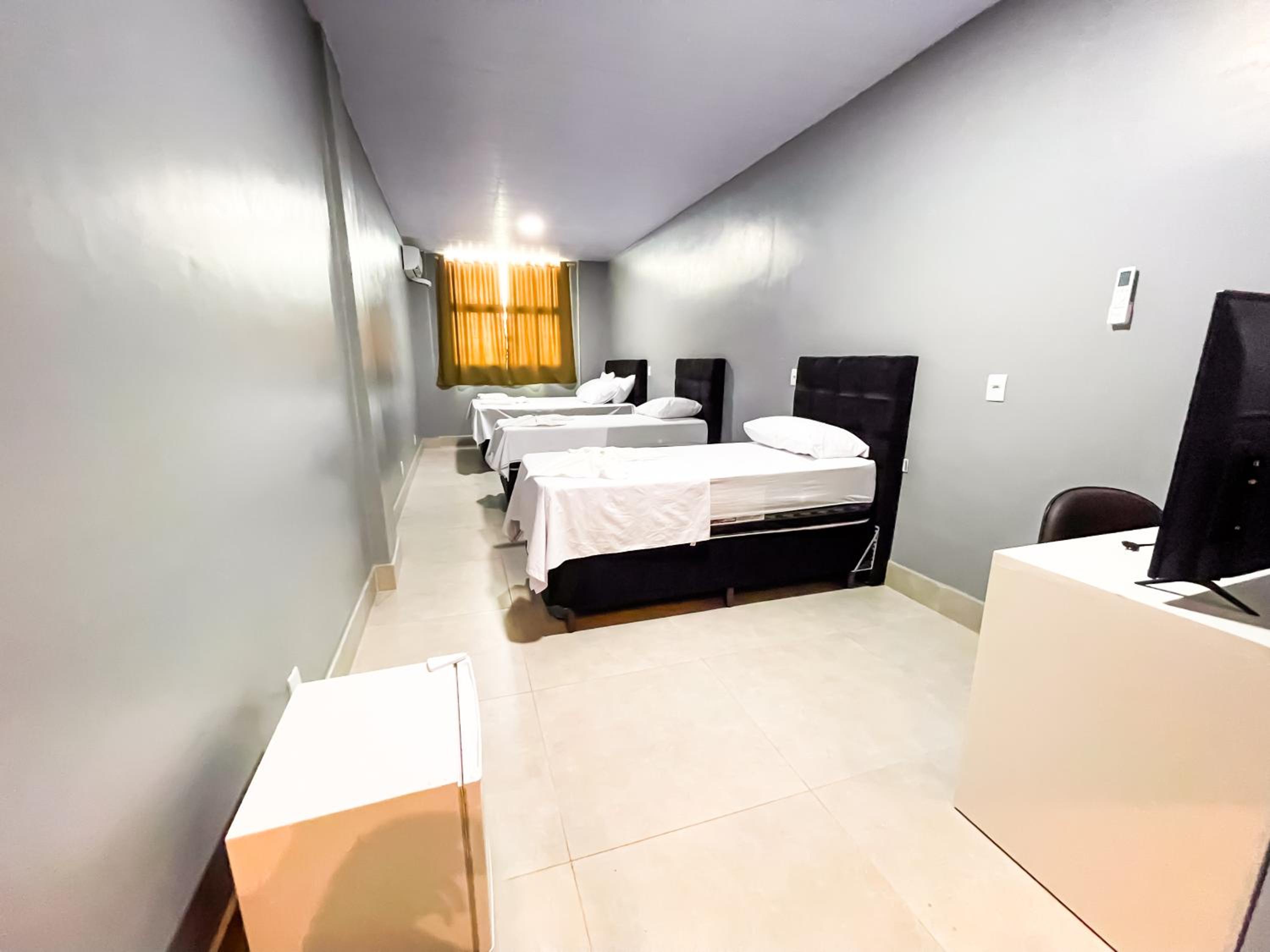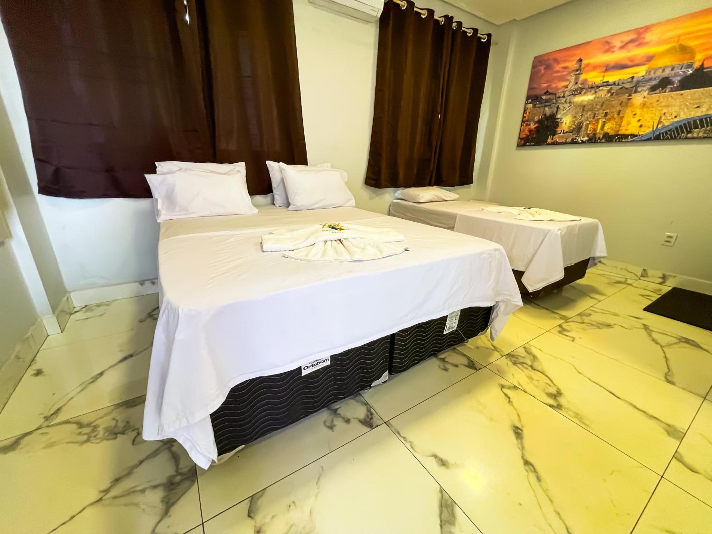 Quarto espacoso,, cama e banheiros confortáveis para a proposta do.hotel. tudo limpo e organizado.