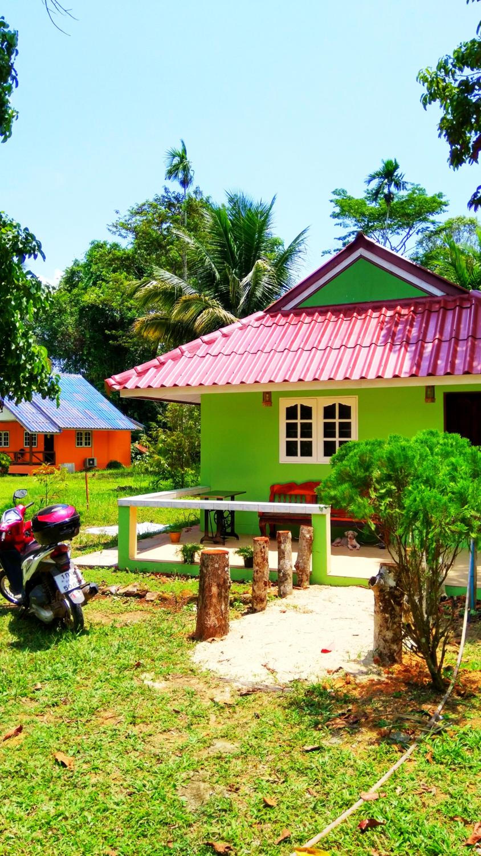 Les petites maisons colorées sont disposées autour du jardin très vert, c'est très joli et paisible, on n'entend que les oiseaux ! La cuisine est délicieuse !