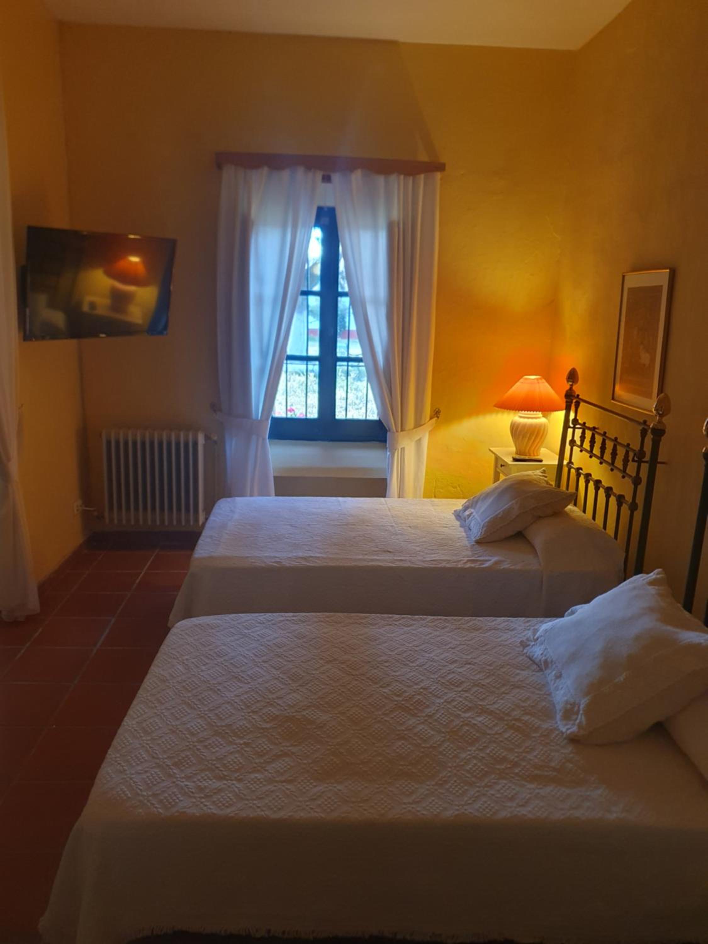 Bed too small for a double- bed linen was not cotton but polyester - needed to be a simple duvet and cover - towels very old and grey looking- light in bathroom not working properly - these are minor compared to ambiance, food and setting