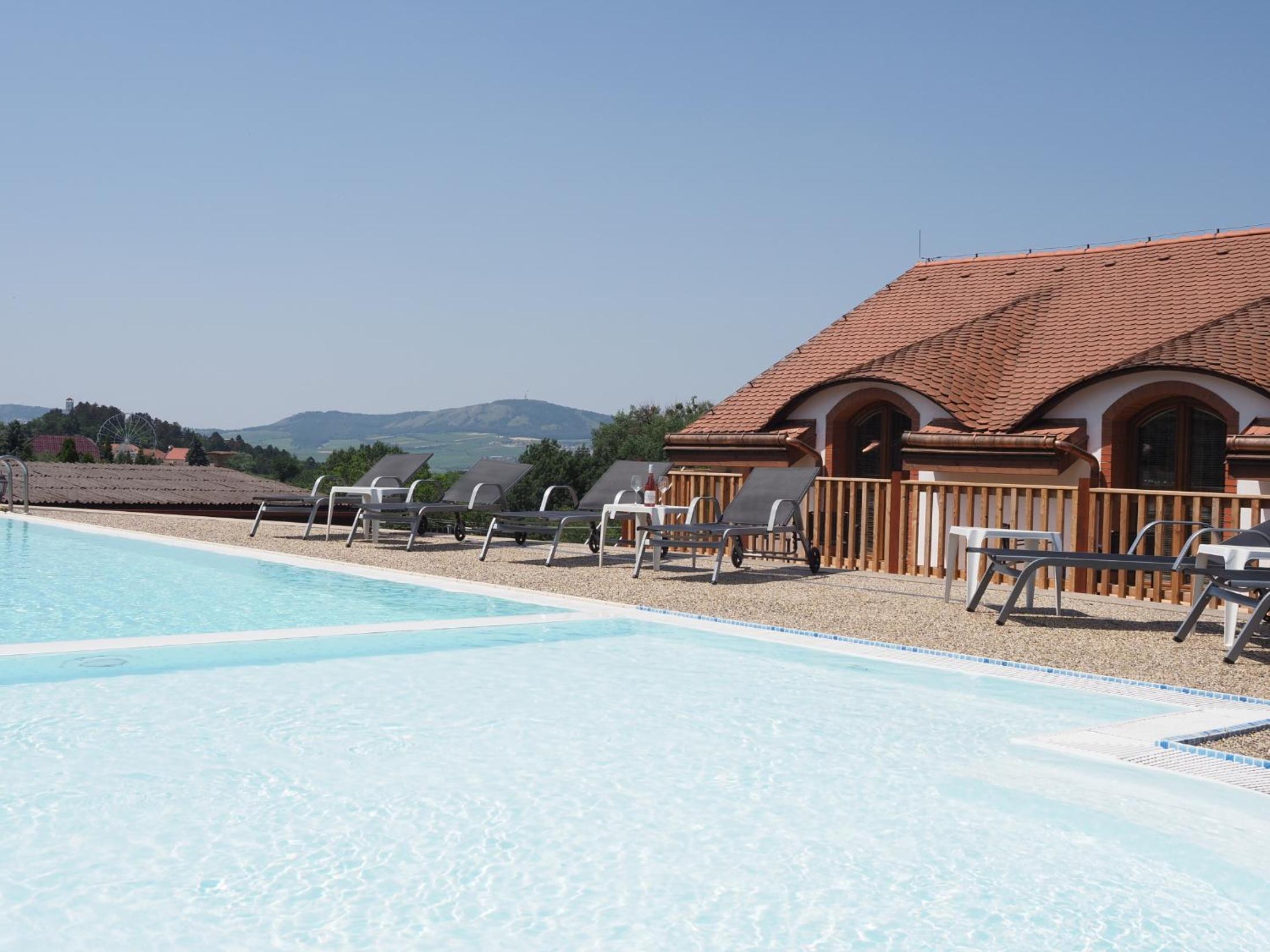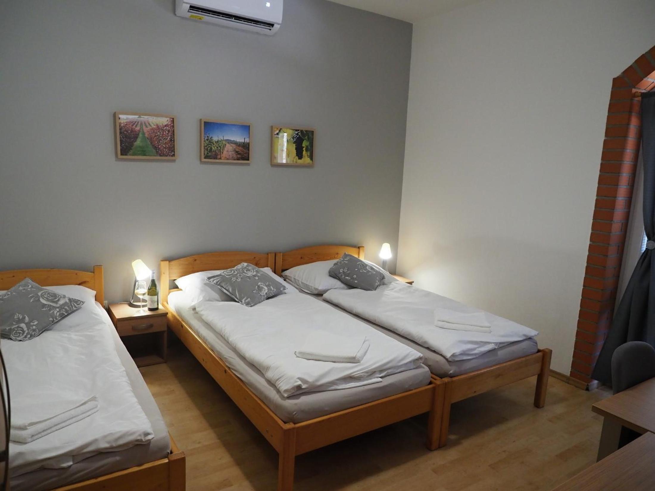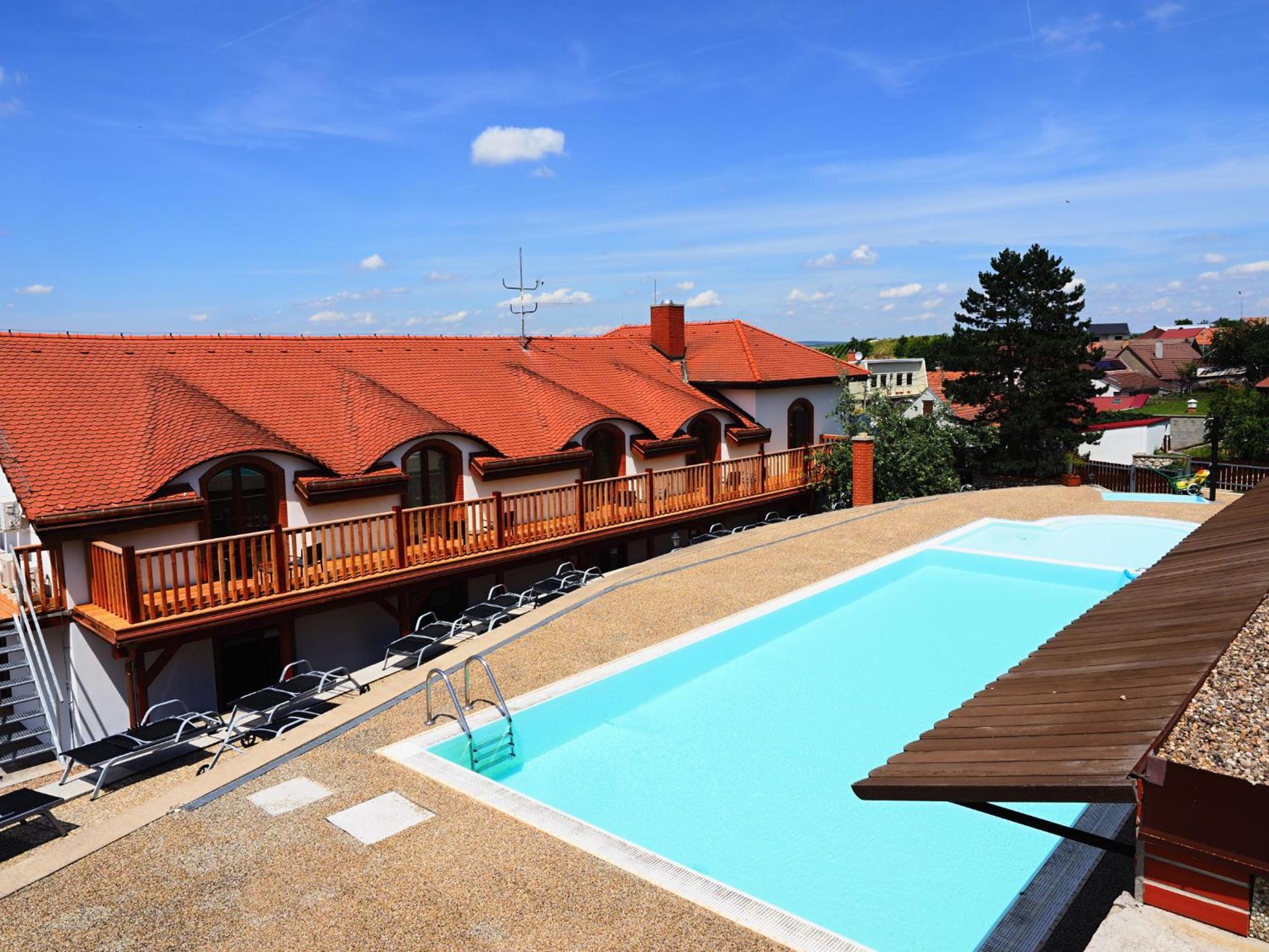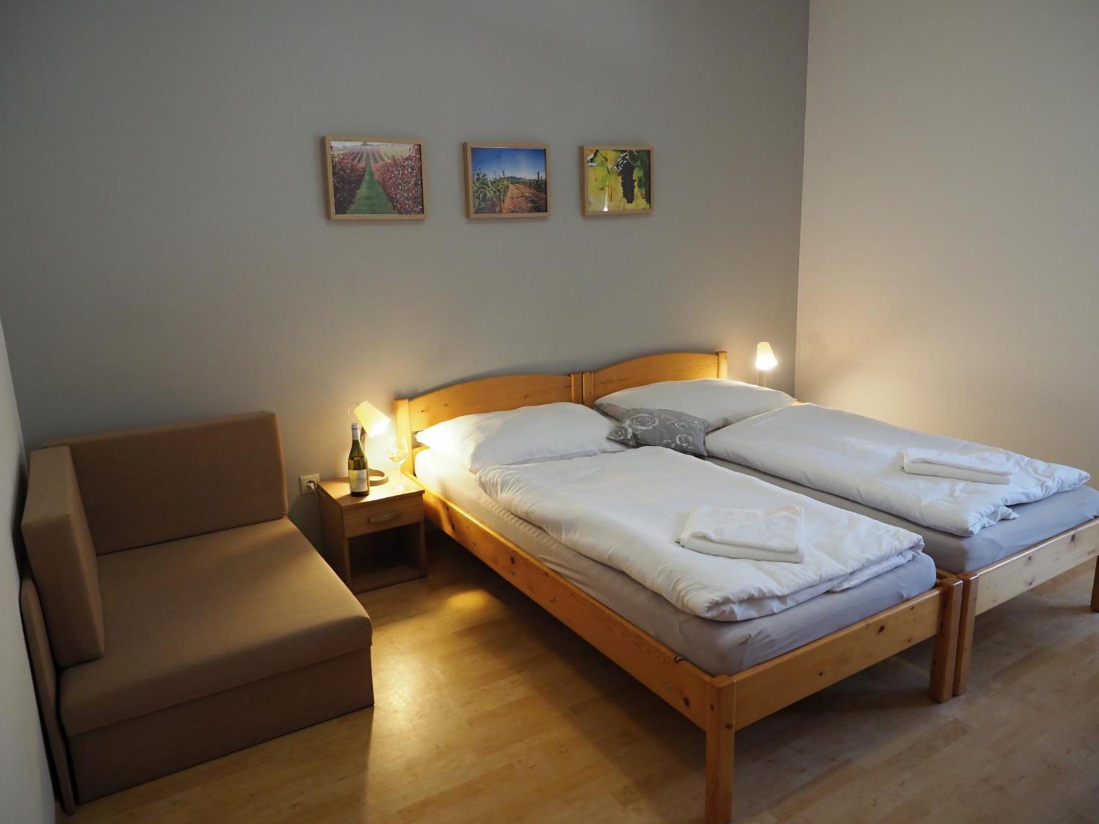 Výborná lokalita, krásné prostředí, v teplých dnech nám přišel vhod bazén; velmi milá a ochotná paní recepční. Pokojík pro 3 byl menší, ale dostačující. Velmi originální byl “minibar” ve vinném sklepě, kde měl každý pokoj svoji kóji se zásobou sedmiček různých druhů vín.