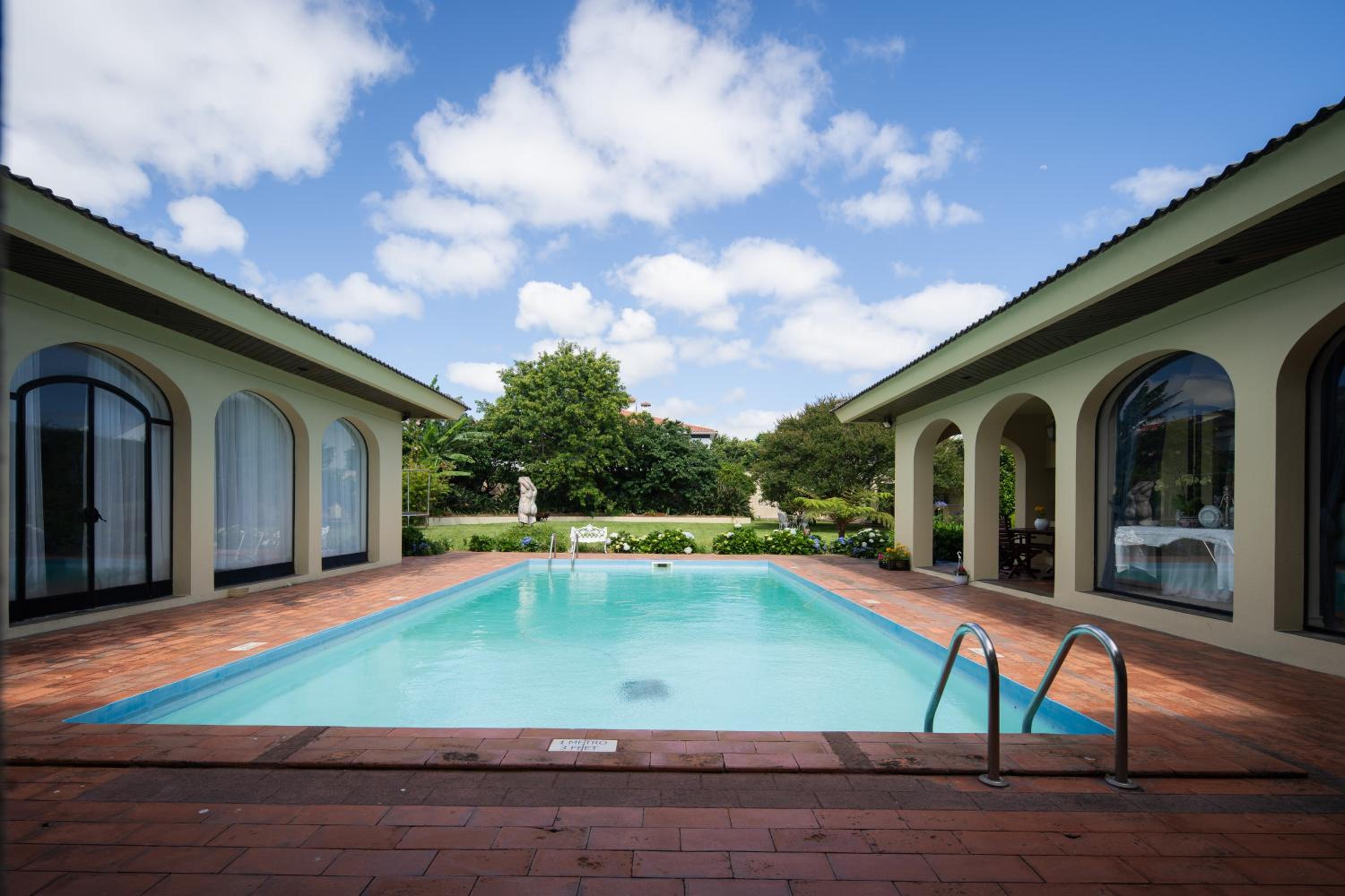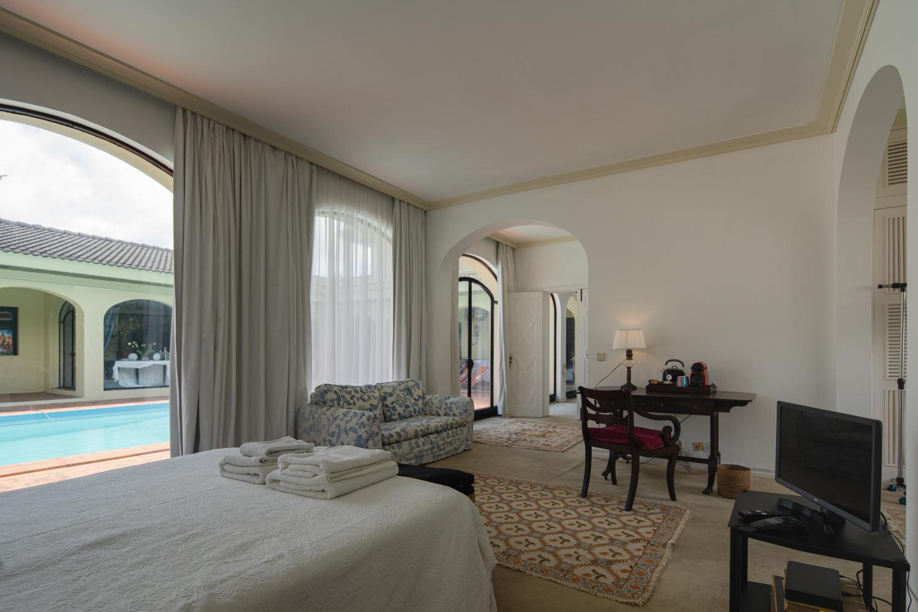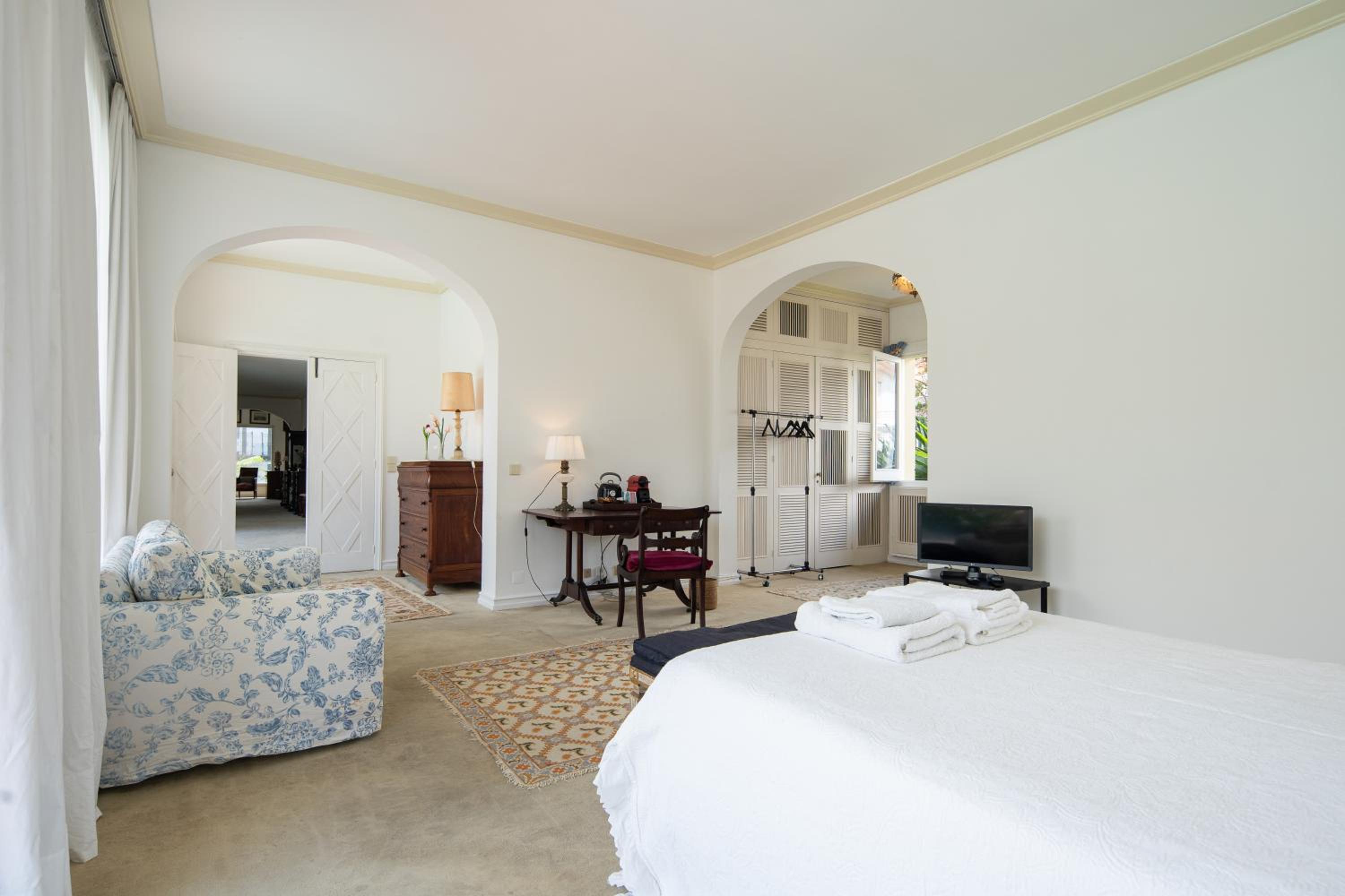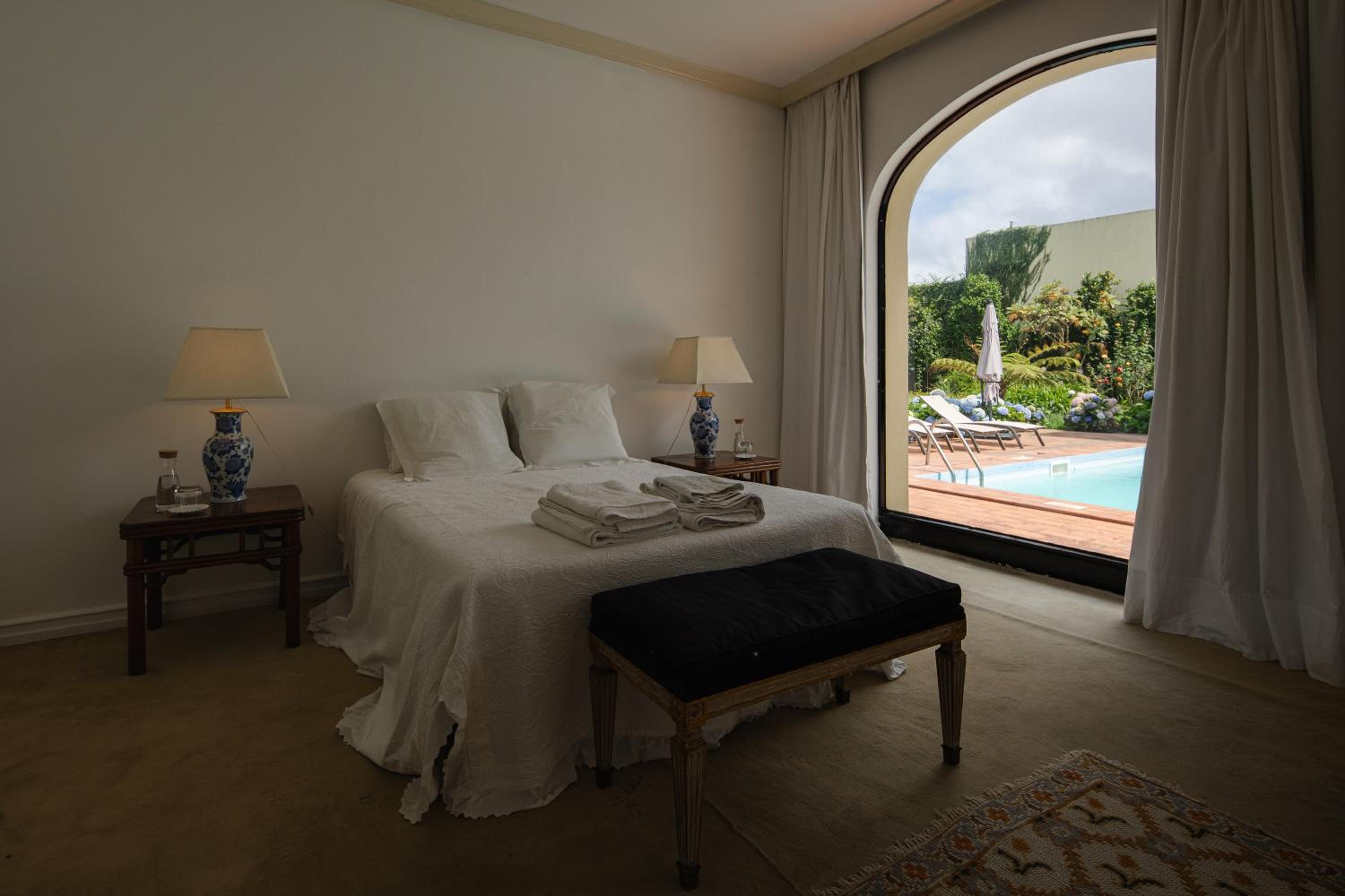Our experience at Casa dos Arcos....We couldn't have chosen a better place to stay in the city. It was peaceful and calm in a parklike setting. You may think when coming to an island, the ideal place is oceanview, but realistically how long do you plan to stay indoors? For us our focus was on exlproring this beautiful island. The variety of shades of green that we never knew existed and all the different ocean views that keept amazing us everywhere we went will stay with us forever. When the time came for us to recharge for the next day, its so rewarding to come back to a clean comfortable and peaceful place that you can truly rest to prepare for the next exciting day. Just draw back the never-ending curtains to the wall of windows just literally a couple of steps of the pool. Our only concern was to plan where to go for dinner, having the option to walk there or a short drive away. There's always the kitchenette if you plan on cooking. We must say that we couldn't have had a better host that's always ready to help and will kindly give you great suggestions. Even though our flight was delayed and we only got there late at night, Pilar welcomed us with a warm smile and kindly offered us soup along with a beautiful welcome basket in our room. The next morning we had the cutest welcoming committee of Tufas, Amelia and Lola. They are Pilar's rescue dogs and i must say are unificial certified emotional support dogs that made our stay so much more delightful and unforgettable. Thank you Pilar for making our stay a memorable one!