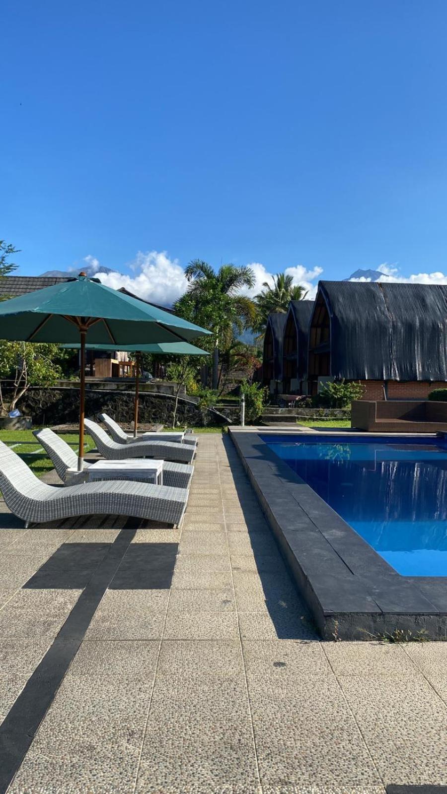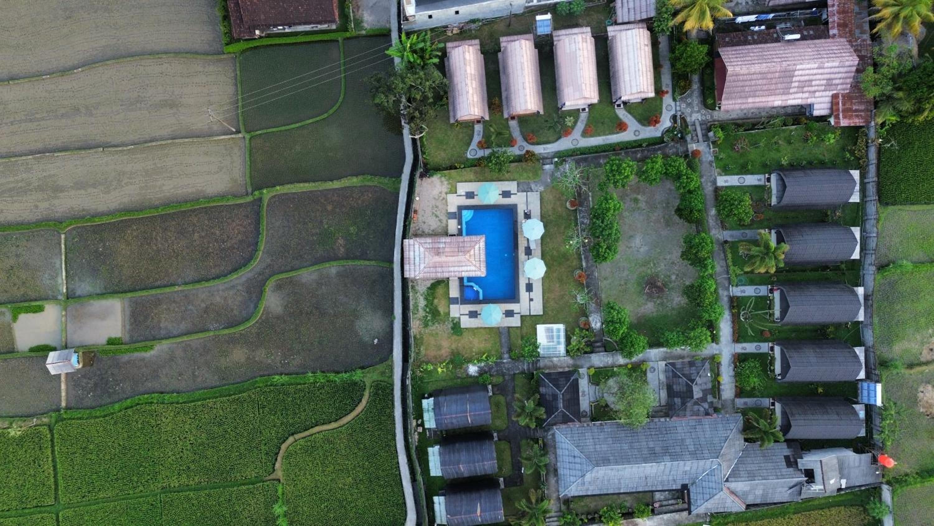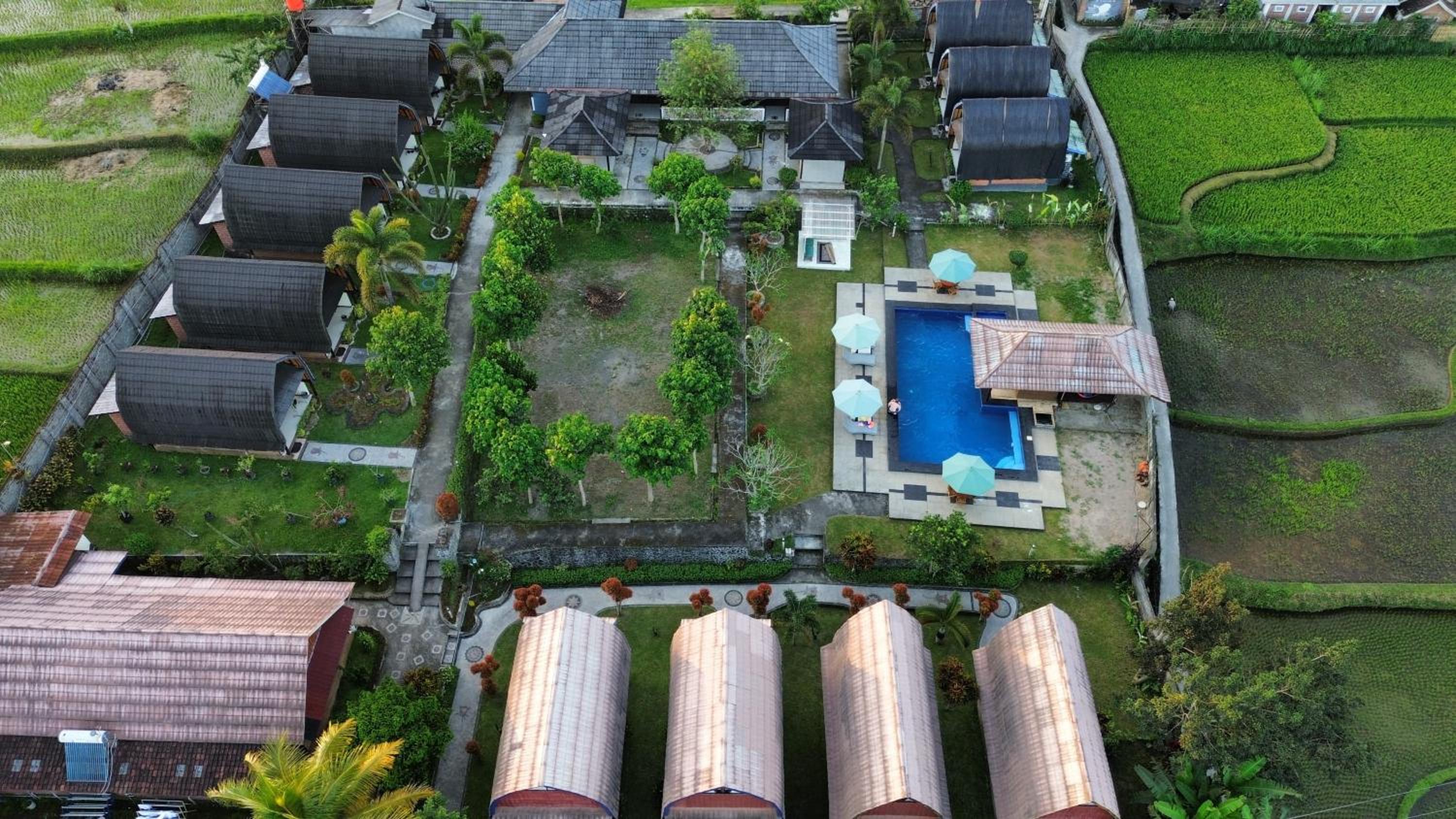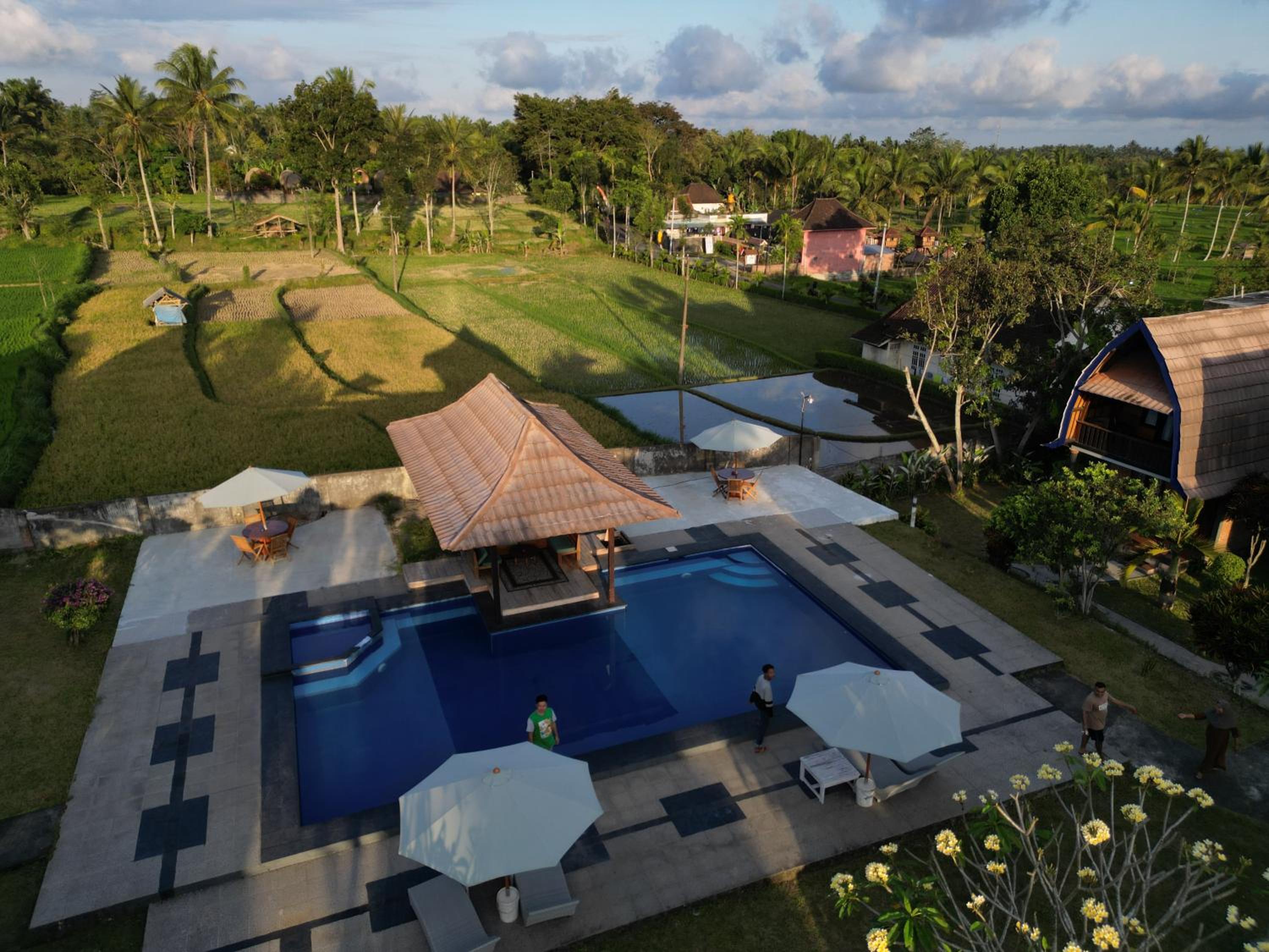 Heel leuk hotel met huisjes met een mooi onderhouden tuin ervoor. Er is een zwembad. De ontbijtzaal kijkt uit op de prachtige rijstvelden. Het ontbijt was heerlijk, erge lekkere ananaspannekoeken, vers fruit en vers geperst sinaasappelsap. En ook nog een warme croissant..ze willen je nog echt verwennen hier. Er zit een restaurant tegenover waar alles lekker is , dat is ook van hun..de bedden lagen goed en de kamers zijn schoon. Verwacht geen 5 sterren maar een knus familie hotel waar ze alles voor je willen regelen.